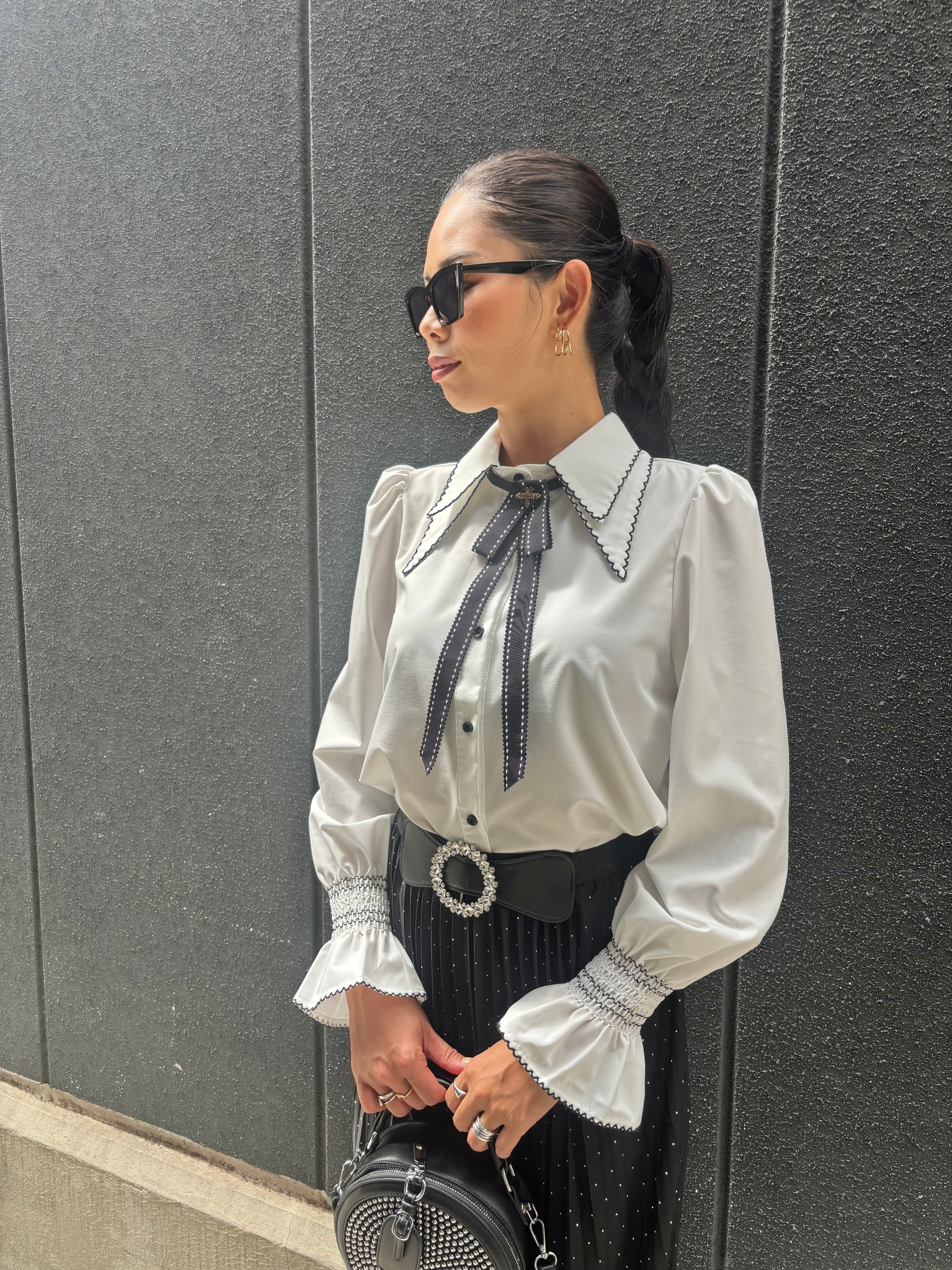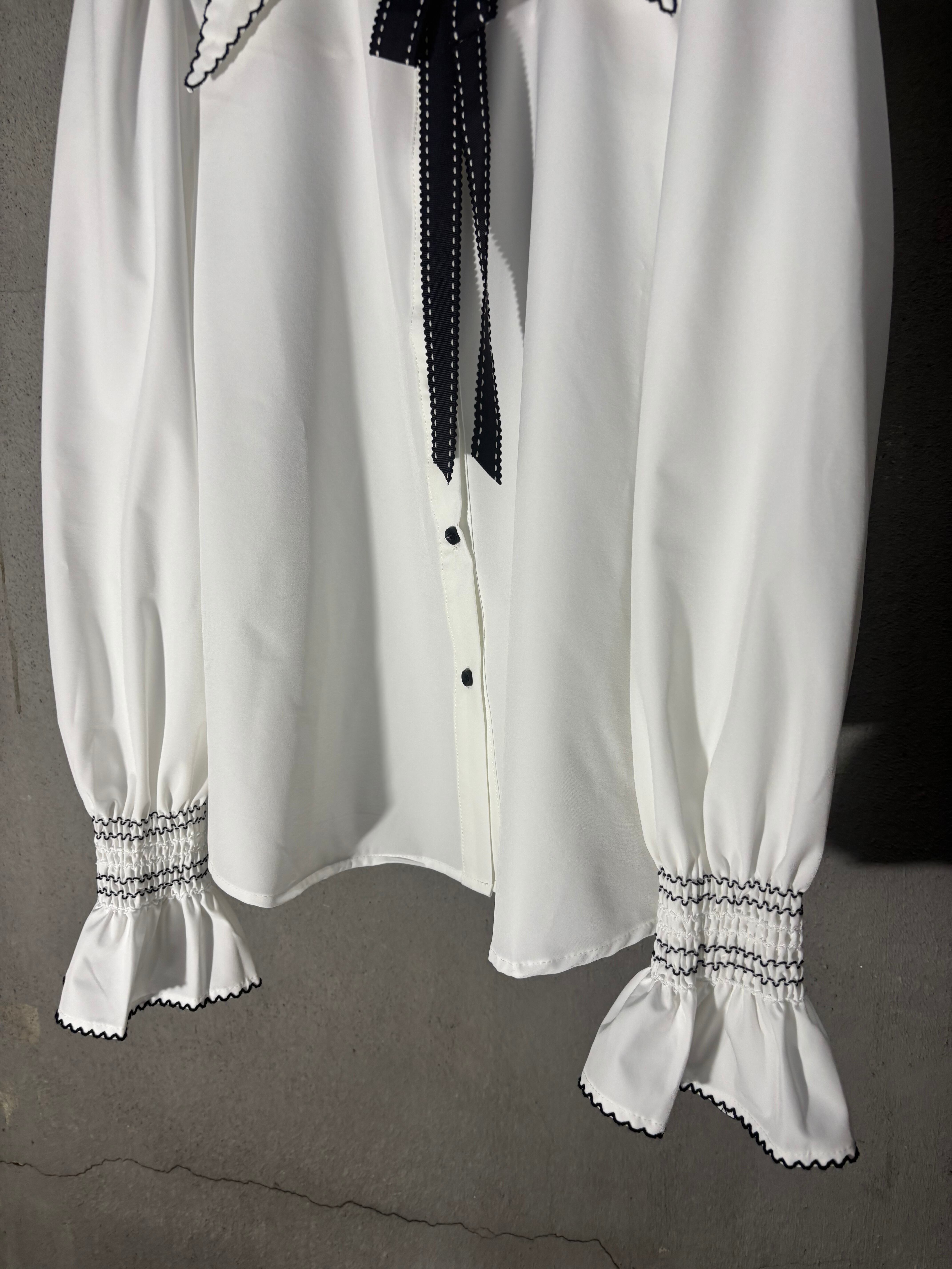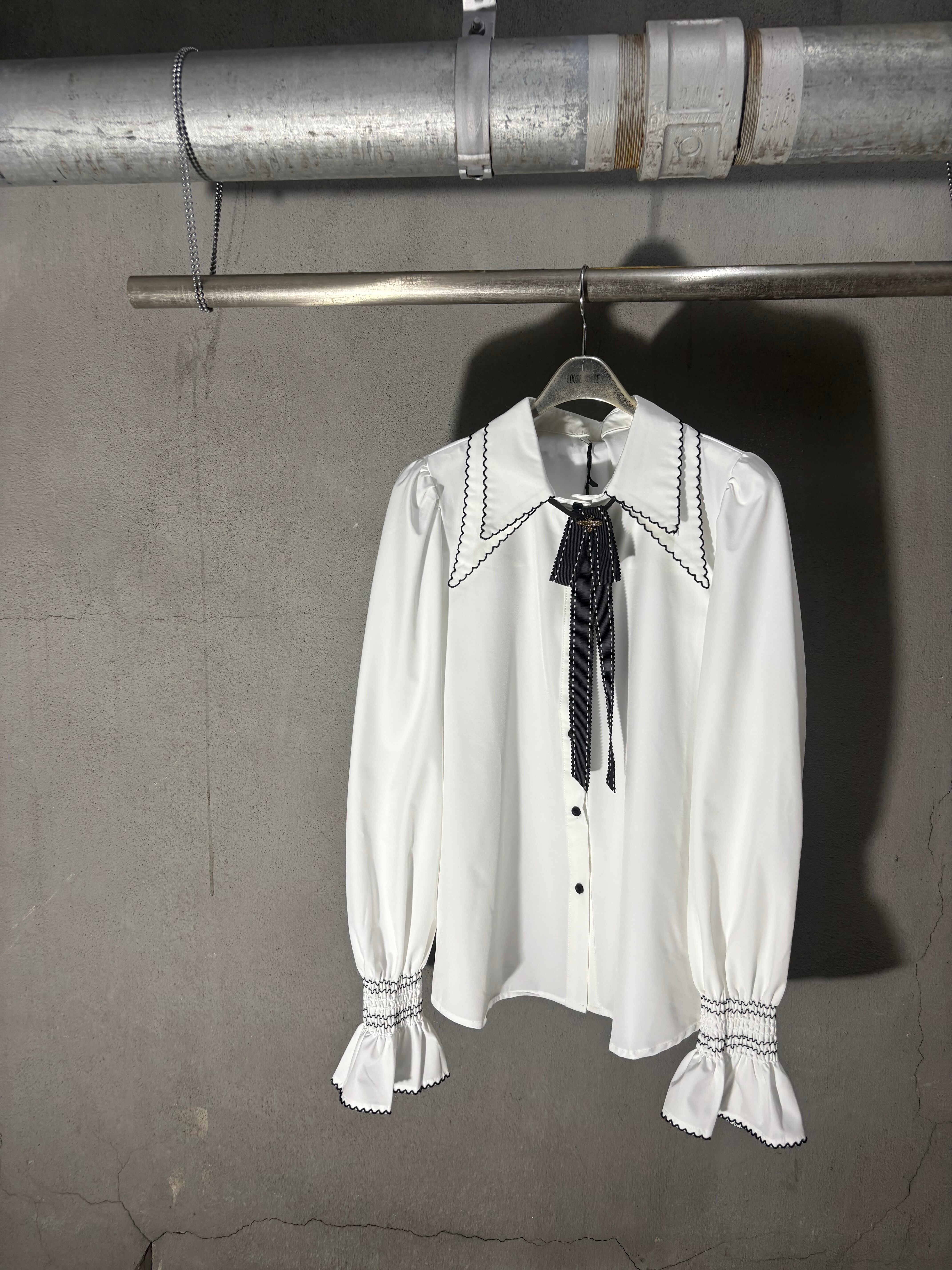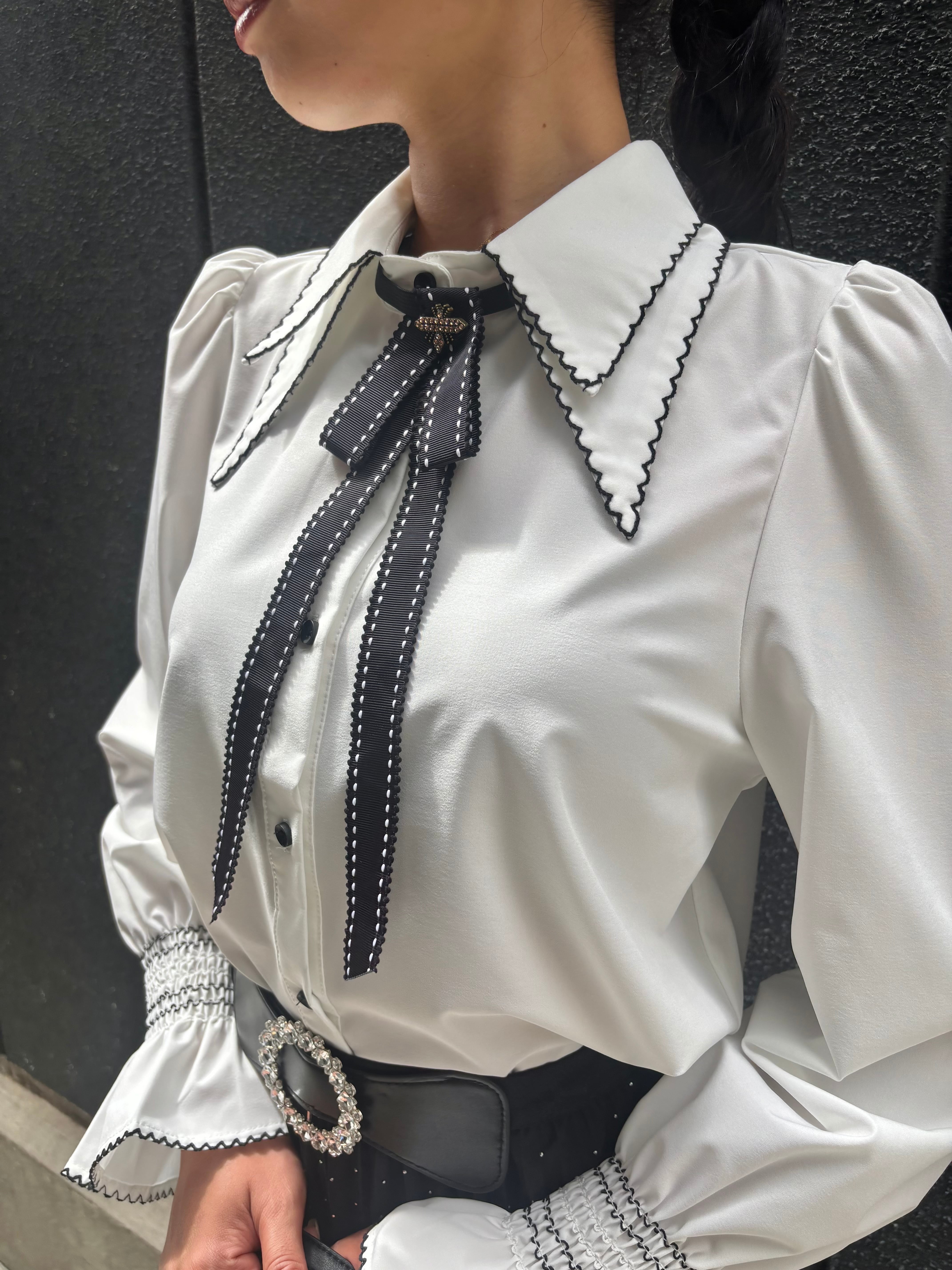 black stitch × ribbon tie design white shirt シャツ ブラウス ステッチ リボン タイ 白シャツ