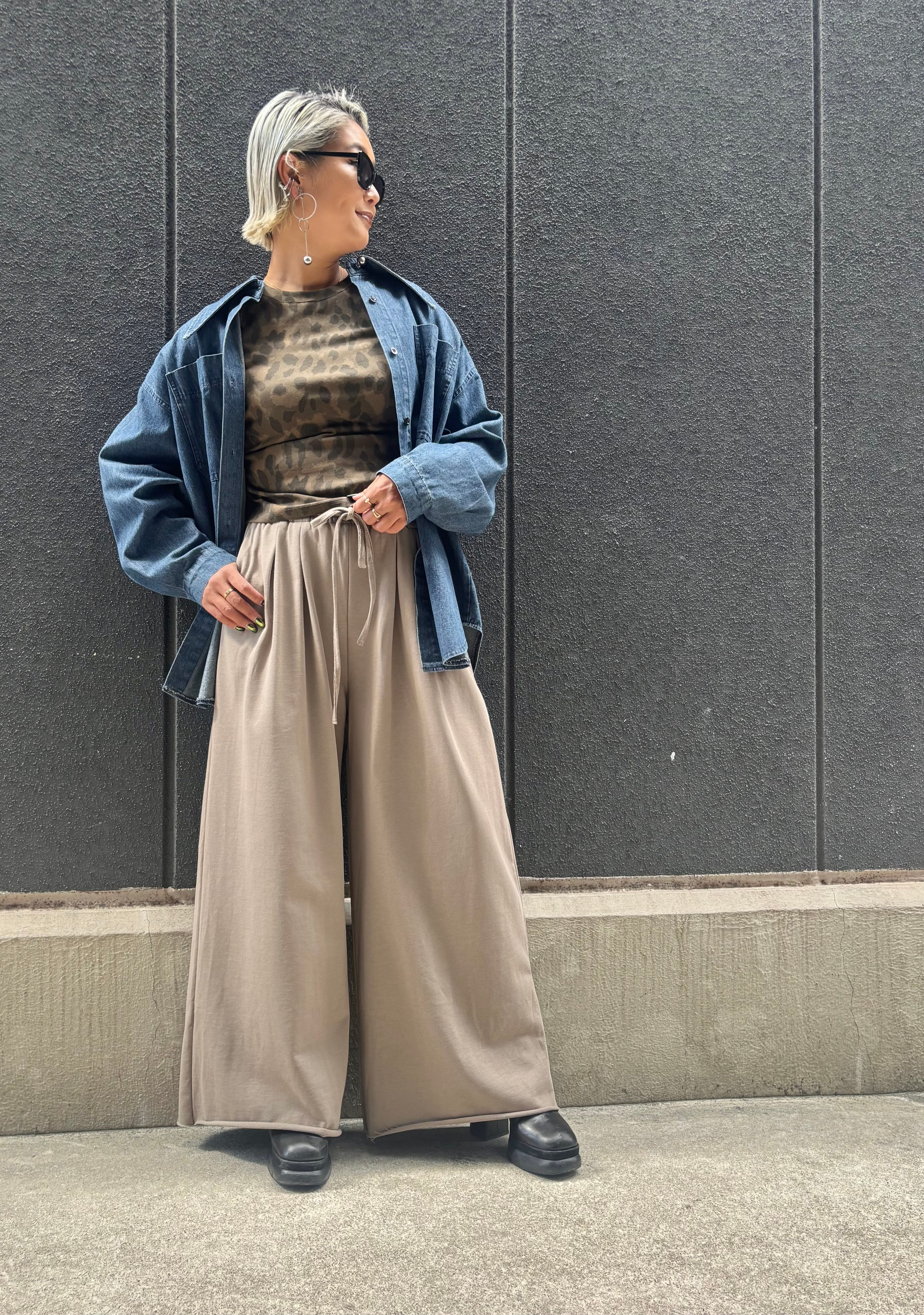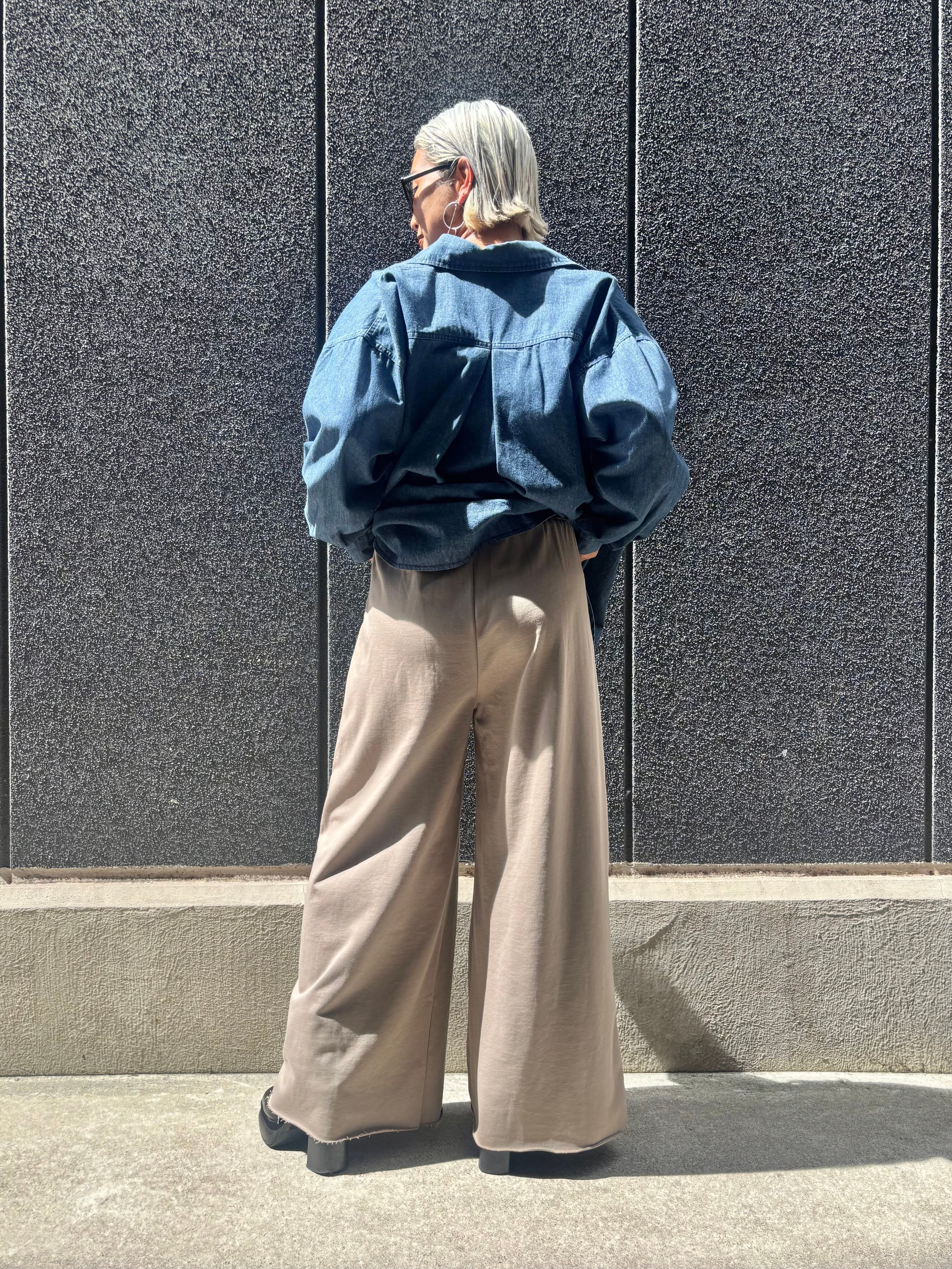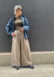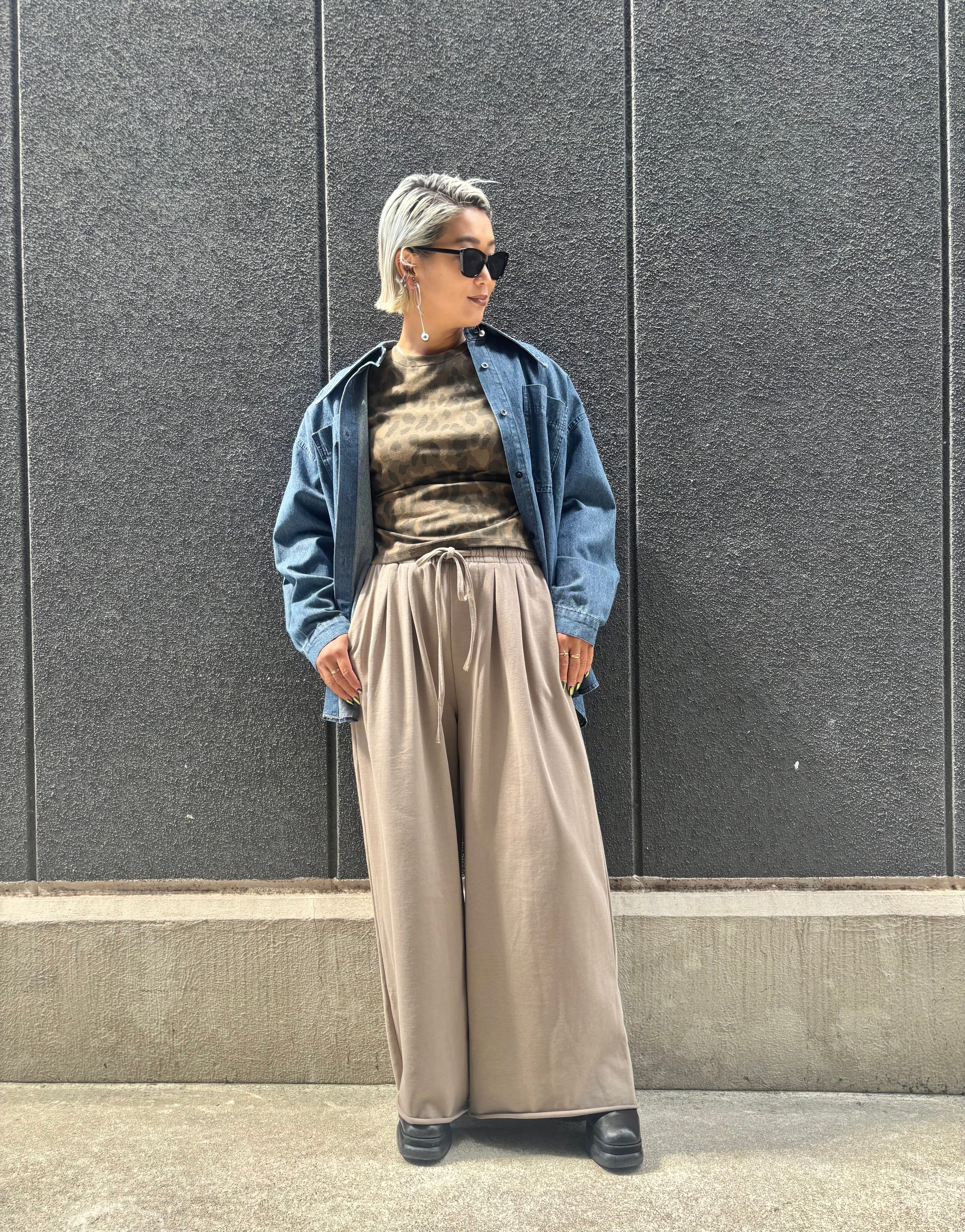 ミニ丈トップスとの相性も抜群で、コーディネートの幅を広げてくれる一枚です。