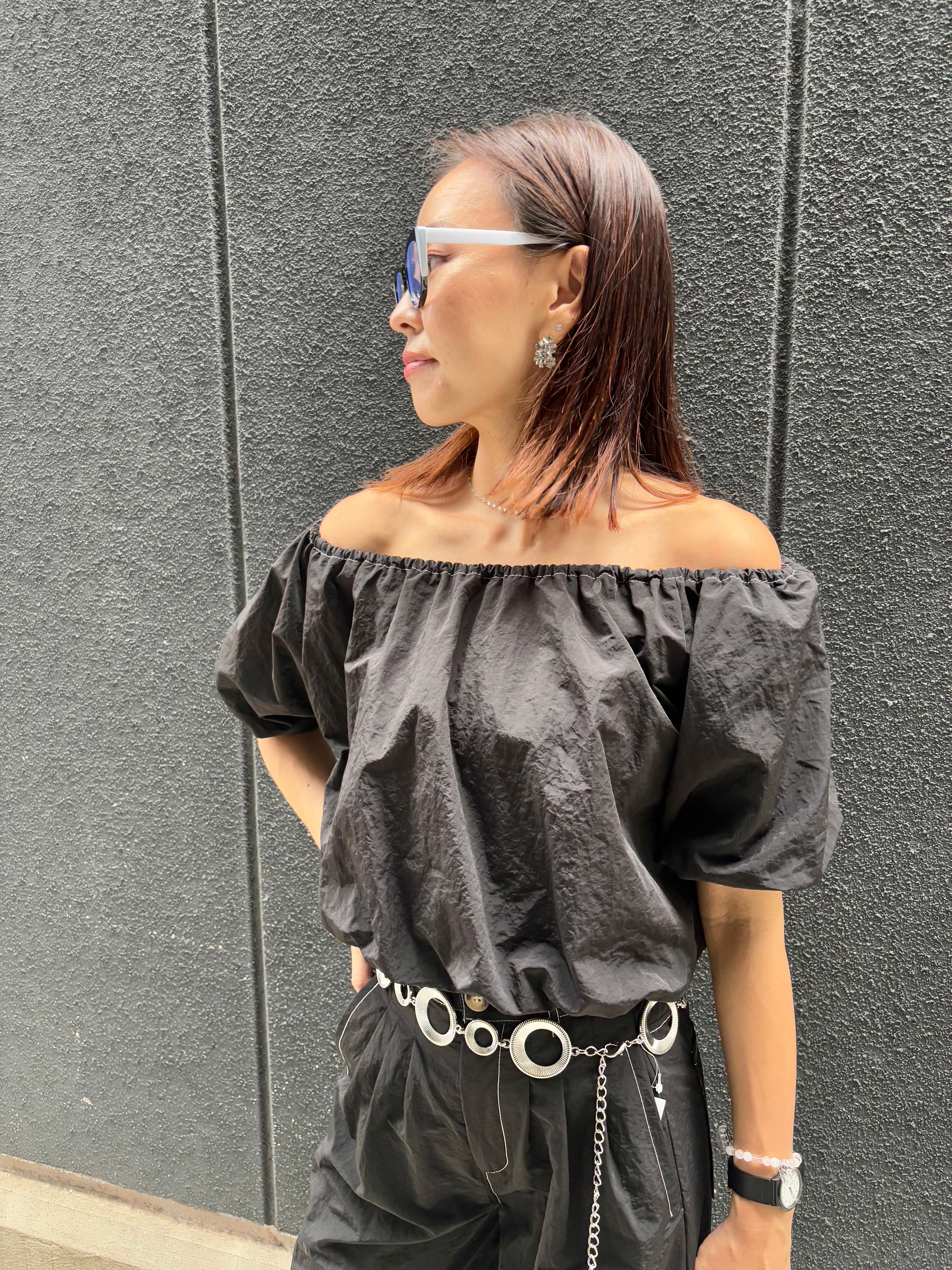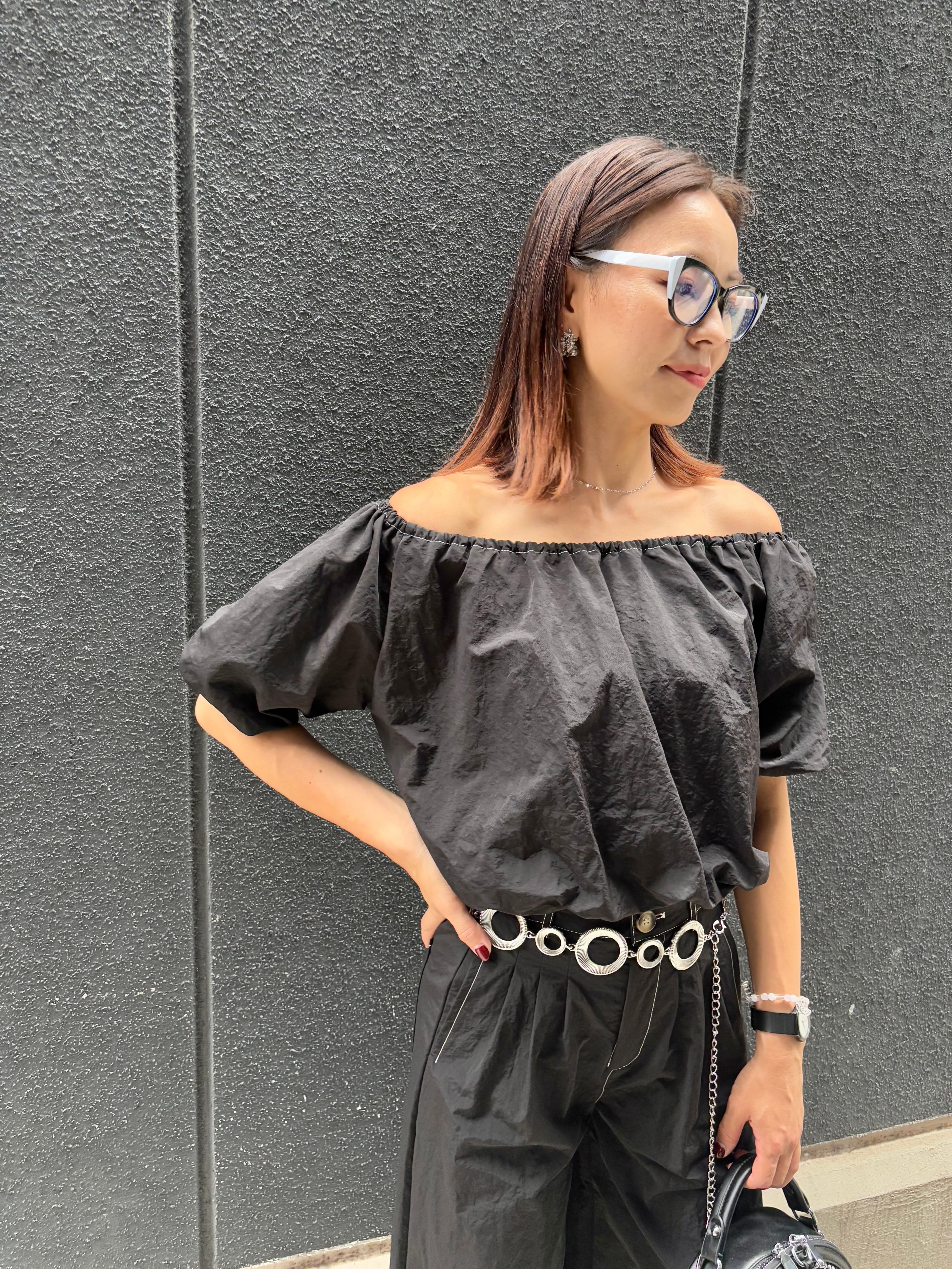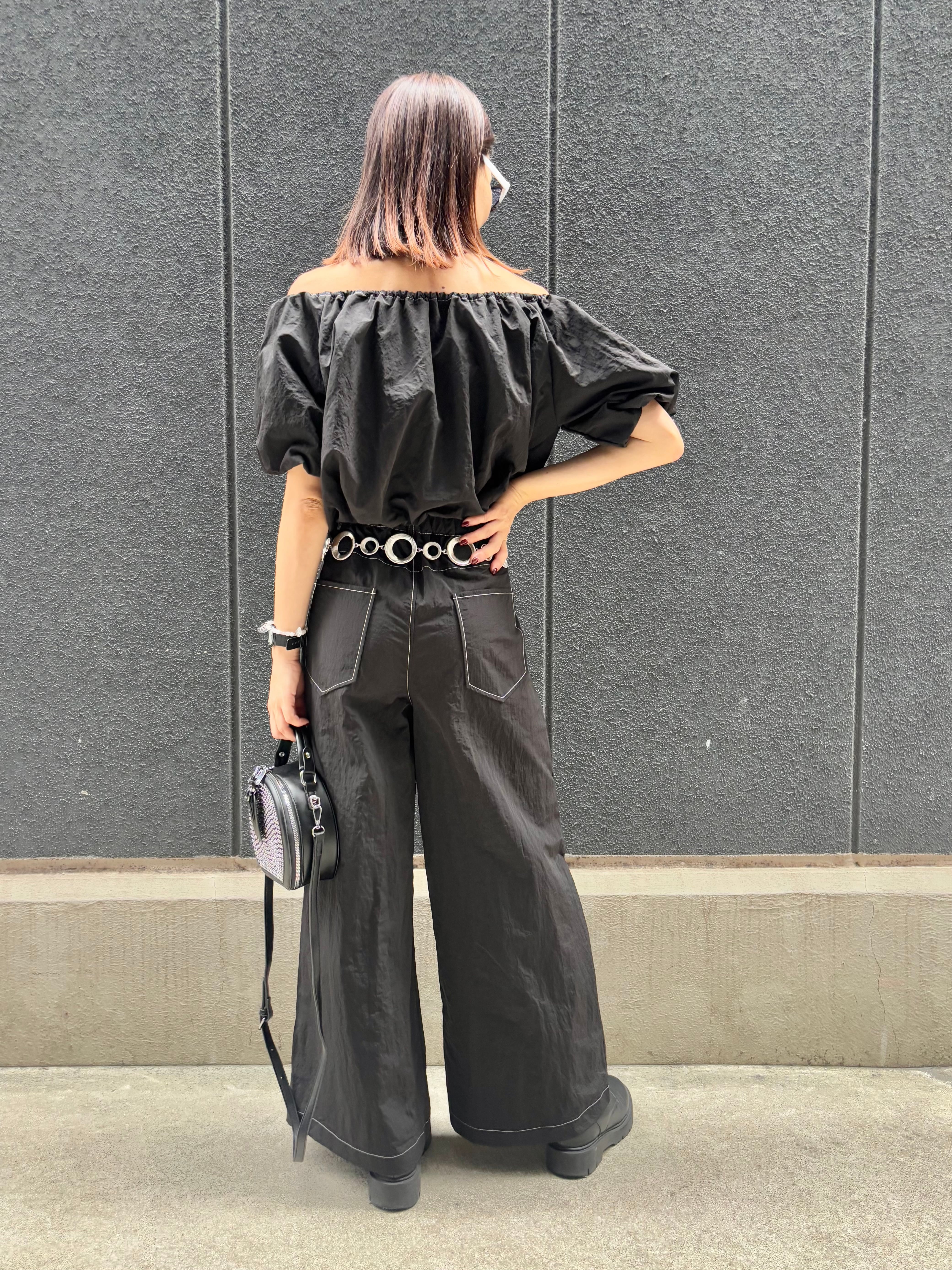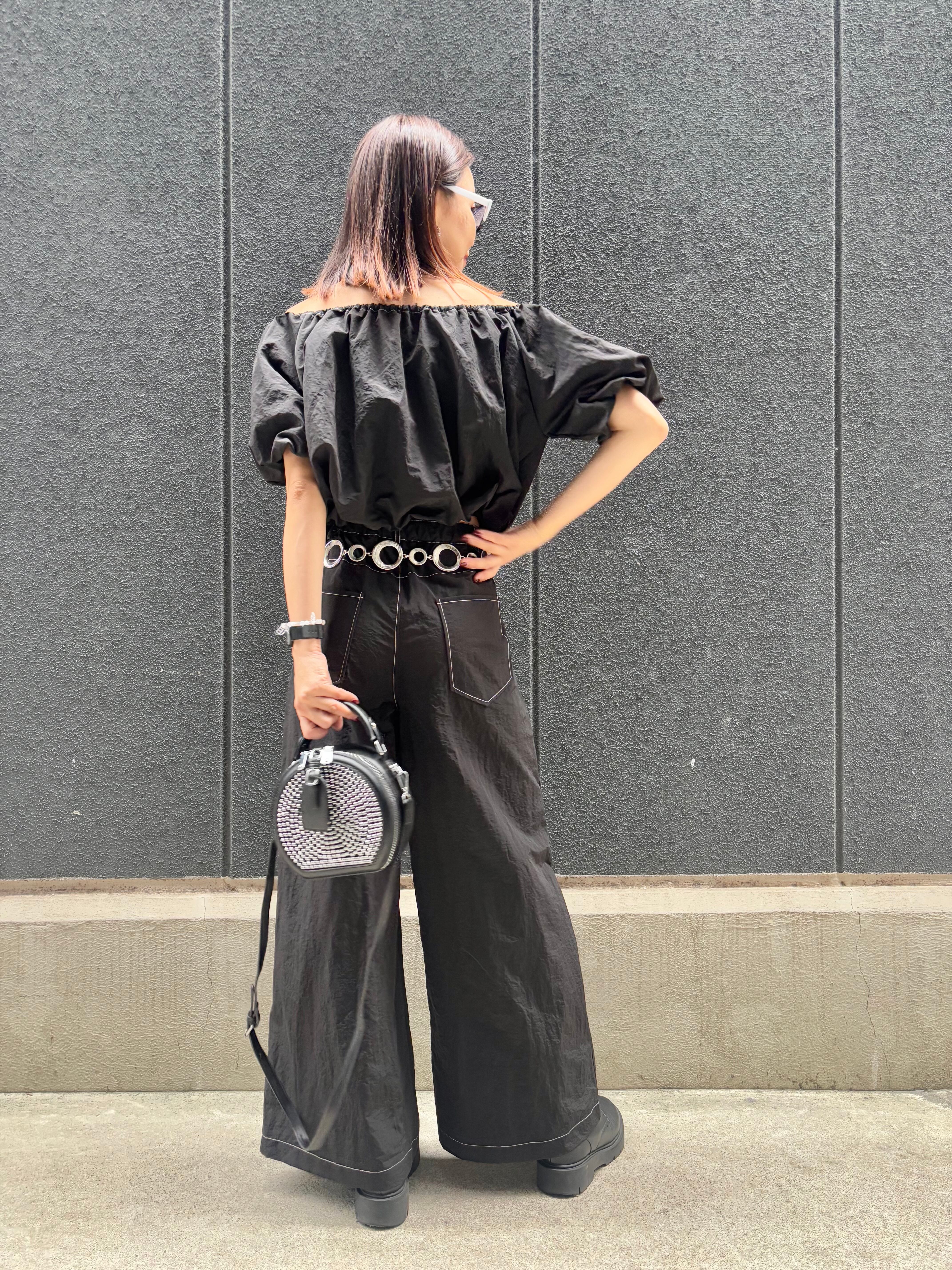 off shoulder balloon tops × wide pants 2P set up セットアップ 2点セット トップス オフショルダー バルーン パンツ ワイドパンツ ブラック 黒 着回し