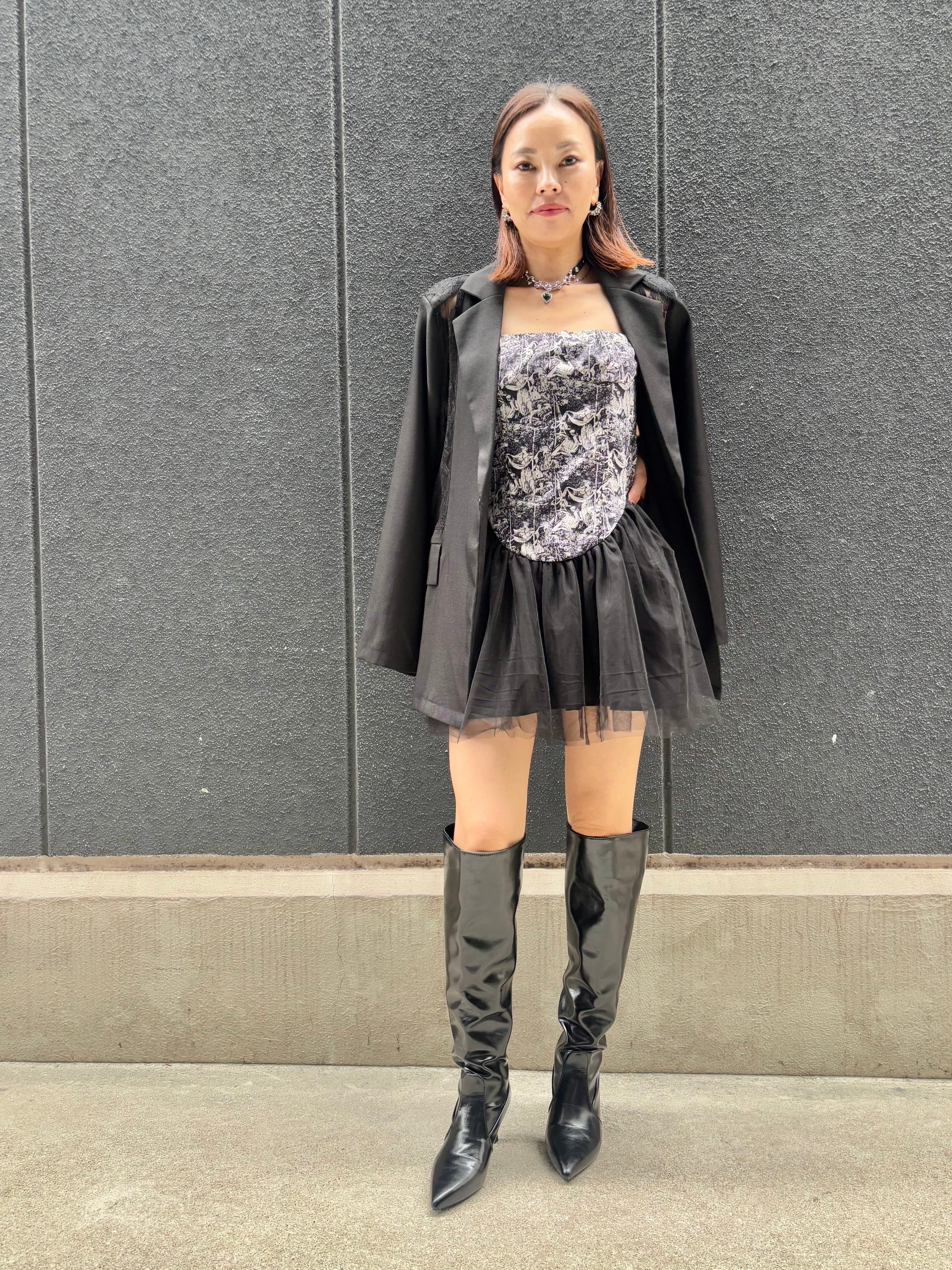 アクセサリーやシューズの合わせ方次第で、ドレッシーにもコーディネート可能。