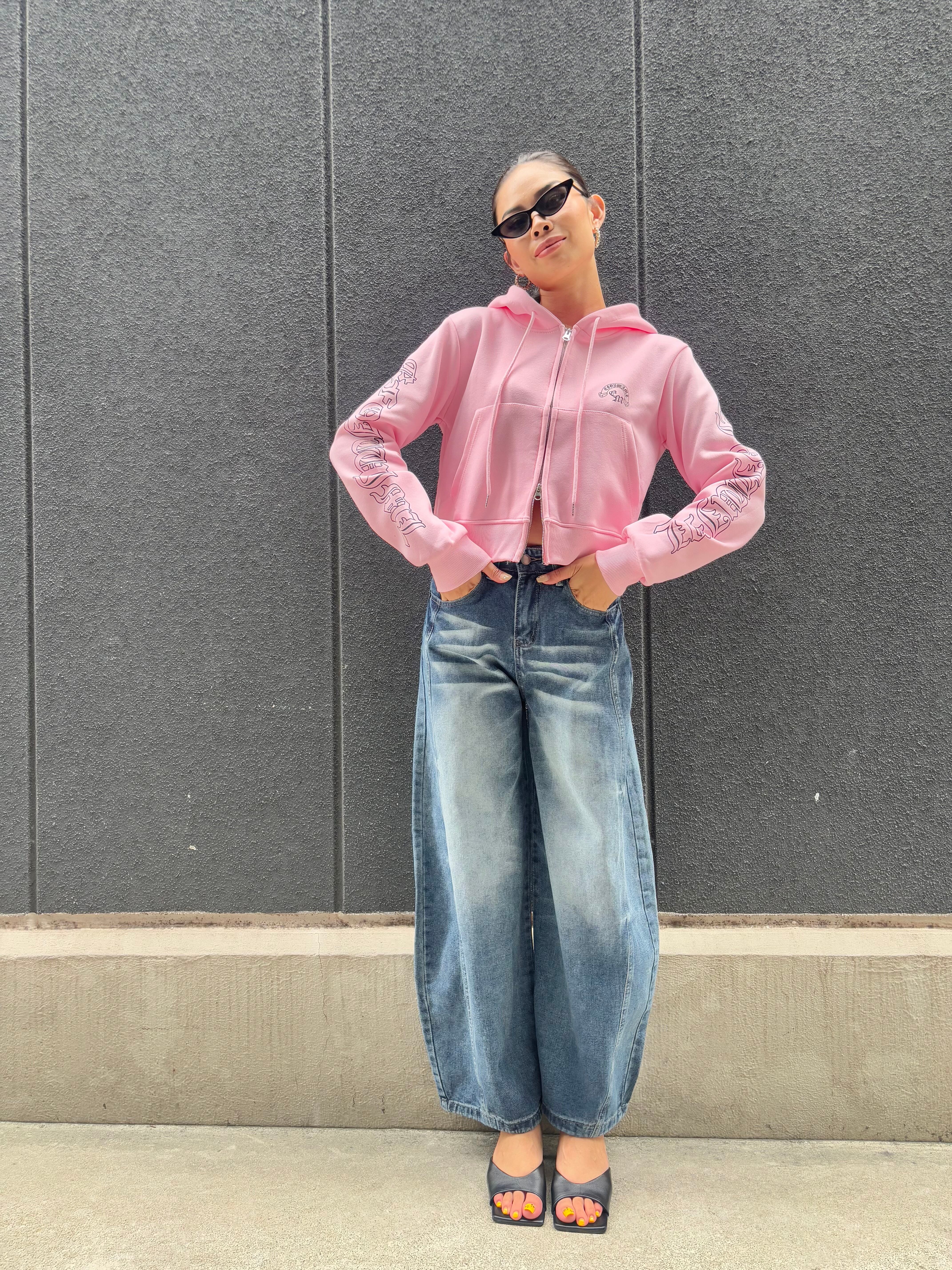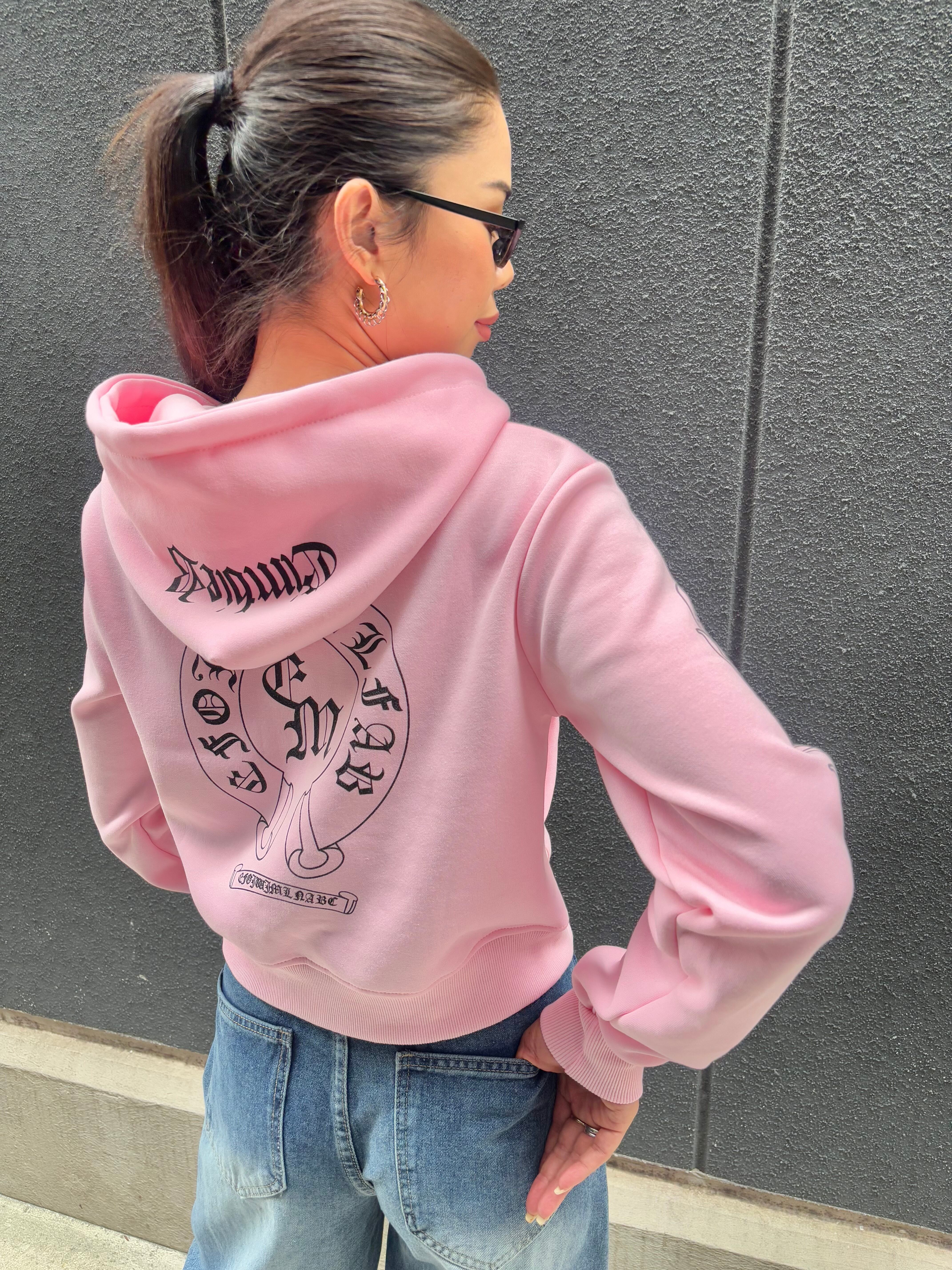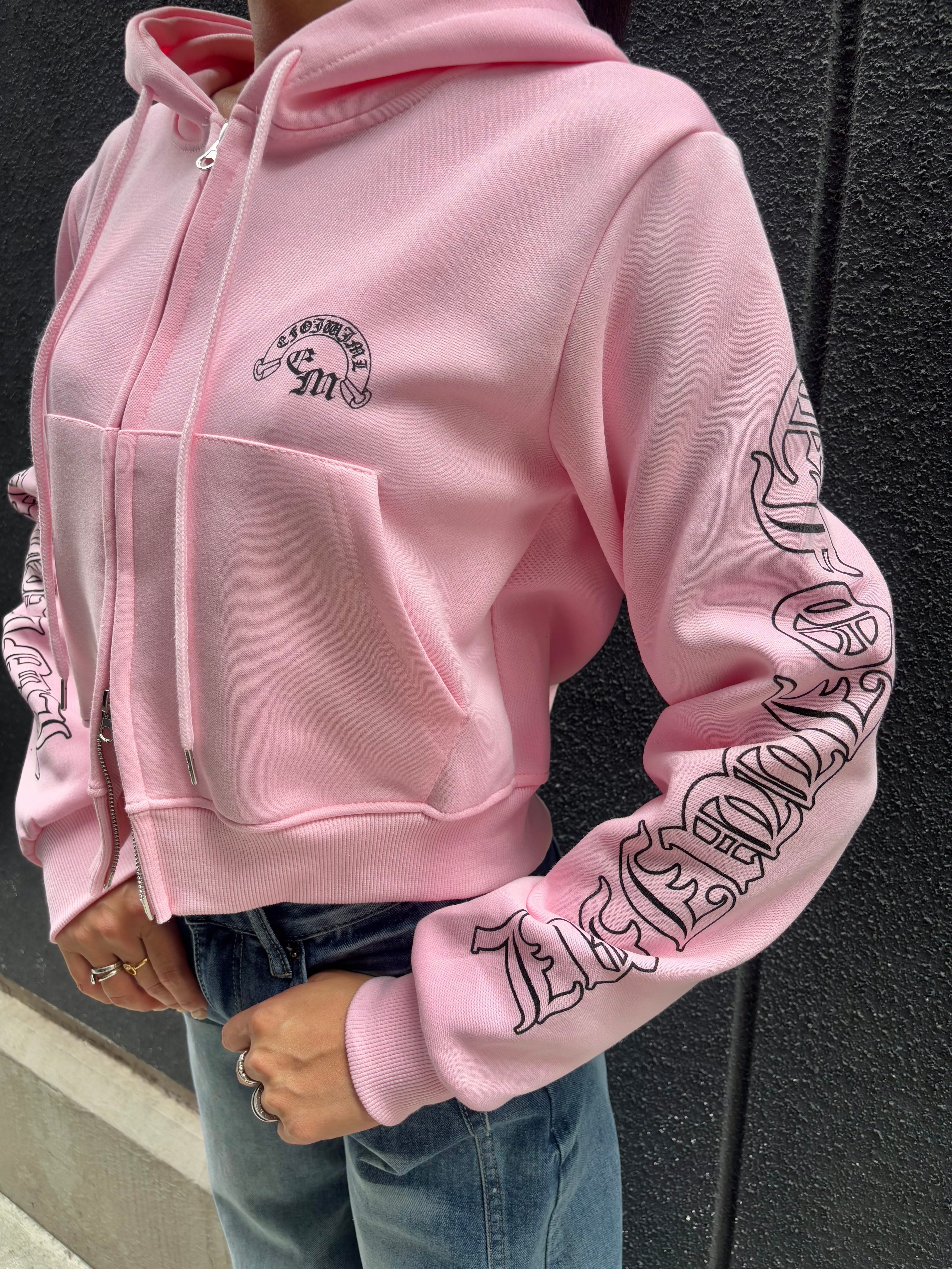 【再入荷】text print hoodie zip up jacket ジャケット 羽織り スウェット ピンク プリント フーディー フード ショート丈 ジップアップ