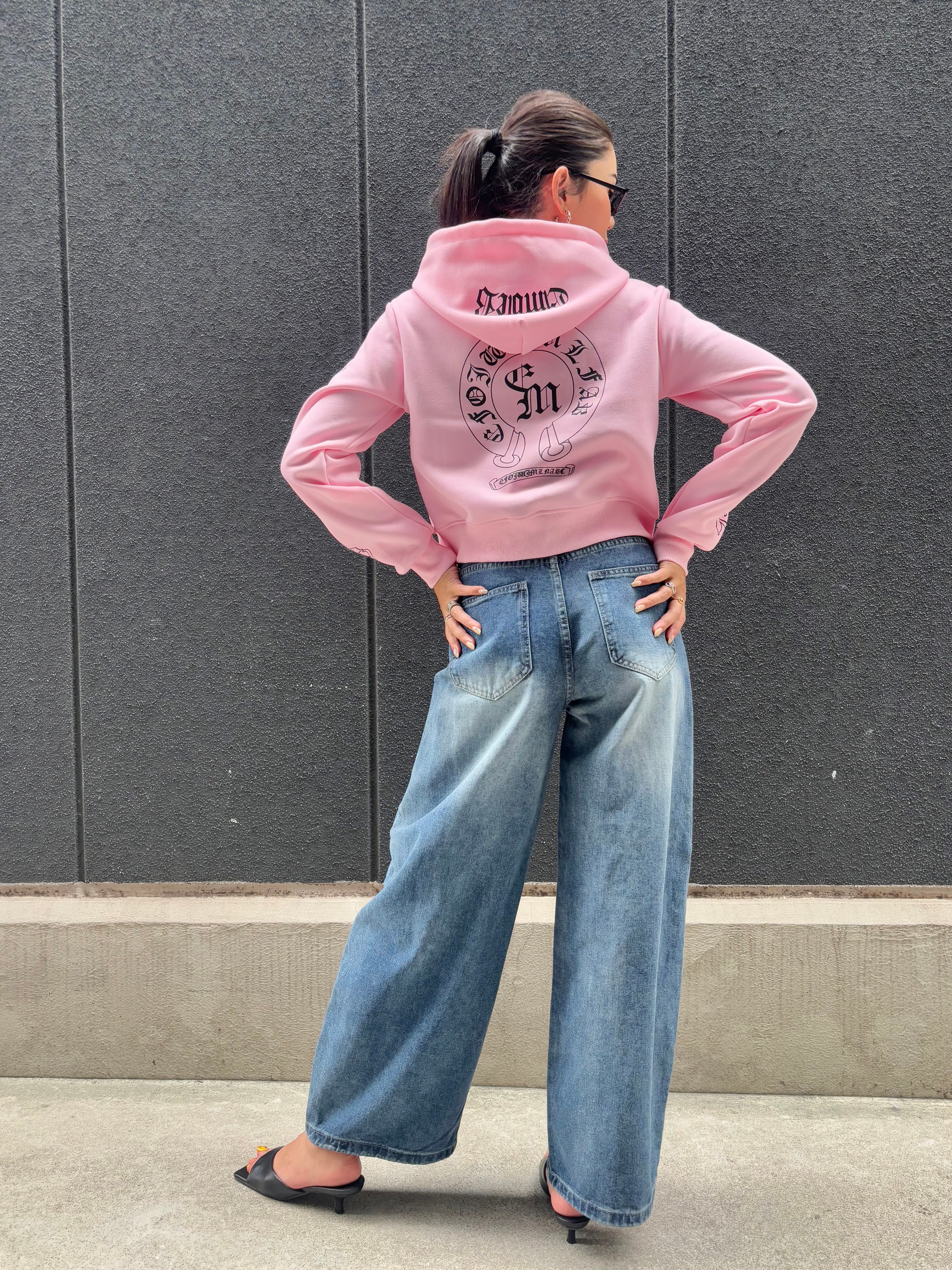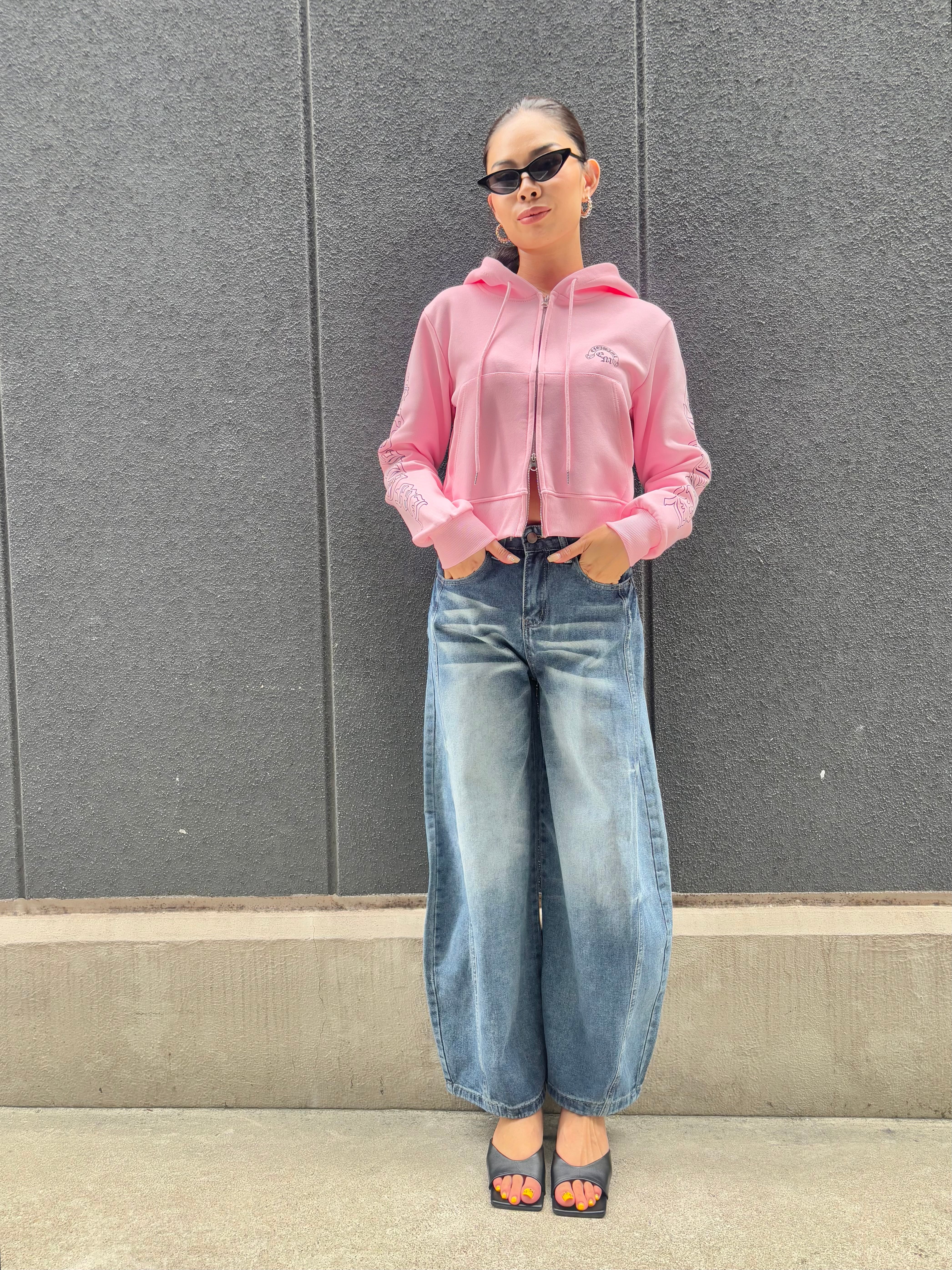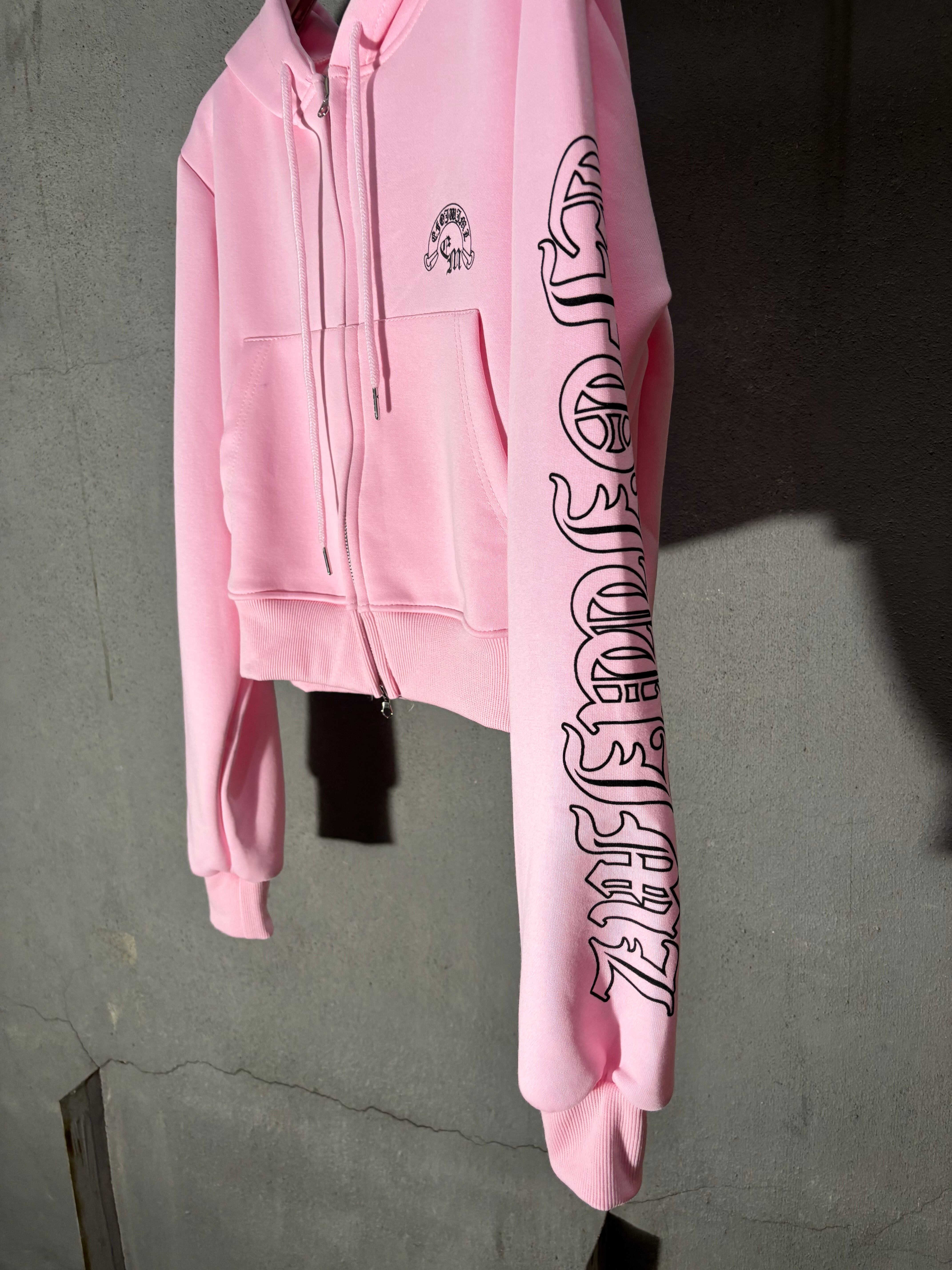 【再入荷】text print hoodie zip up jacket ジャケット 羽織り スウェット ピンク プリント フーディー フード ショート丈 ジップアップ