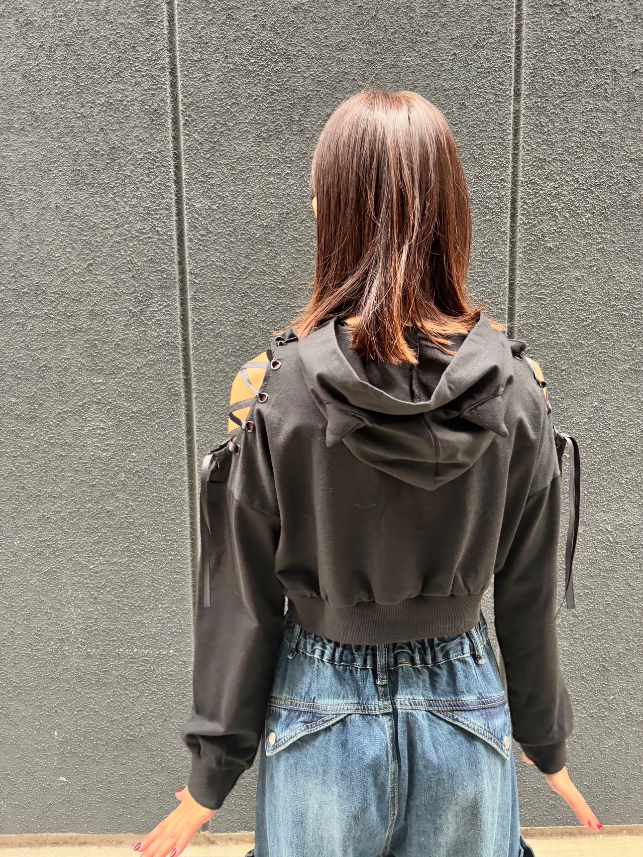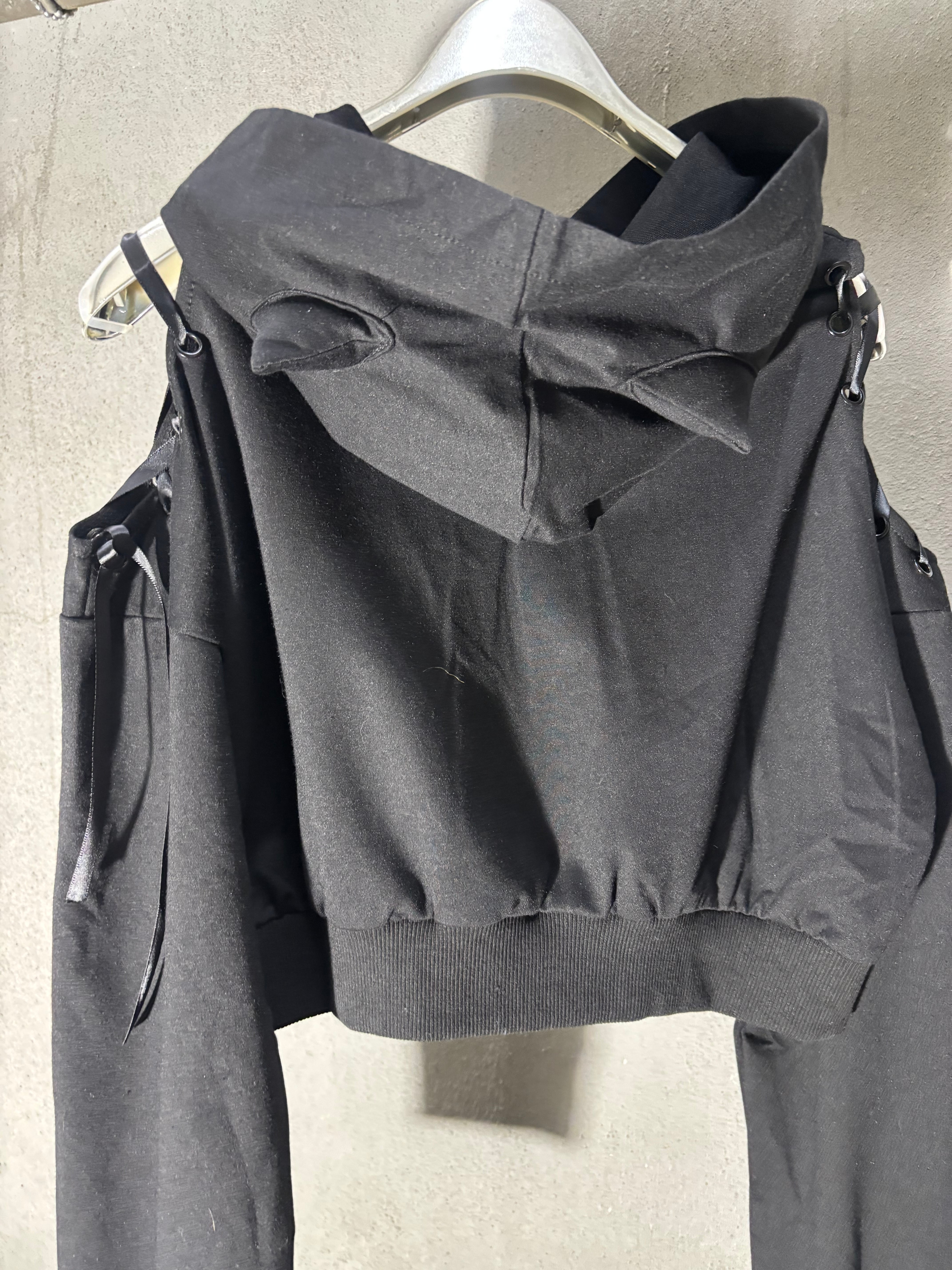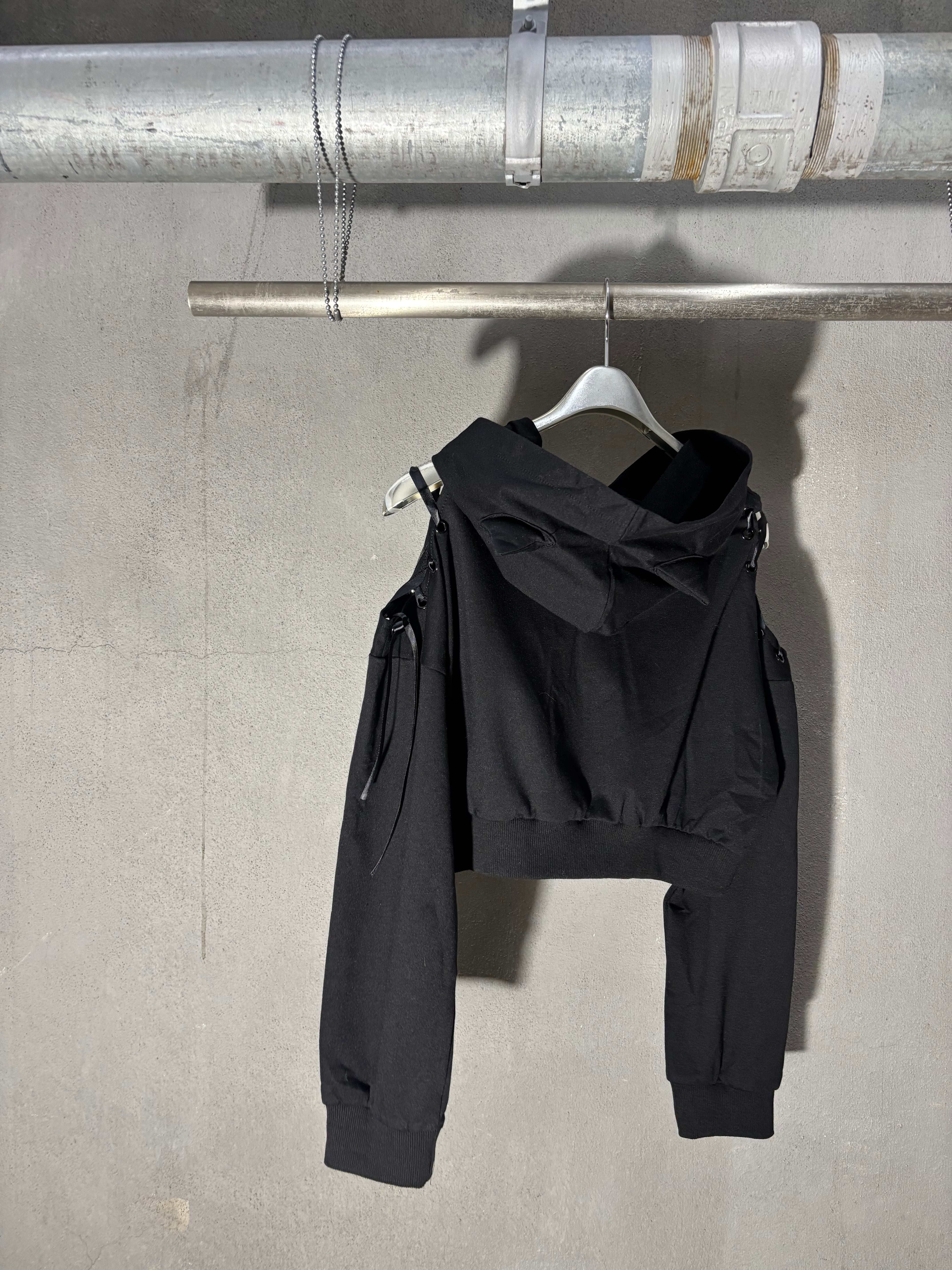 spindle open shoulder × cat ear design hoodie pullover トップス プルオーバー 肩開き フーディー フード 猫耳 ショート丈 スピンドル