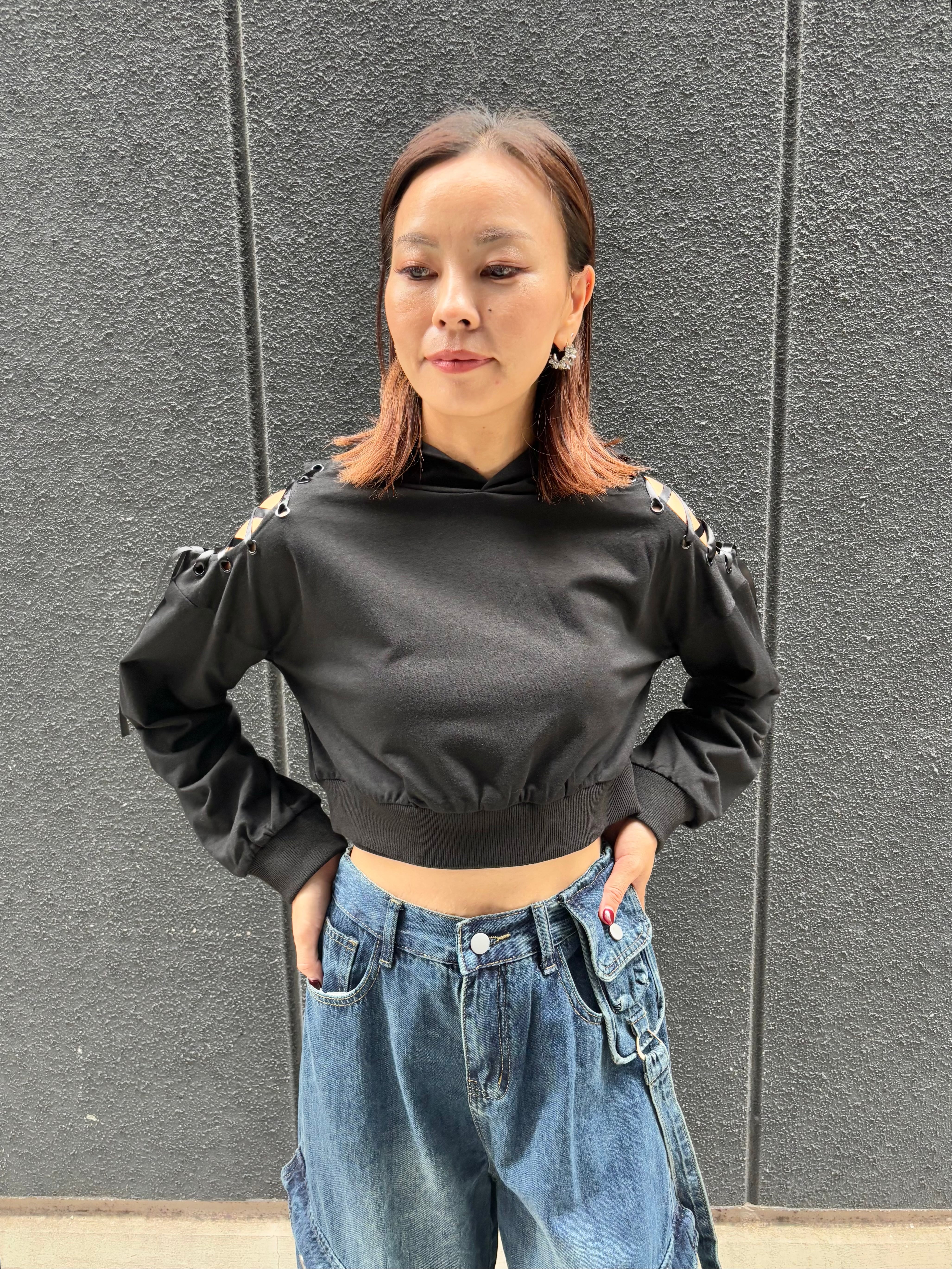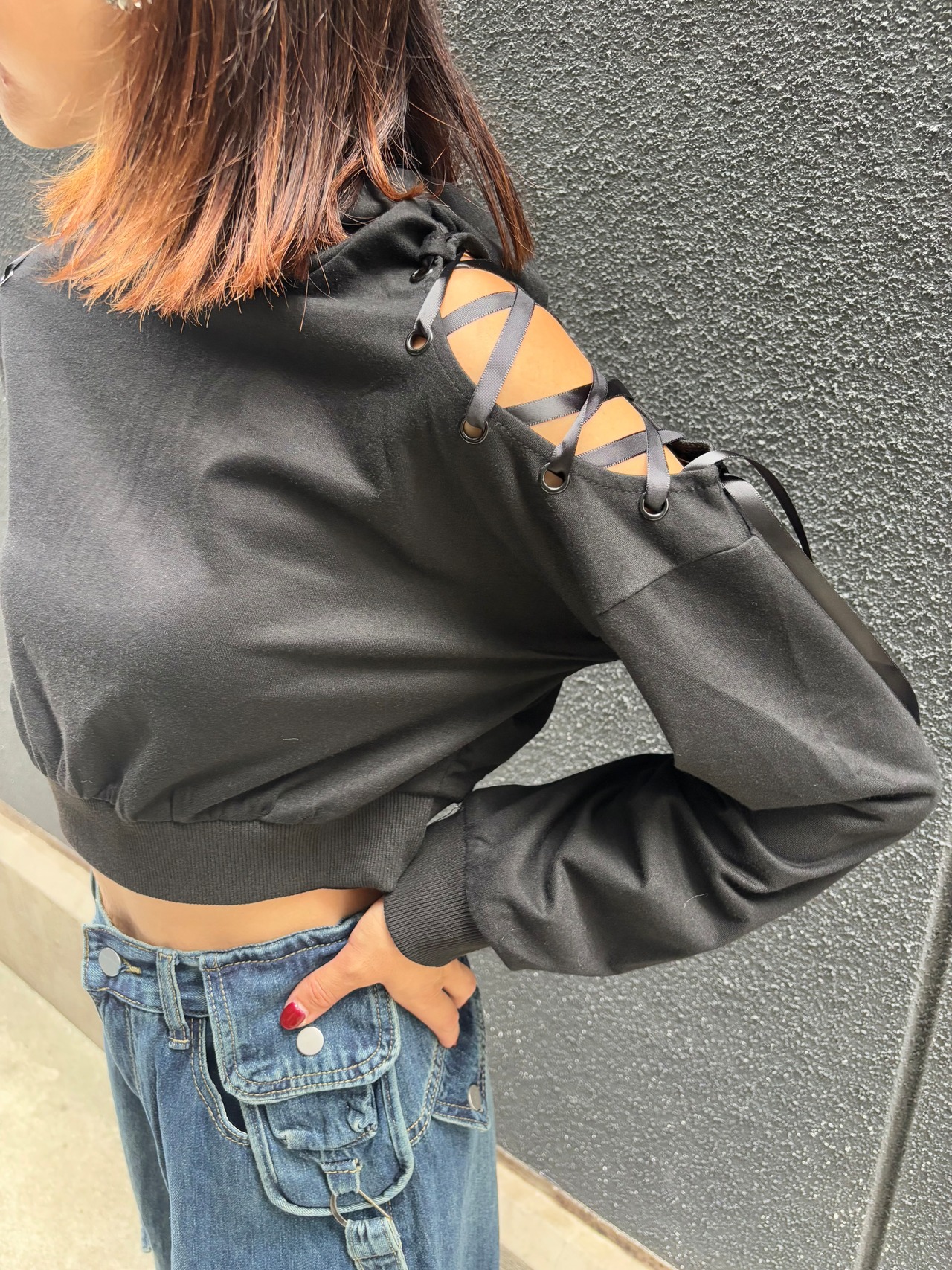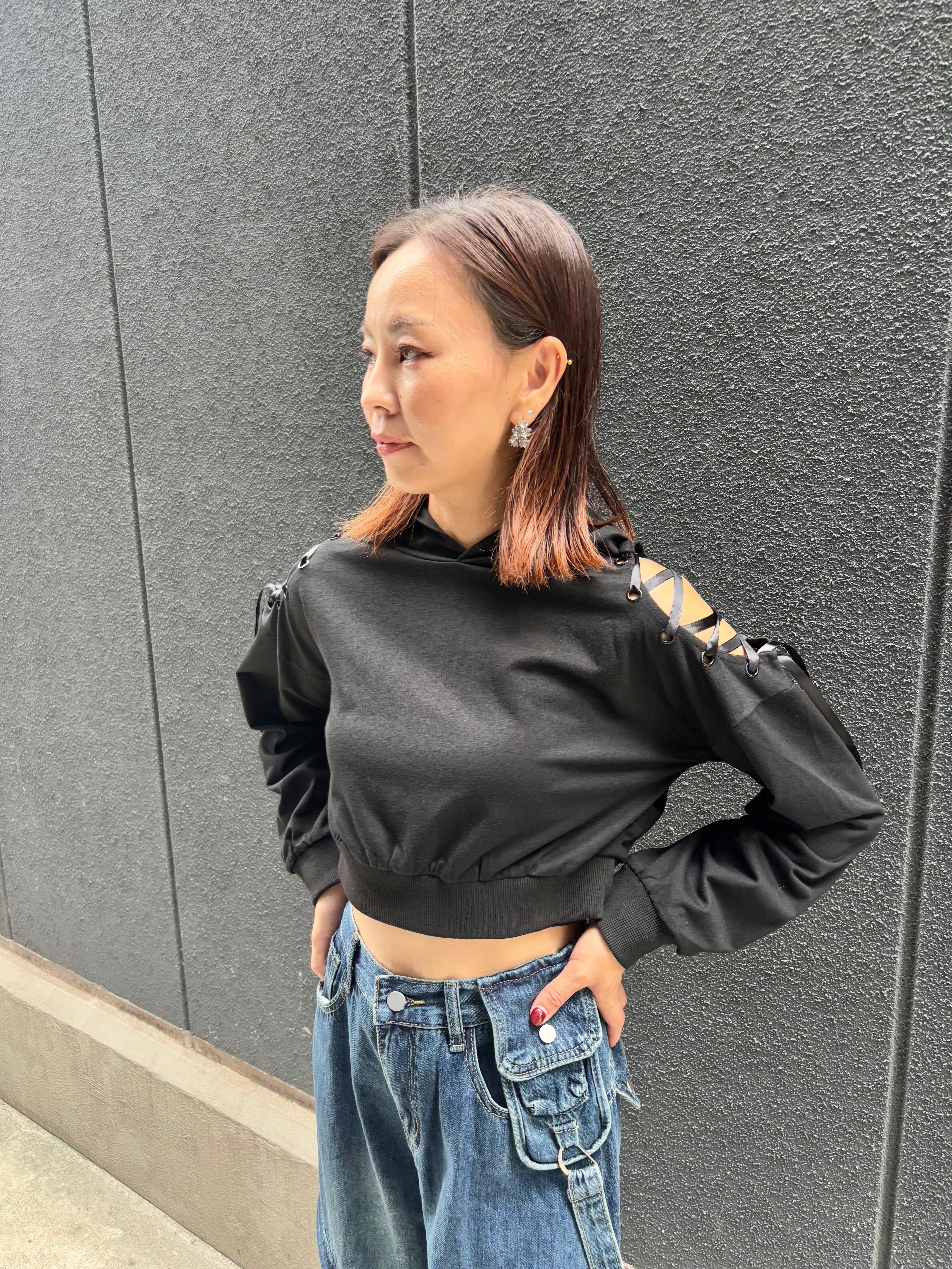 spindle open shoulder × cat ear design hoodie pullover トップス プルオーバー 肩開き フーディー フード 猫耳 ショート丈 スピンドル