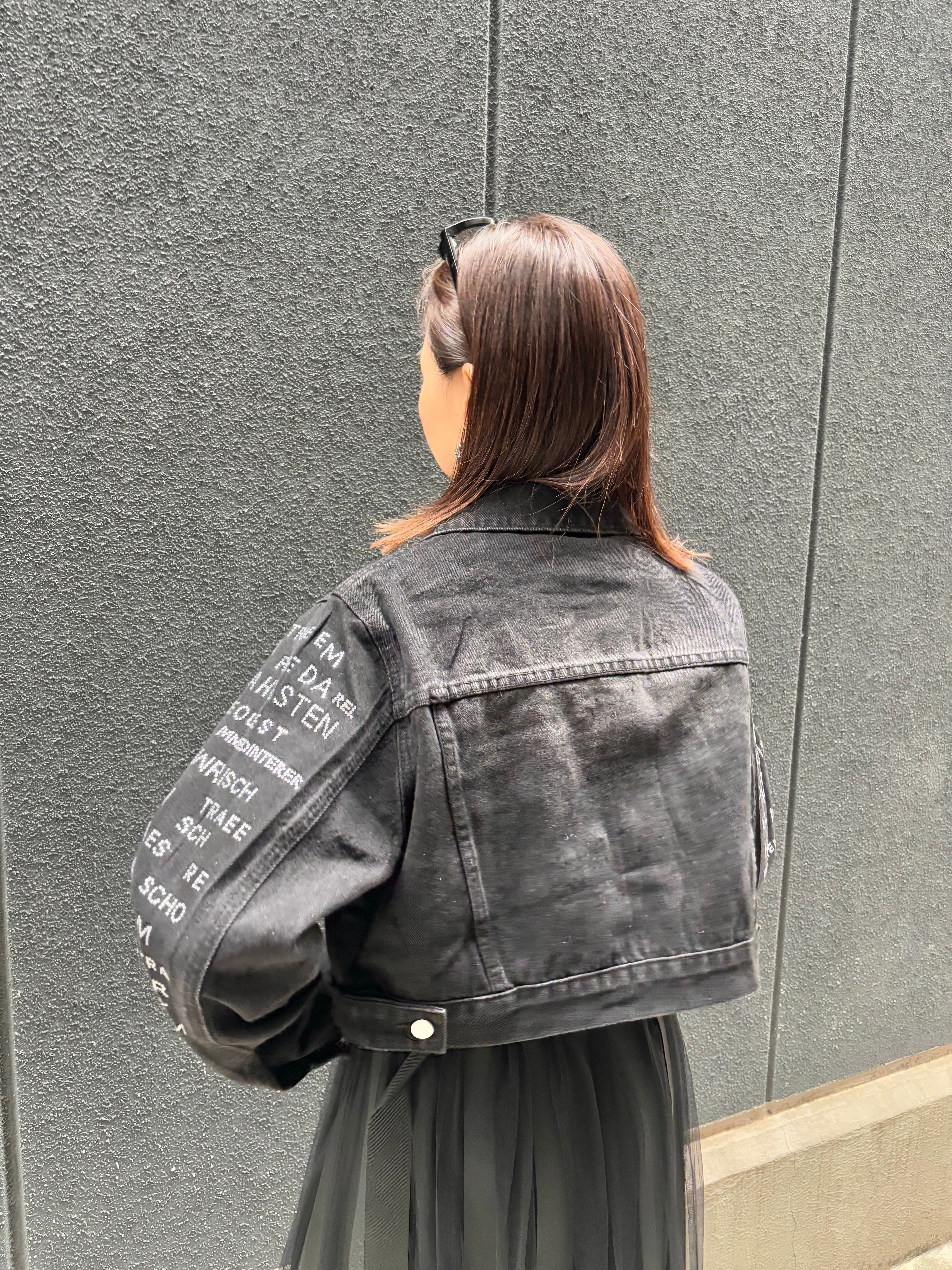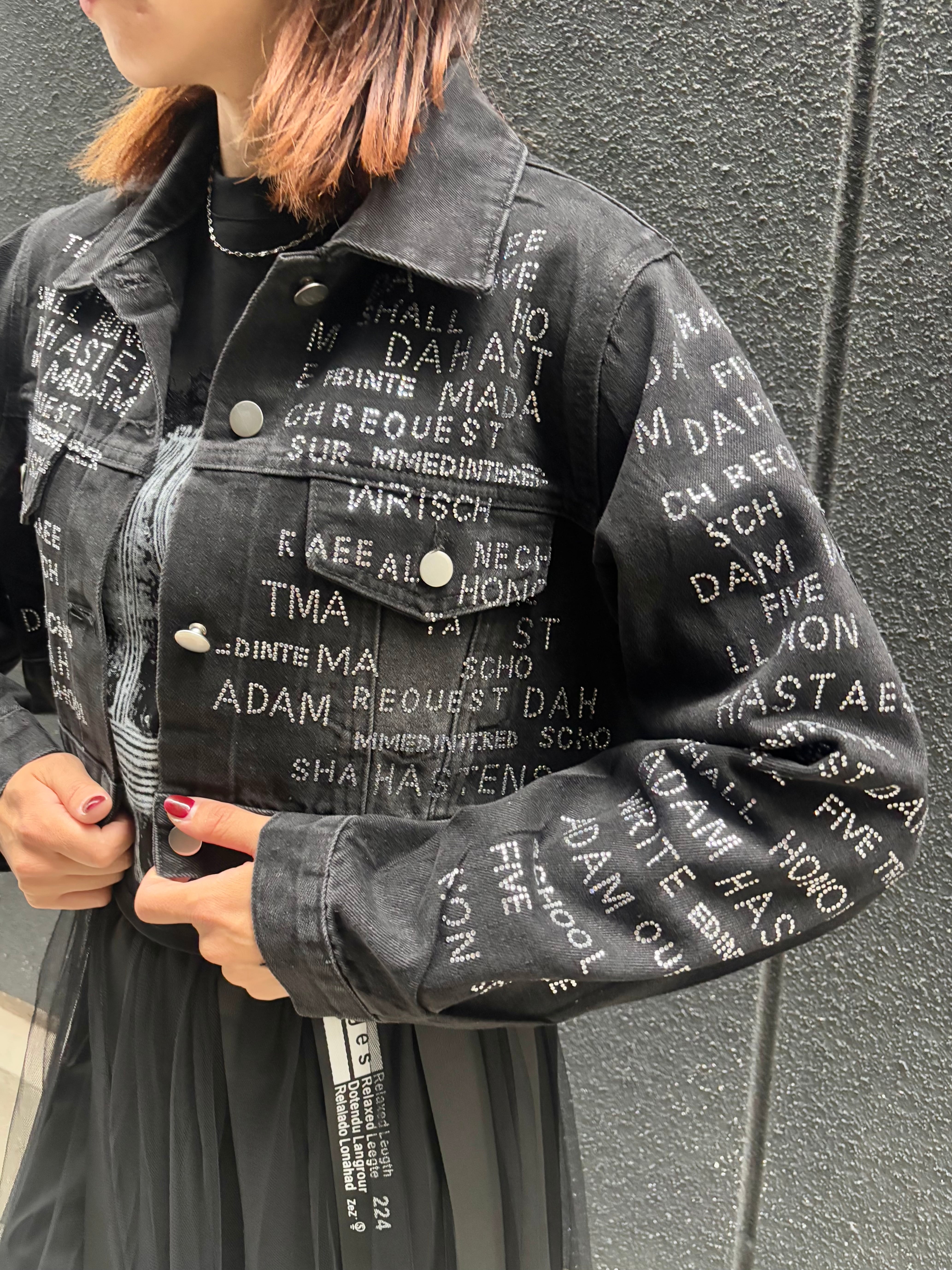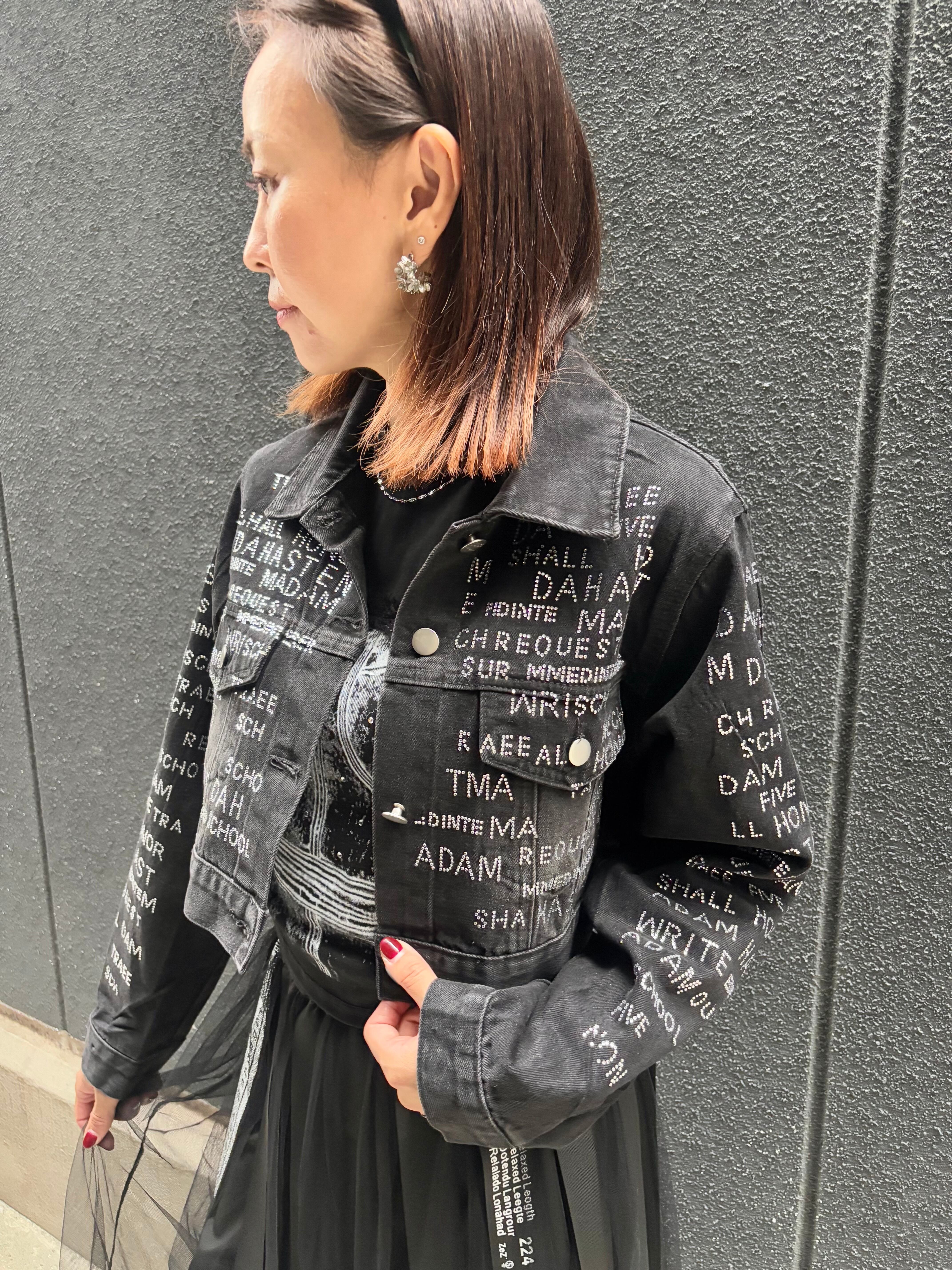 stone text design black denim jacket ジャケット デニム ブラックデニム ストーン ハピス テキスト