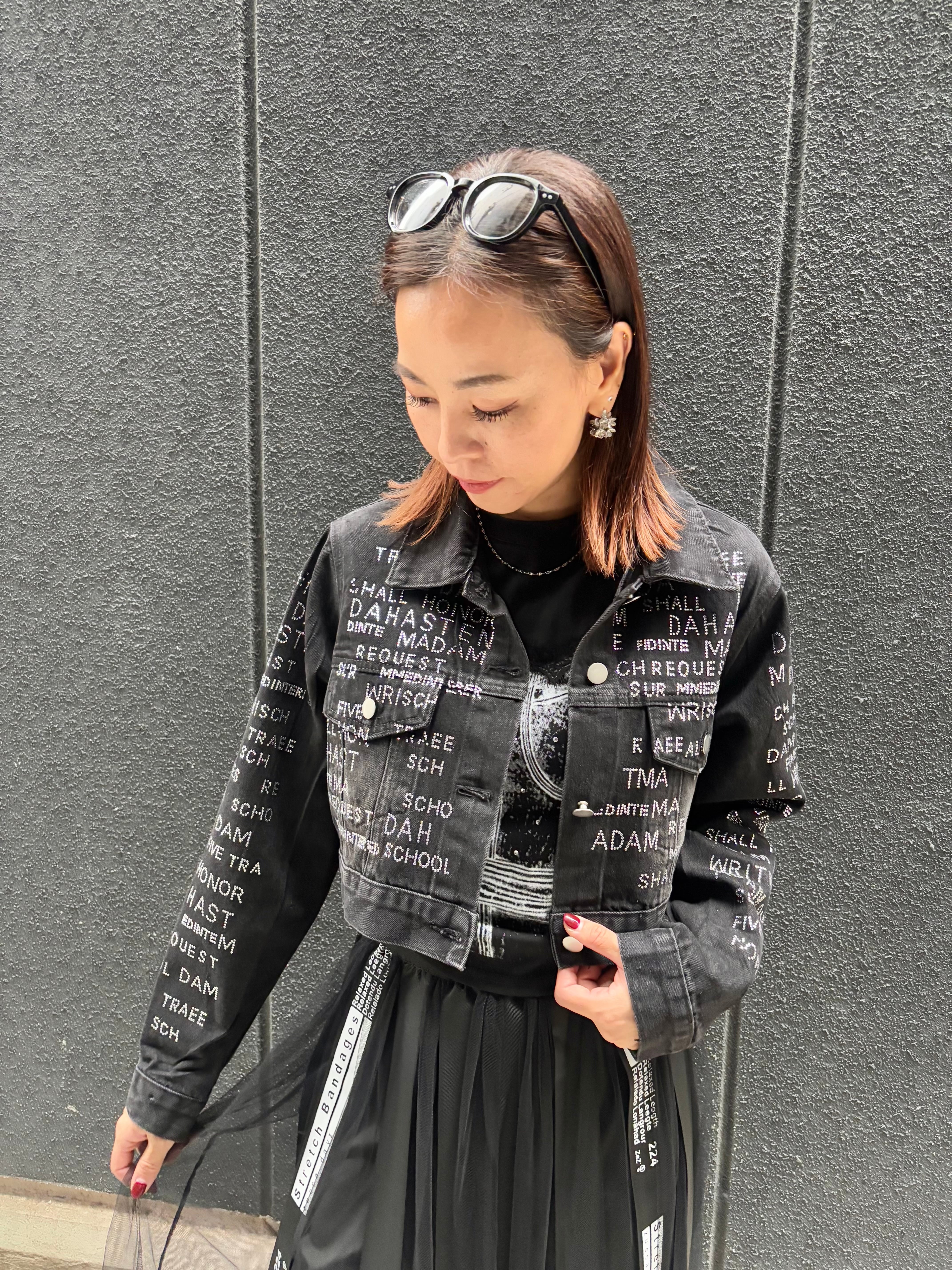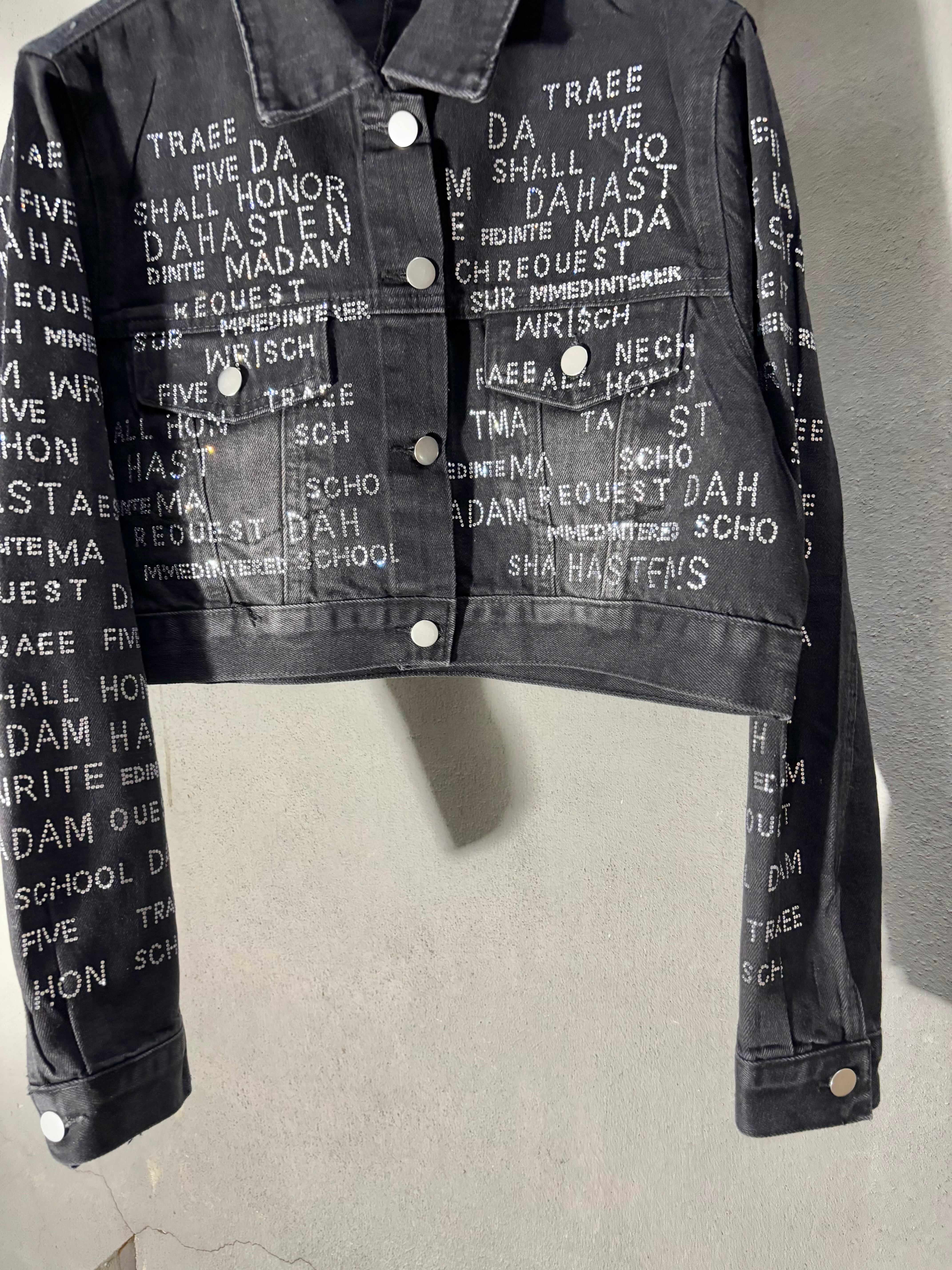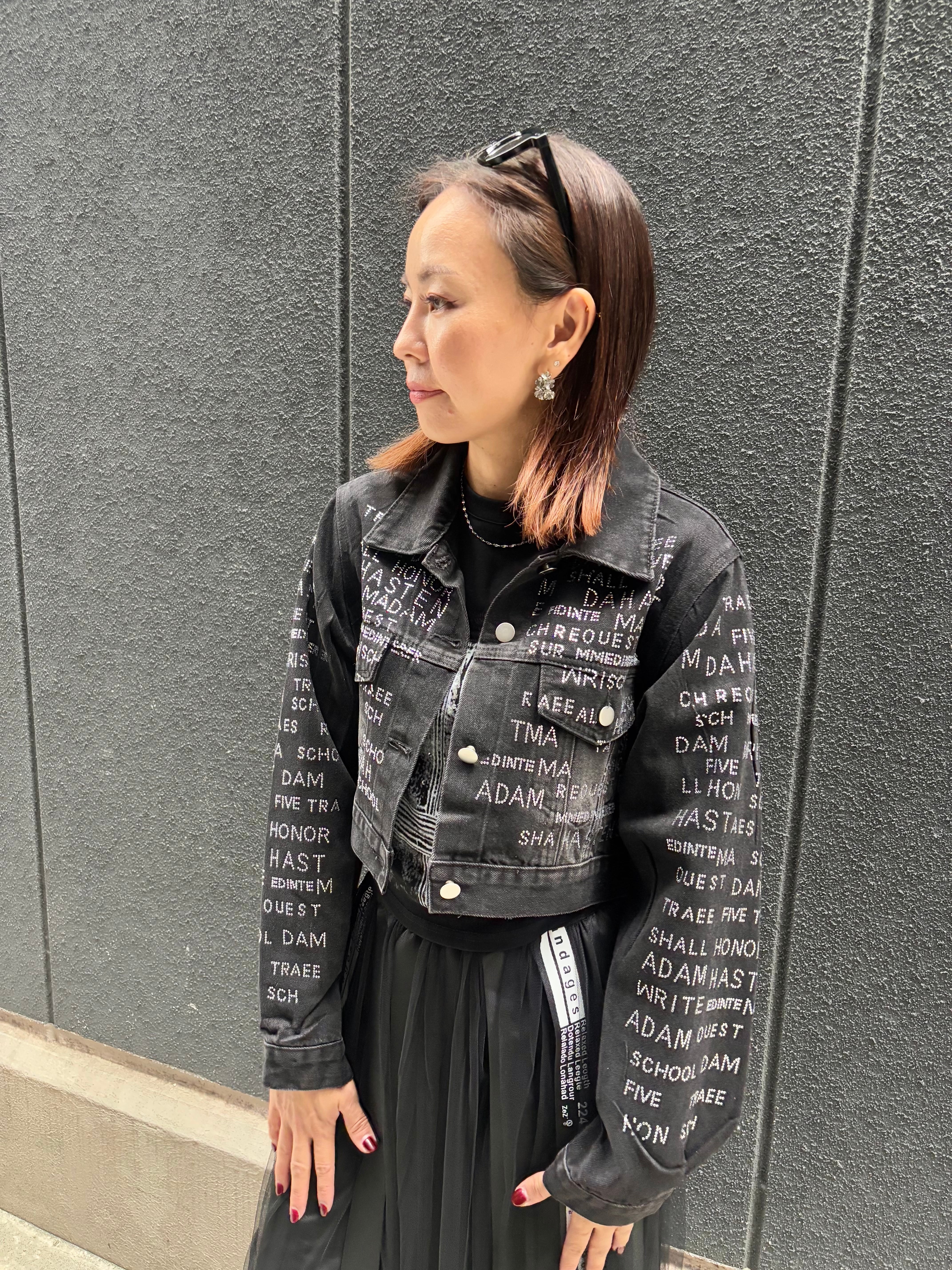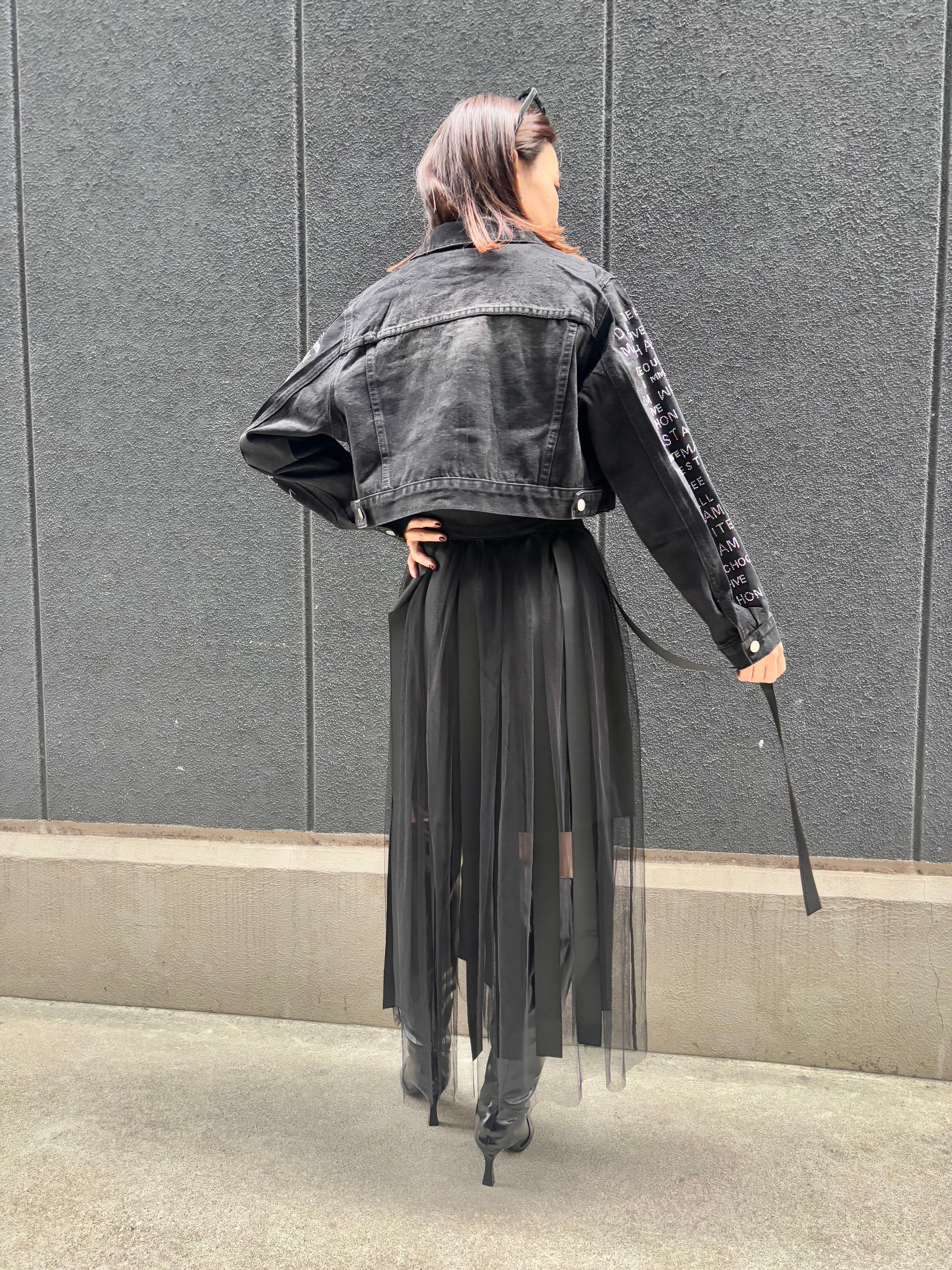 stone text design black denim jacket ジャケット デニム ブラックデニム ストーン ハピス テキスト
