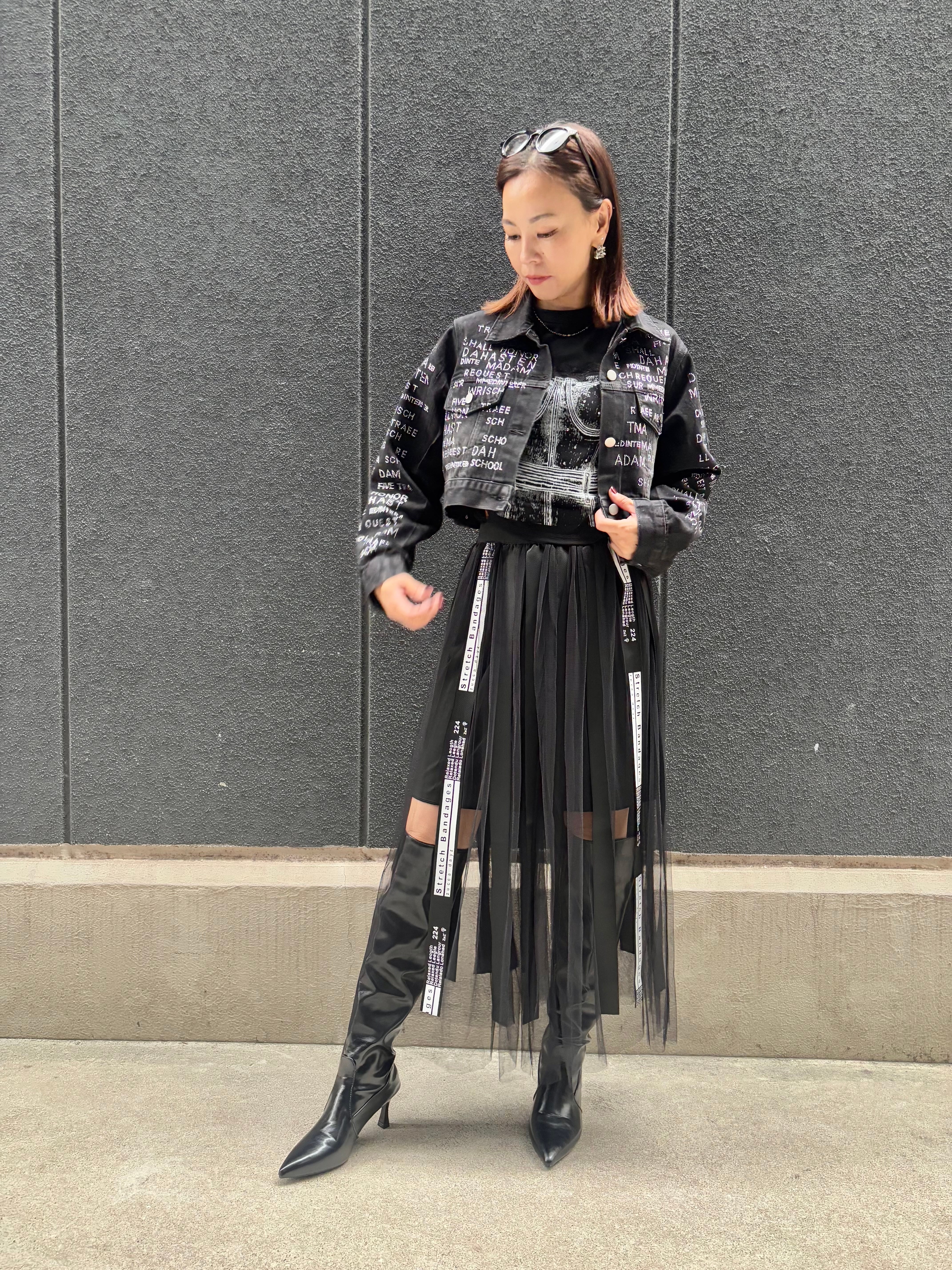 ブラックデニム素材で作られており、クールな印象を与える一着です。