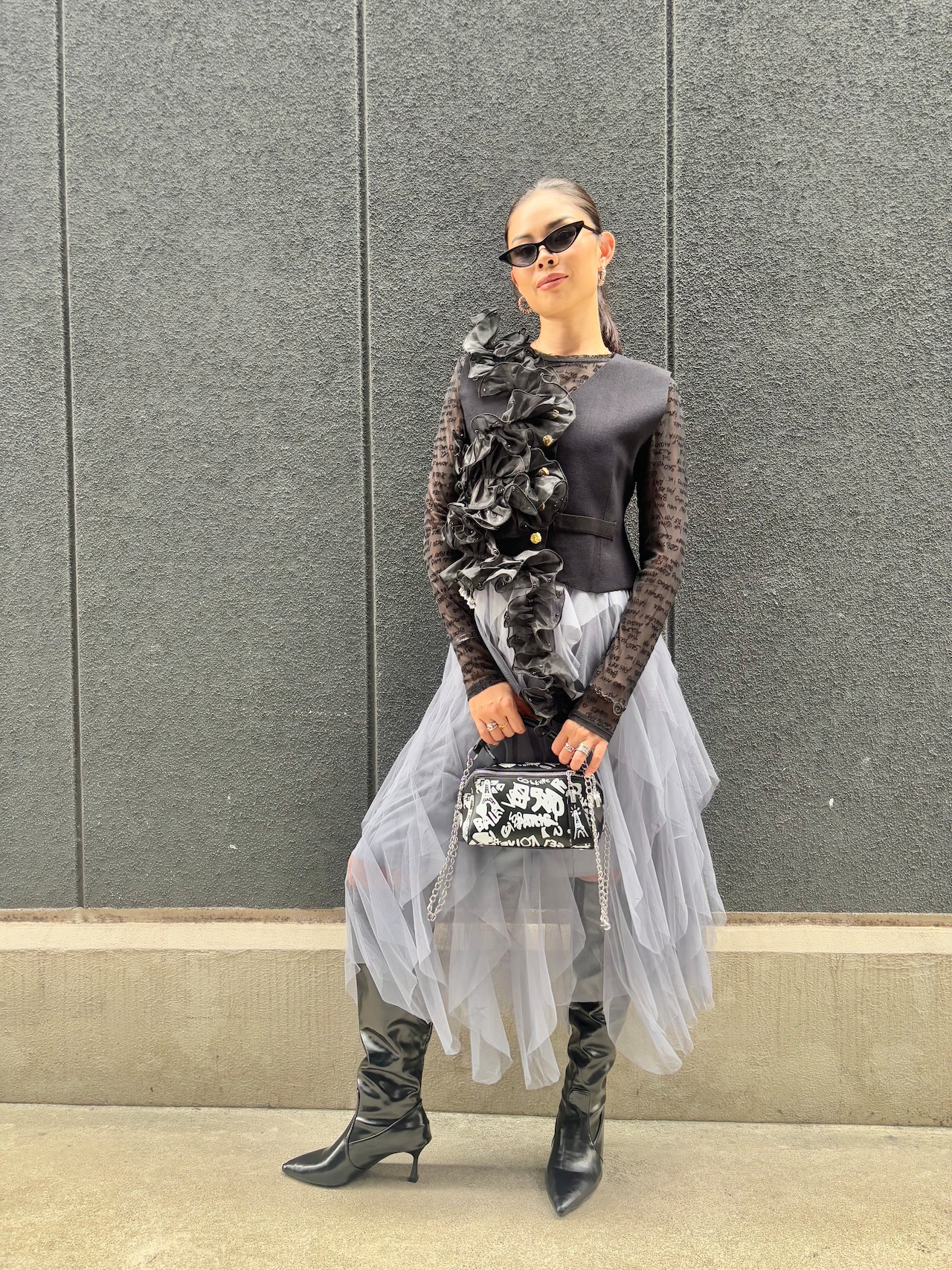 ブラックのシックな色合いが、コーディネートに華やかさを加えます♪