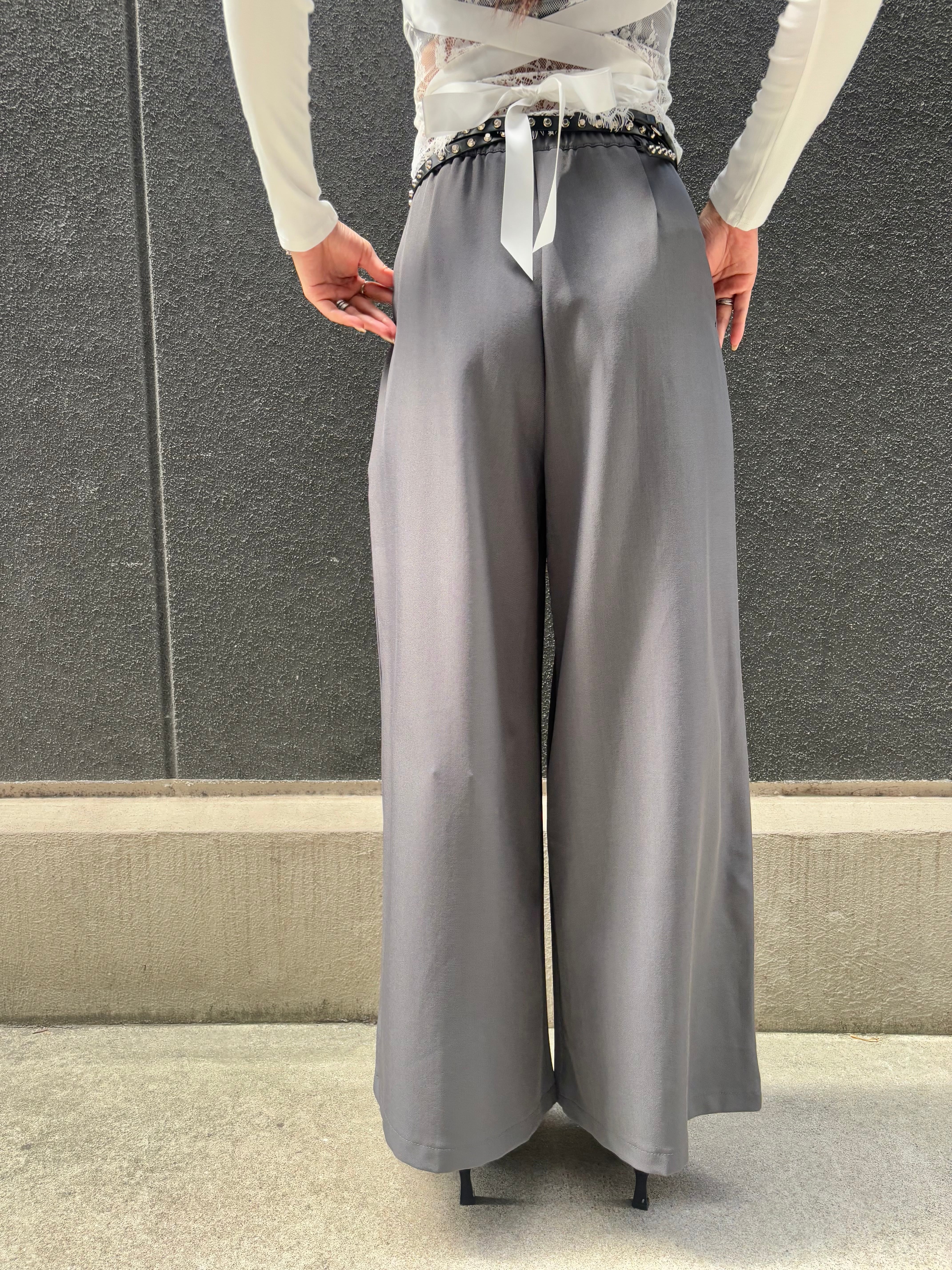 スタイルを際立たせる、綺麗なワイドシルエットのデザインパンツです。