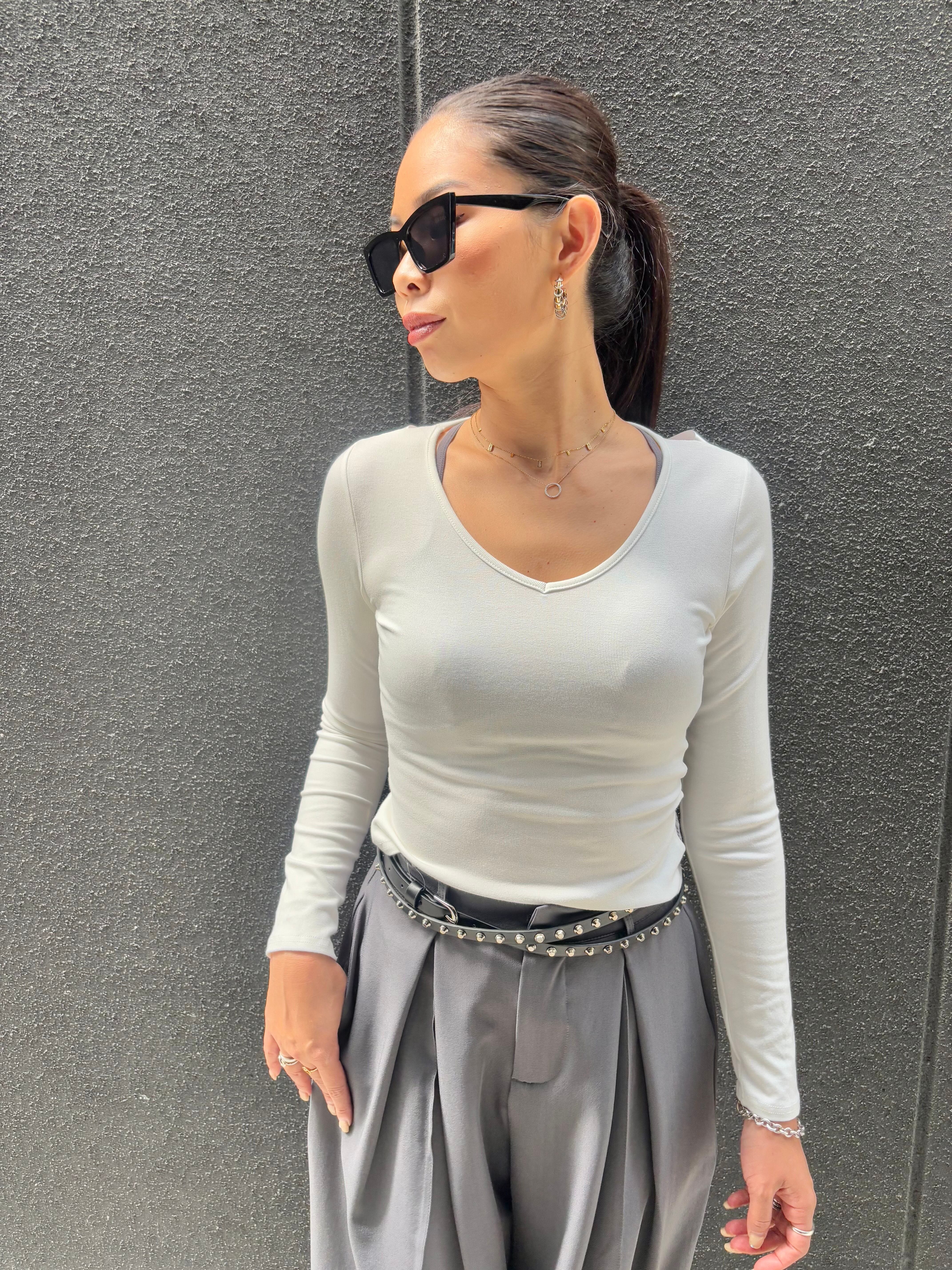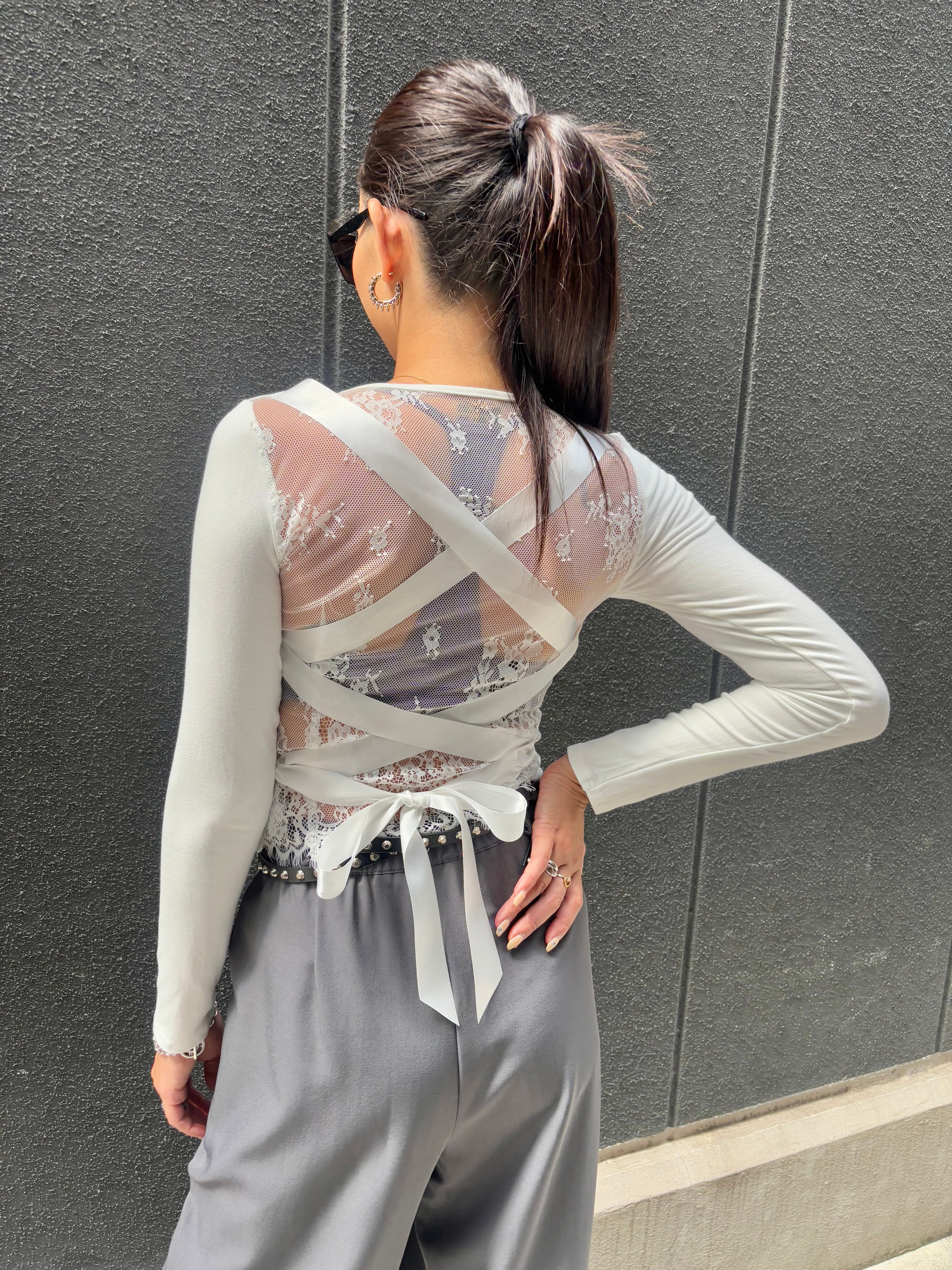バックのレースアップデザインが特徴的な、Vネック長袖トップスです。