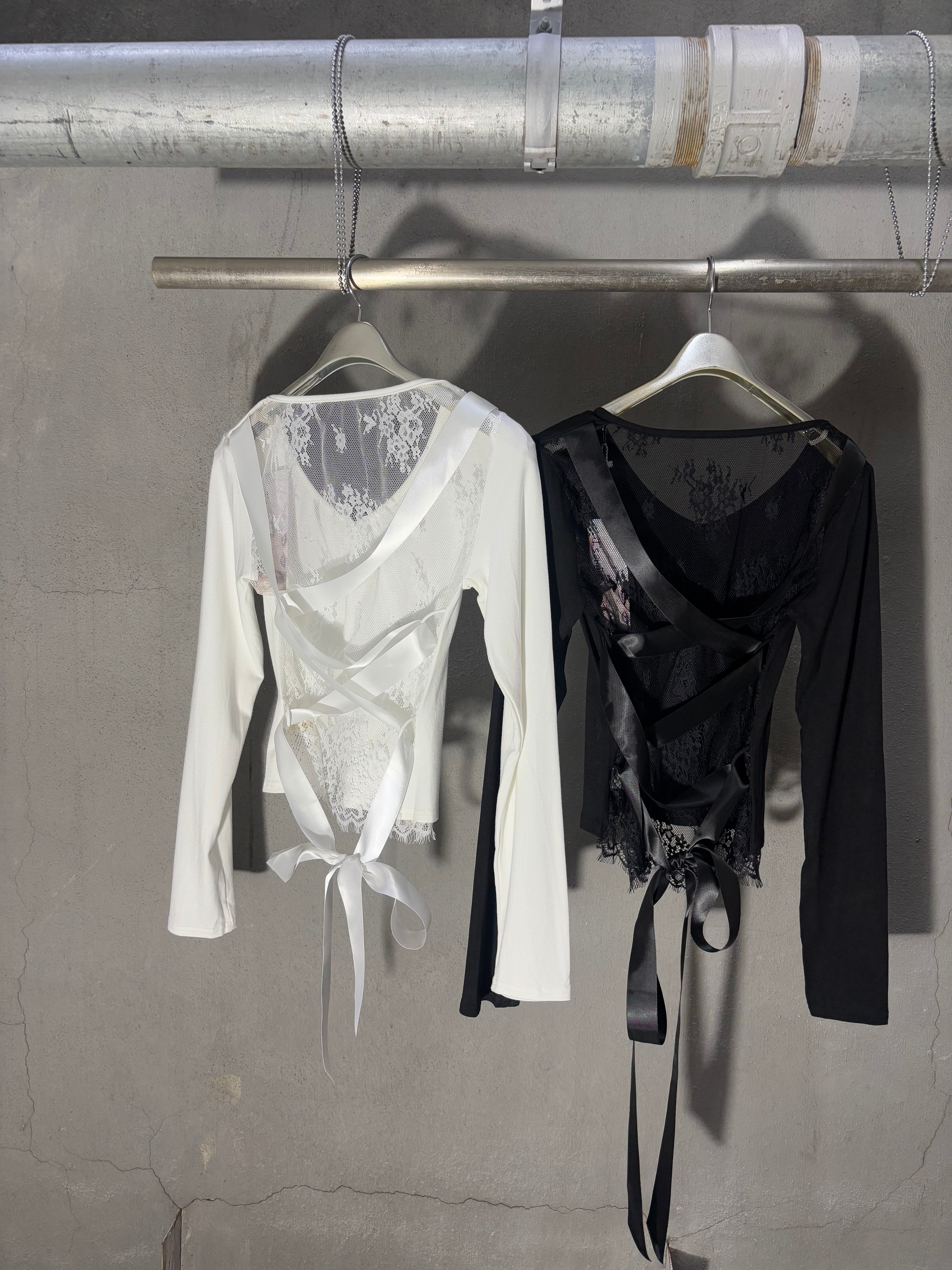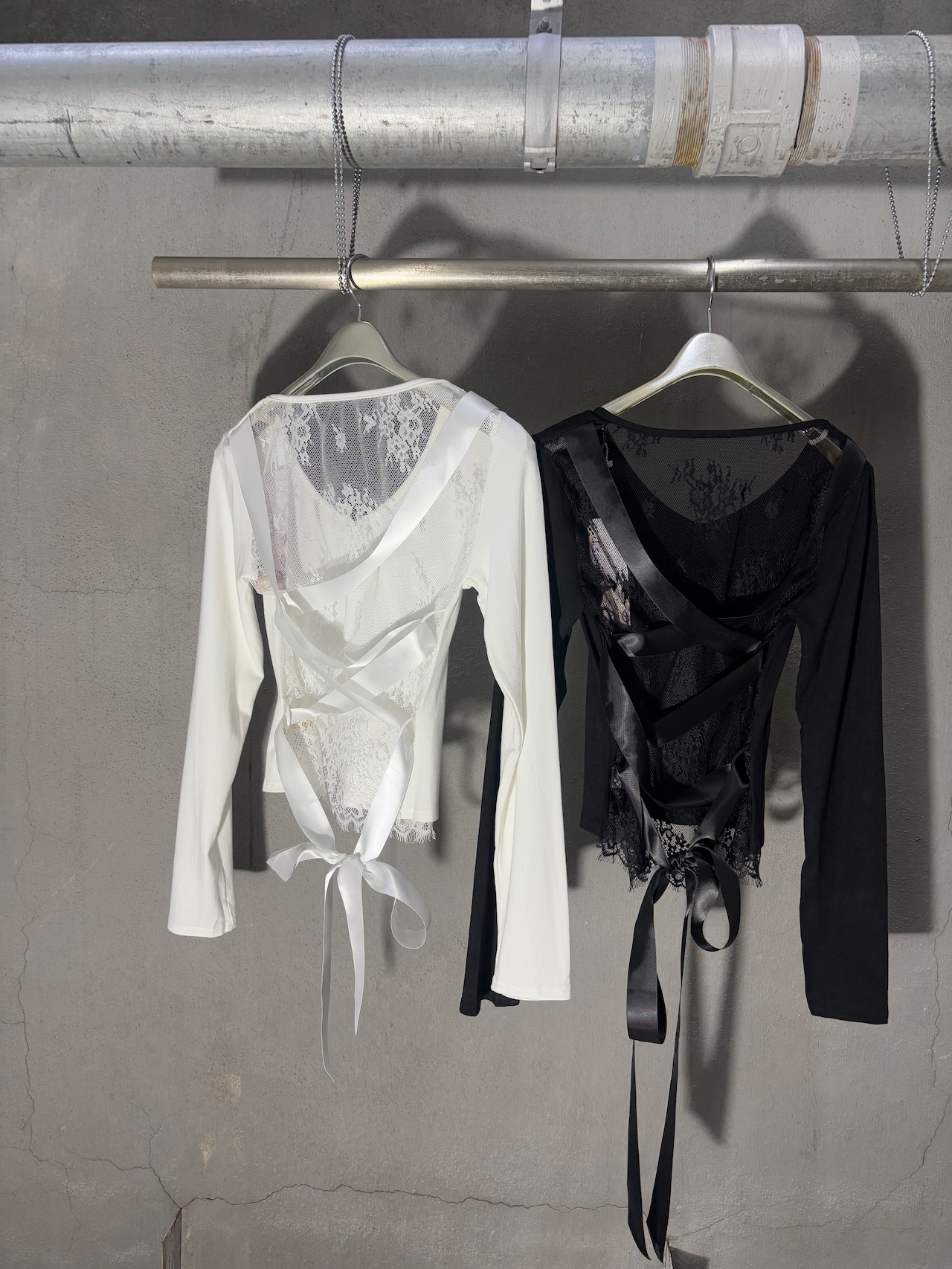 back lace × ribbon design V-neck tops トップス 長袖 Vネック レース リボン