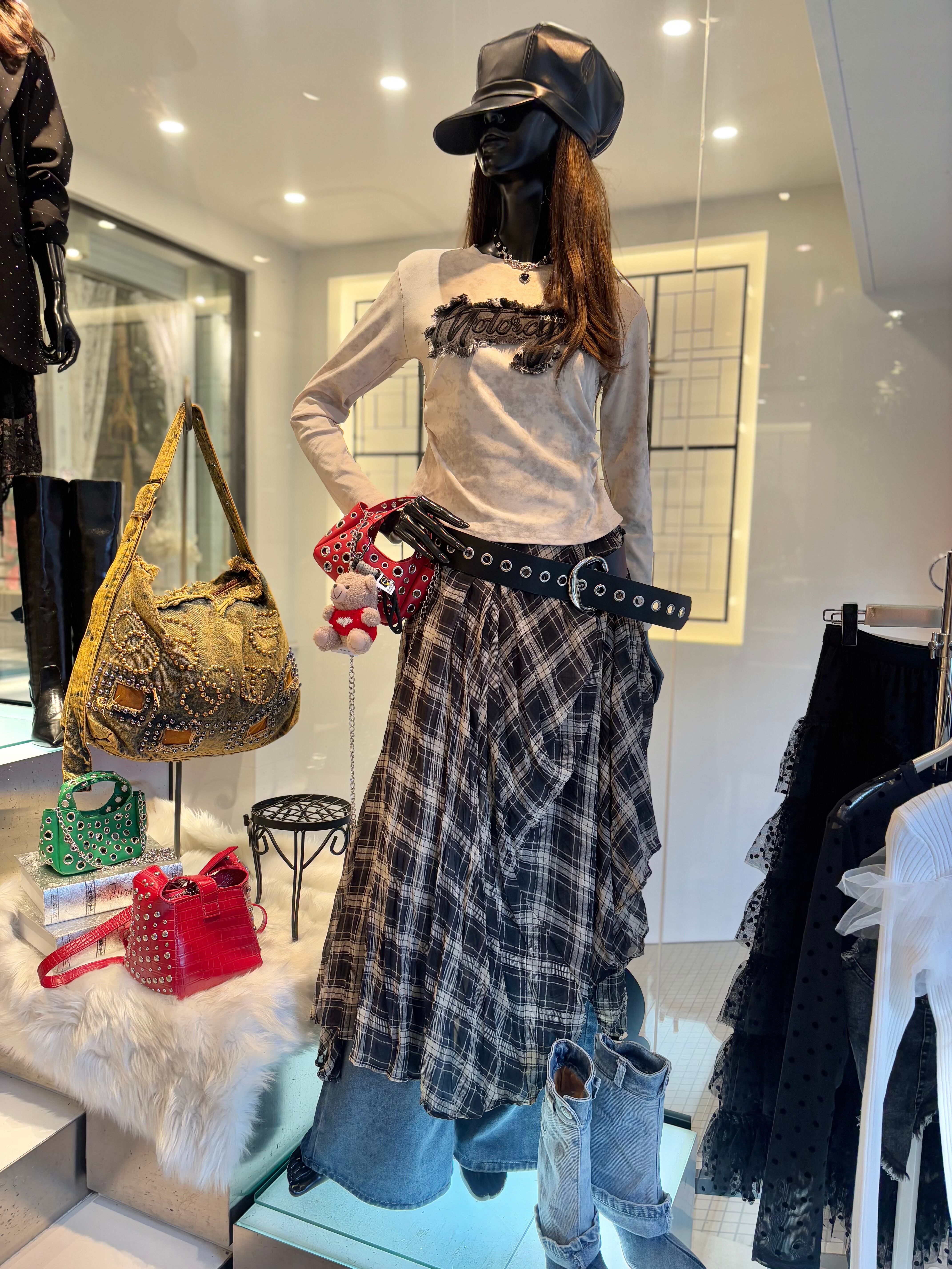 チェックパターンが秋らしさを引き立て、シンプルなコーディネートでも存在感を放ちます。