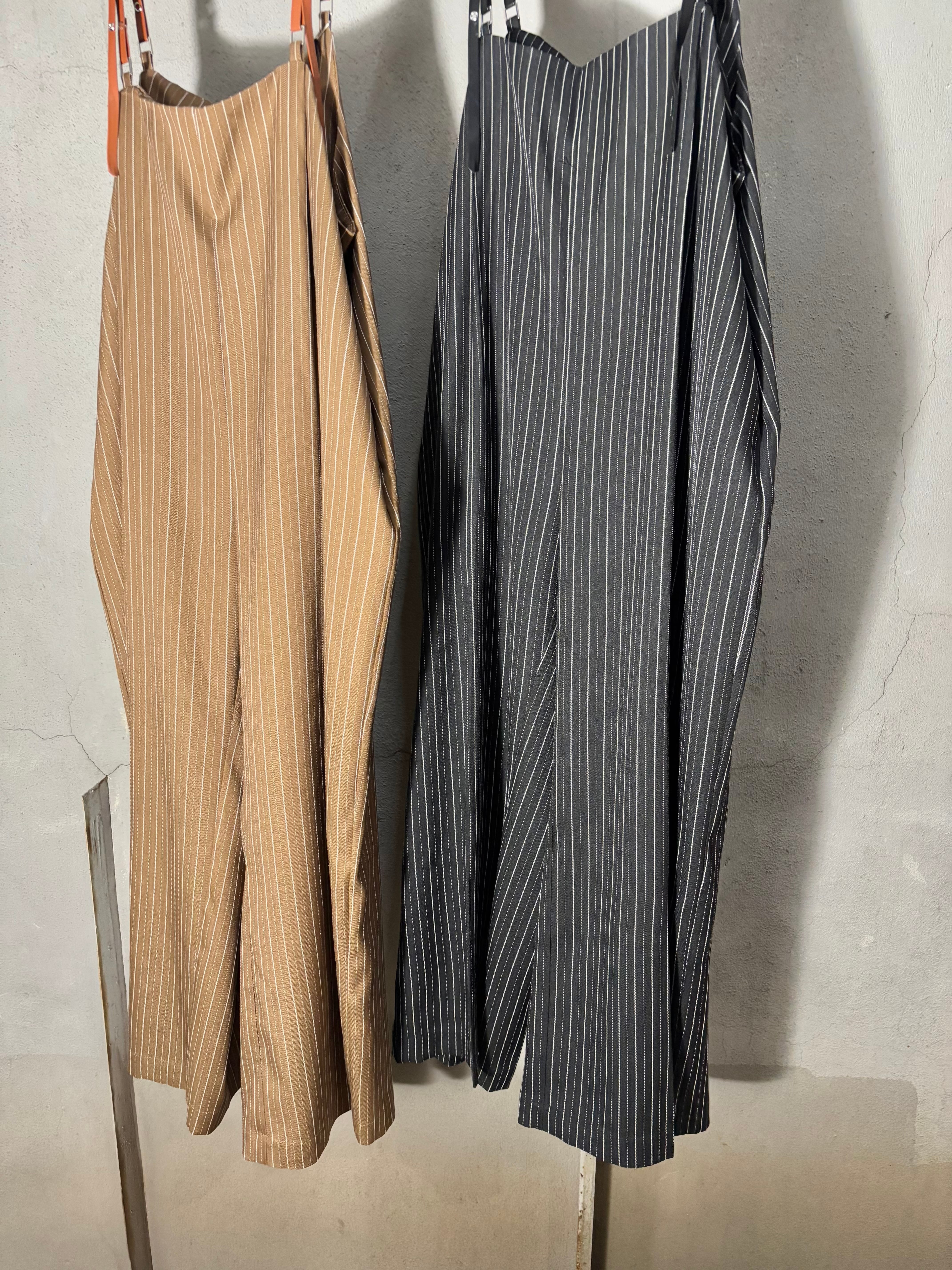 mannish stripe × PU strap salopette pants サロペット パンツ ストライプ ストラップ 重ね着