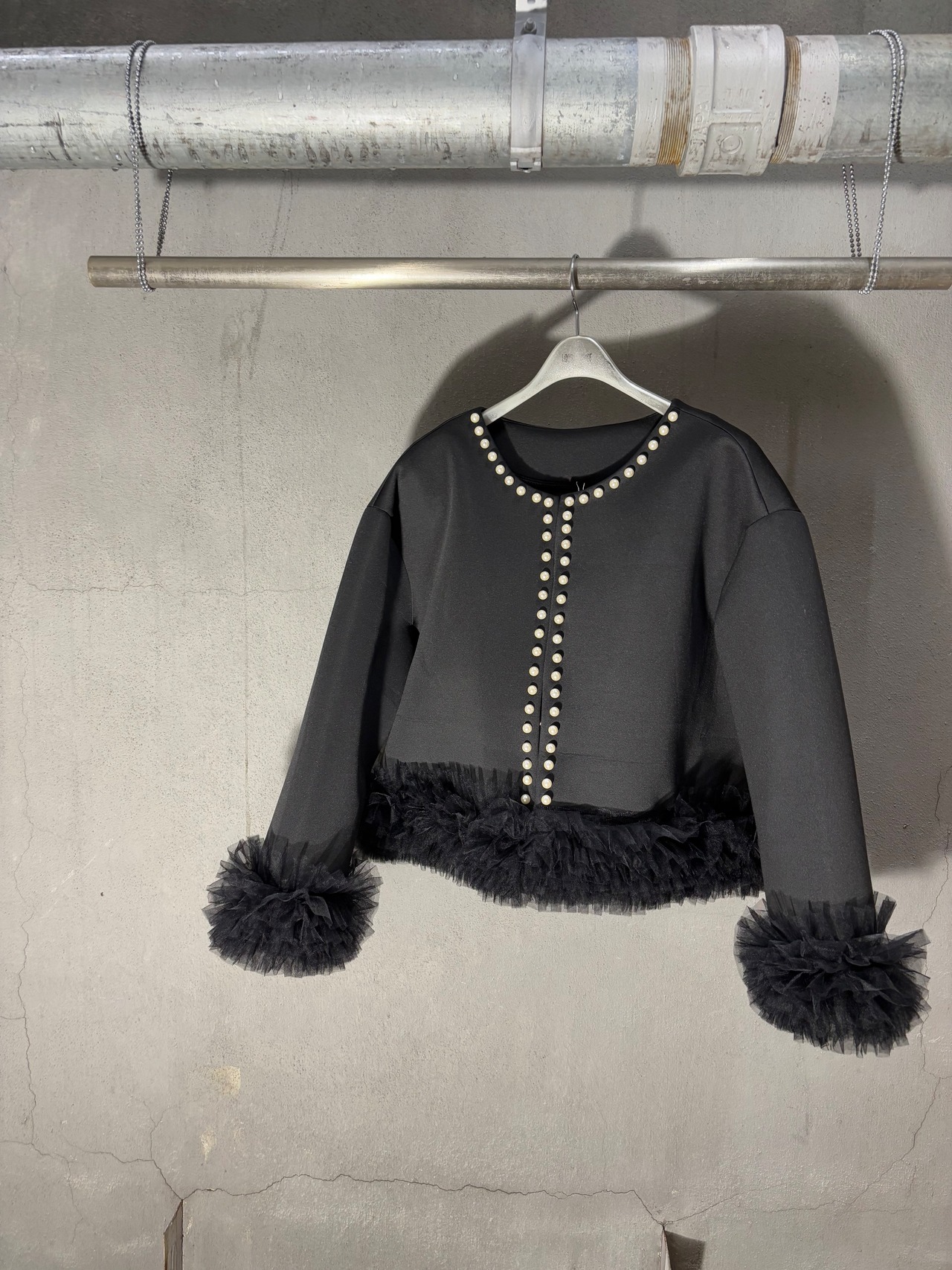 pearl trimming tulle frill design C-neck jacket ジャケット Cネック チュール フリル ウレタン ブラック 黒 アウター