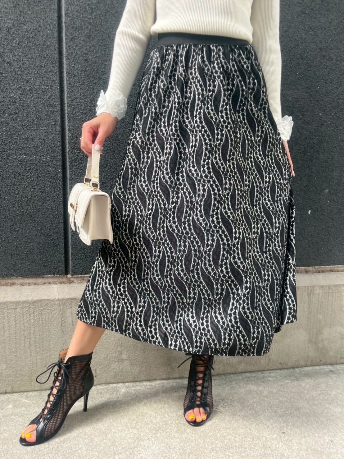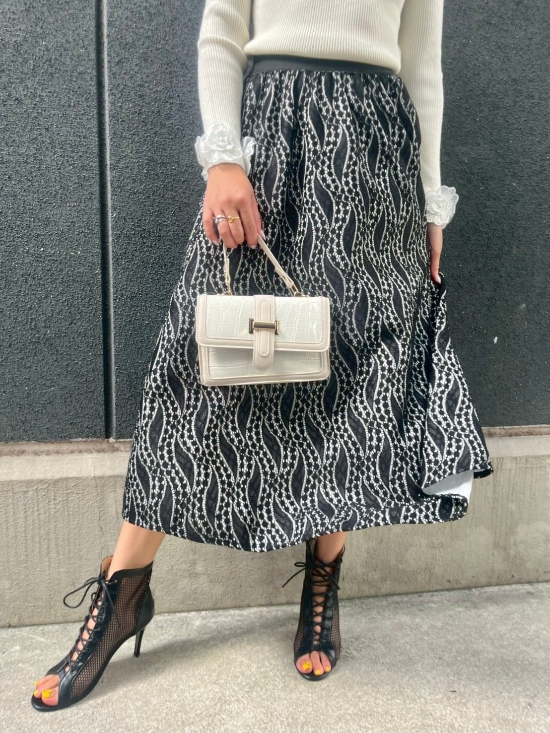 エレガントな白黒バイカラー模様のレースが魅力的なフレアロングスカートが登場!