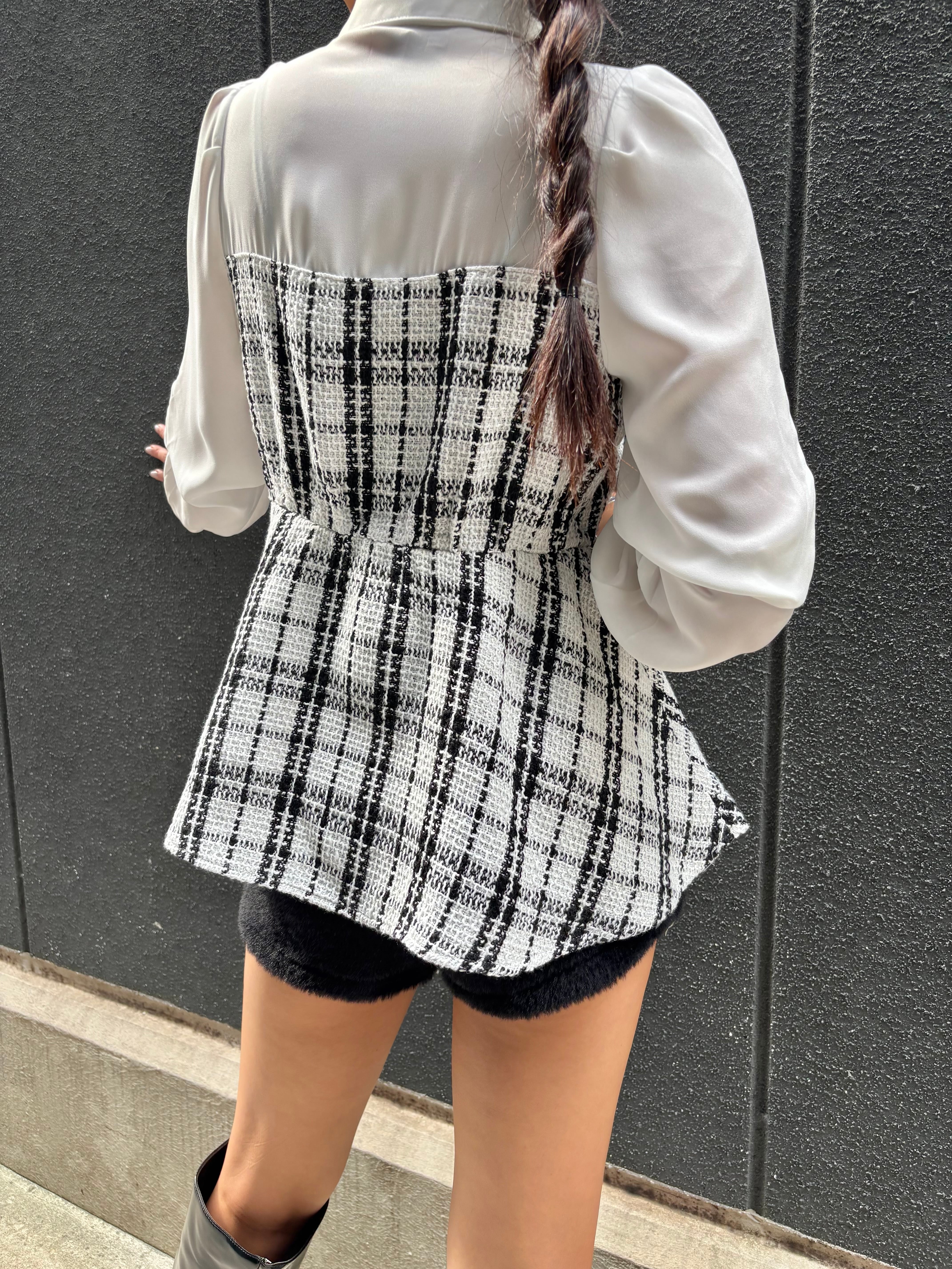 シフォン素材のホワイトシャツとツィードのドッキングデザインが特徴的なトップスです♪