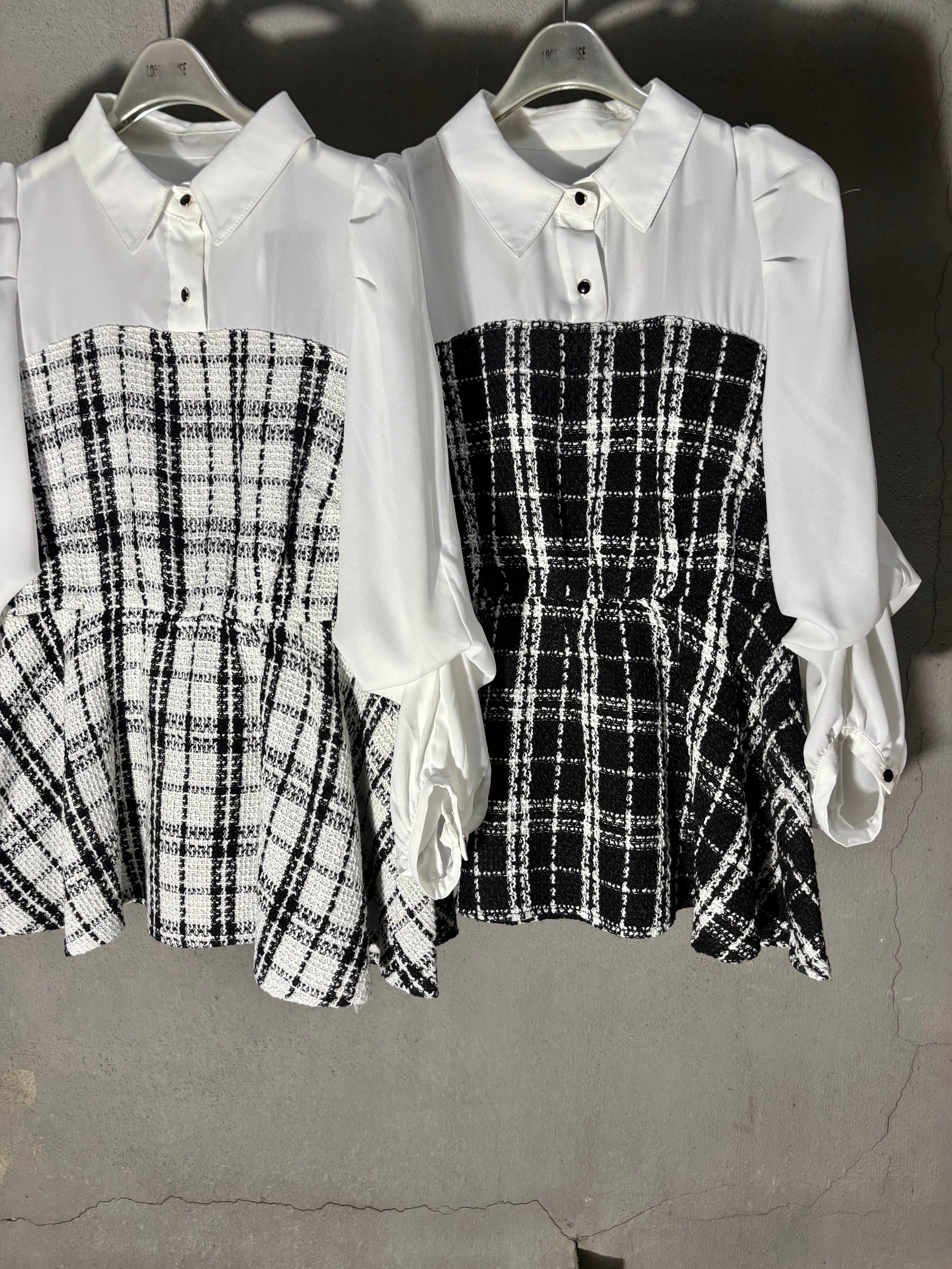 chiffon × check tweed docking design tops トップス シフォン チェック ツィード ドッキング バイカラー 白黒