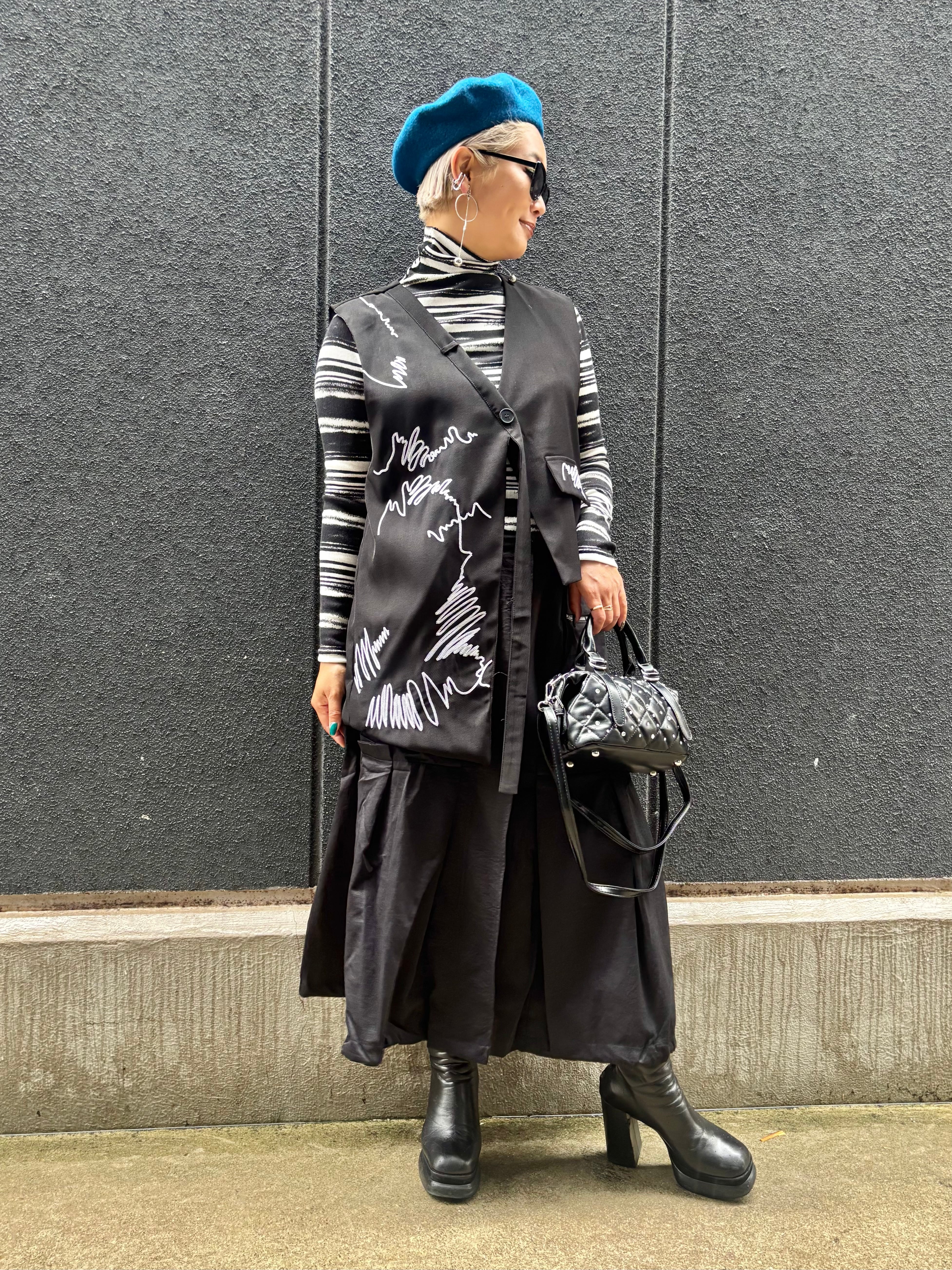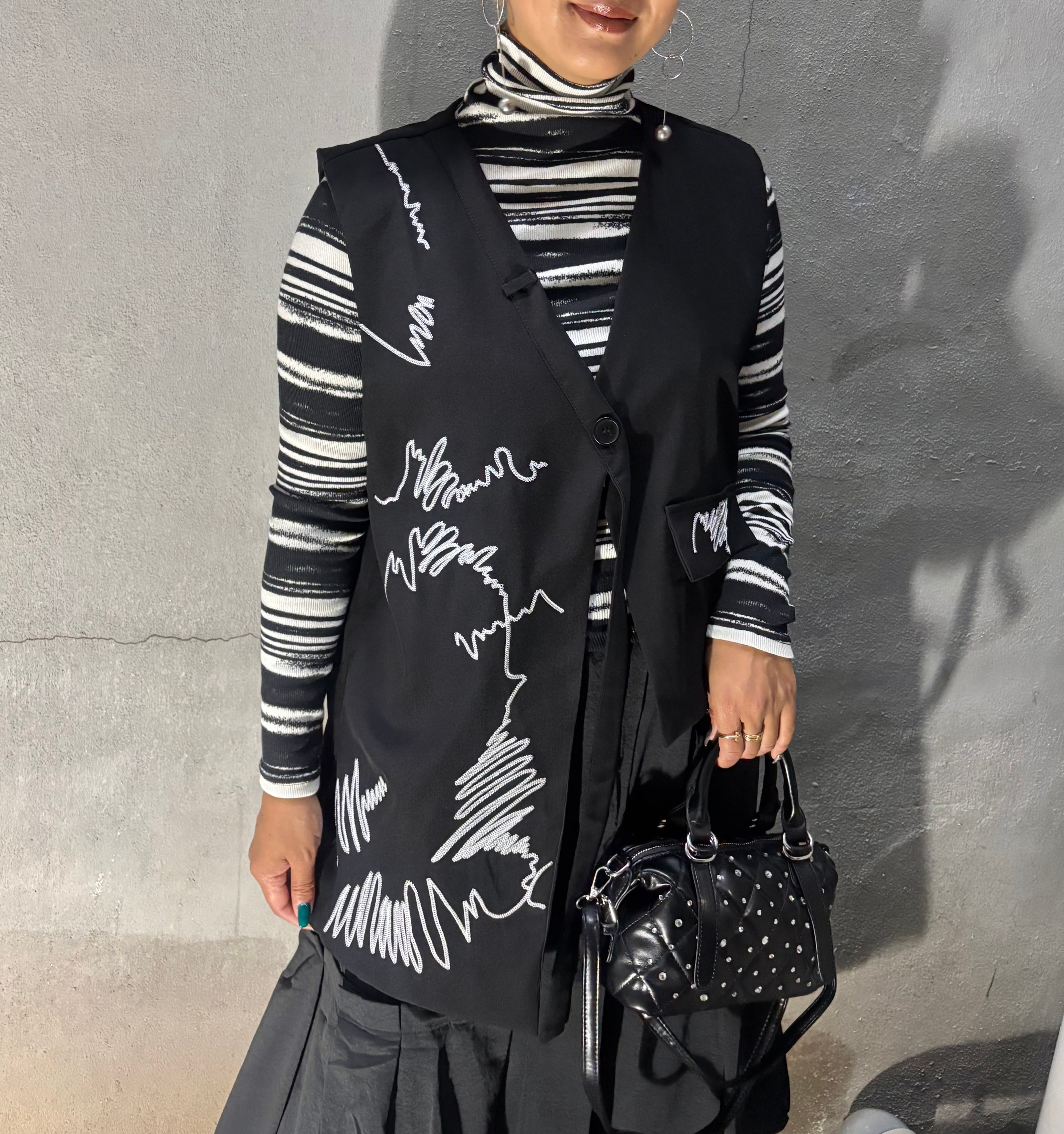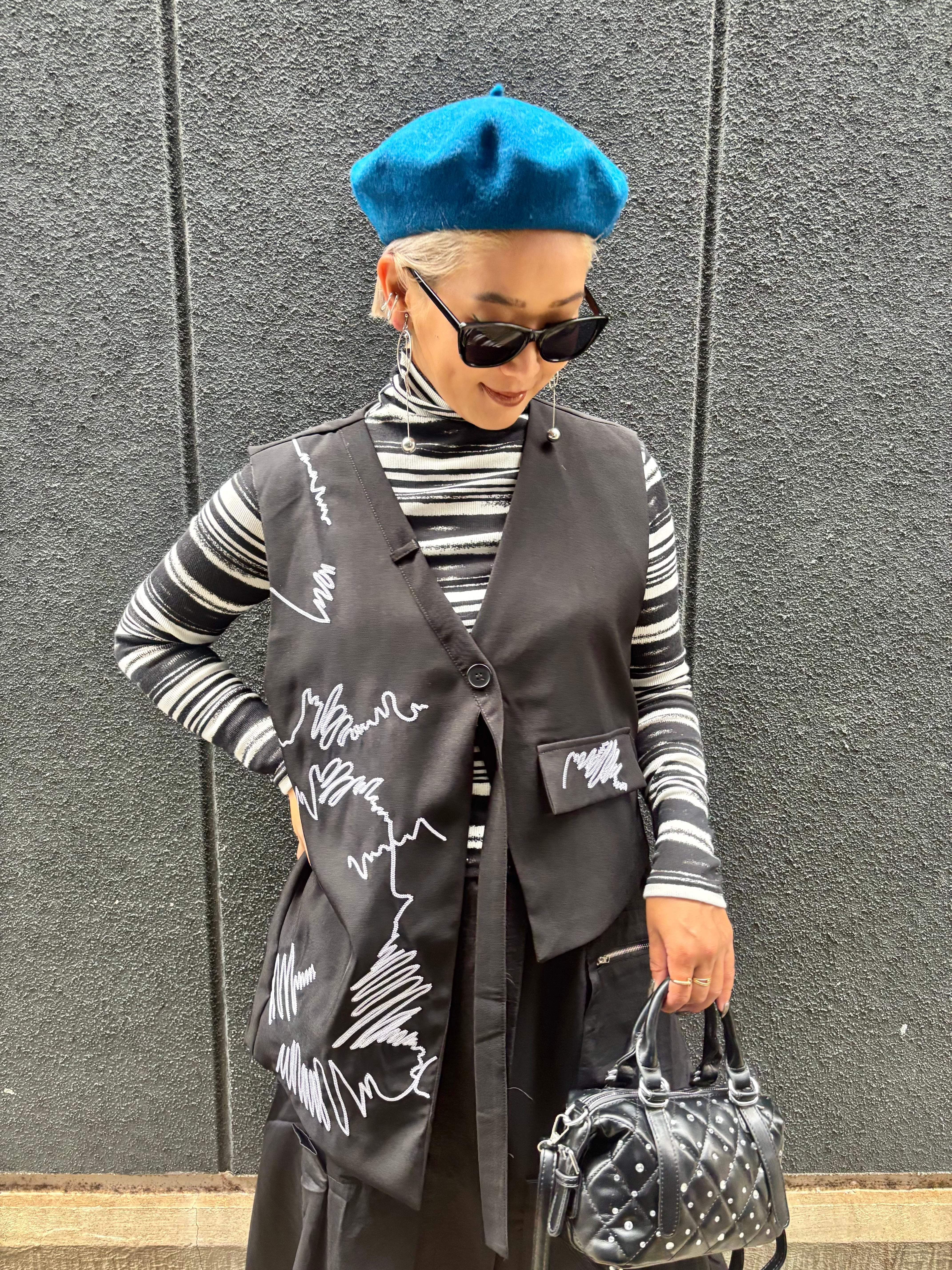 white stitch design asymmetry collarless vest ベスト デザインベスト アシンメトリー ステッチ 刺繍 重ね着