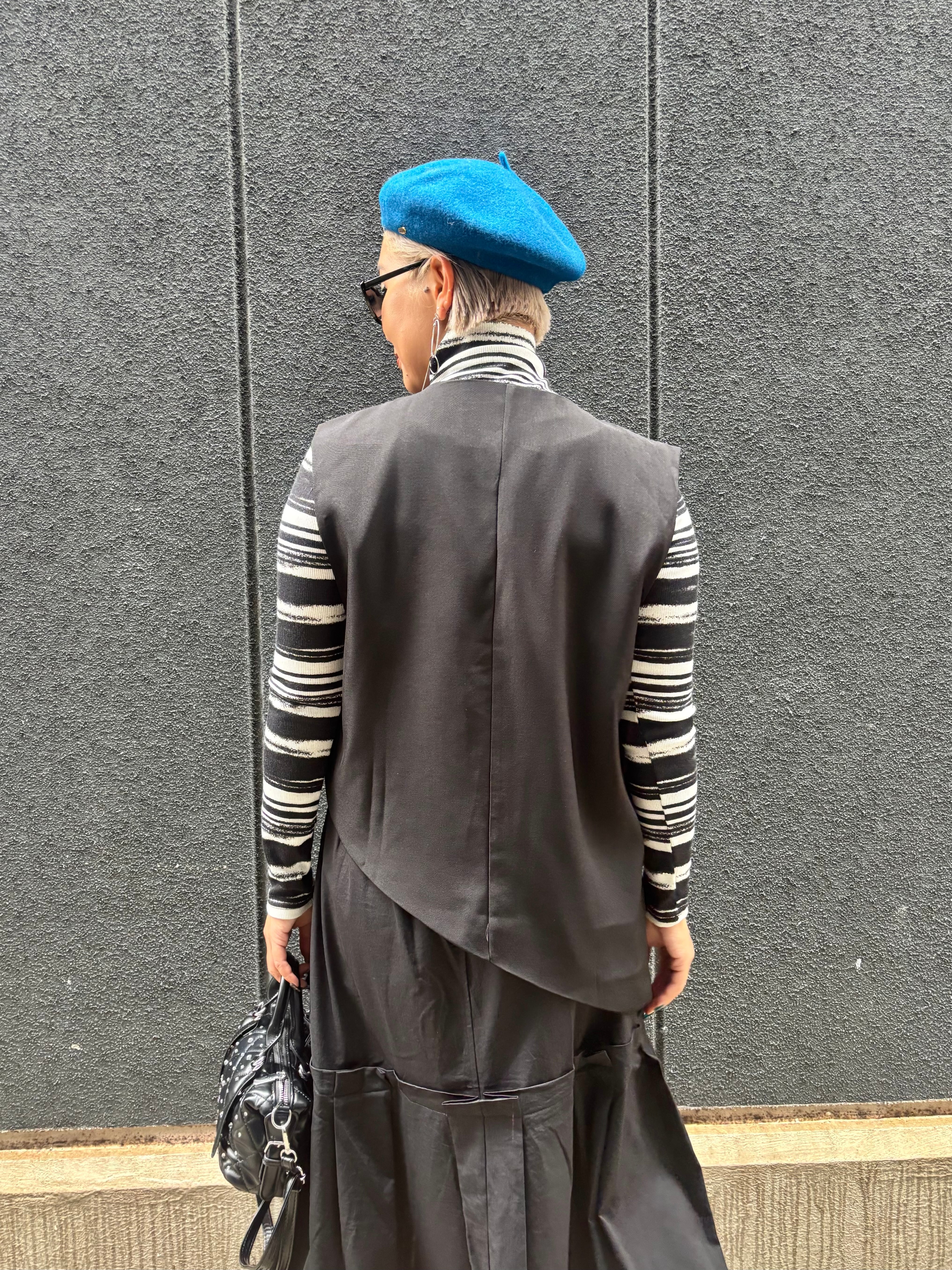 個性的なアシンメトリーデザインが魅力的なカラーレスベストです。