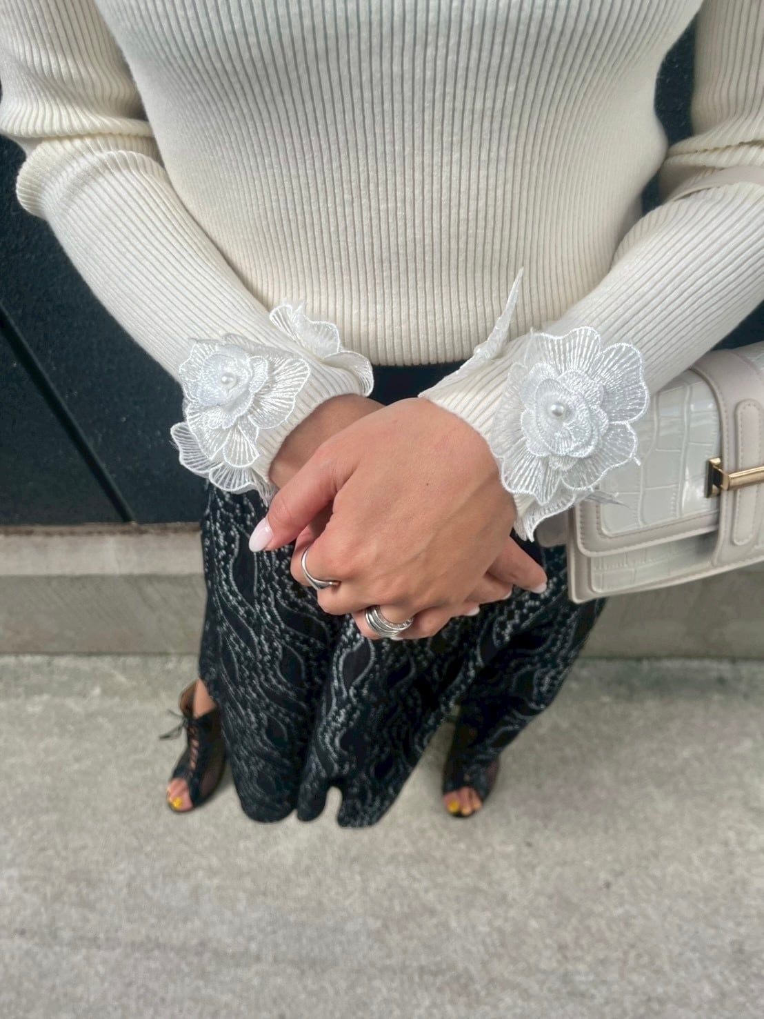 フラワーレースが首回りと袖口に施された、女性らしさが際立つリブニットトップスです。