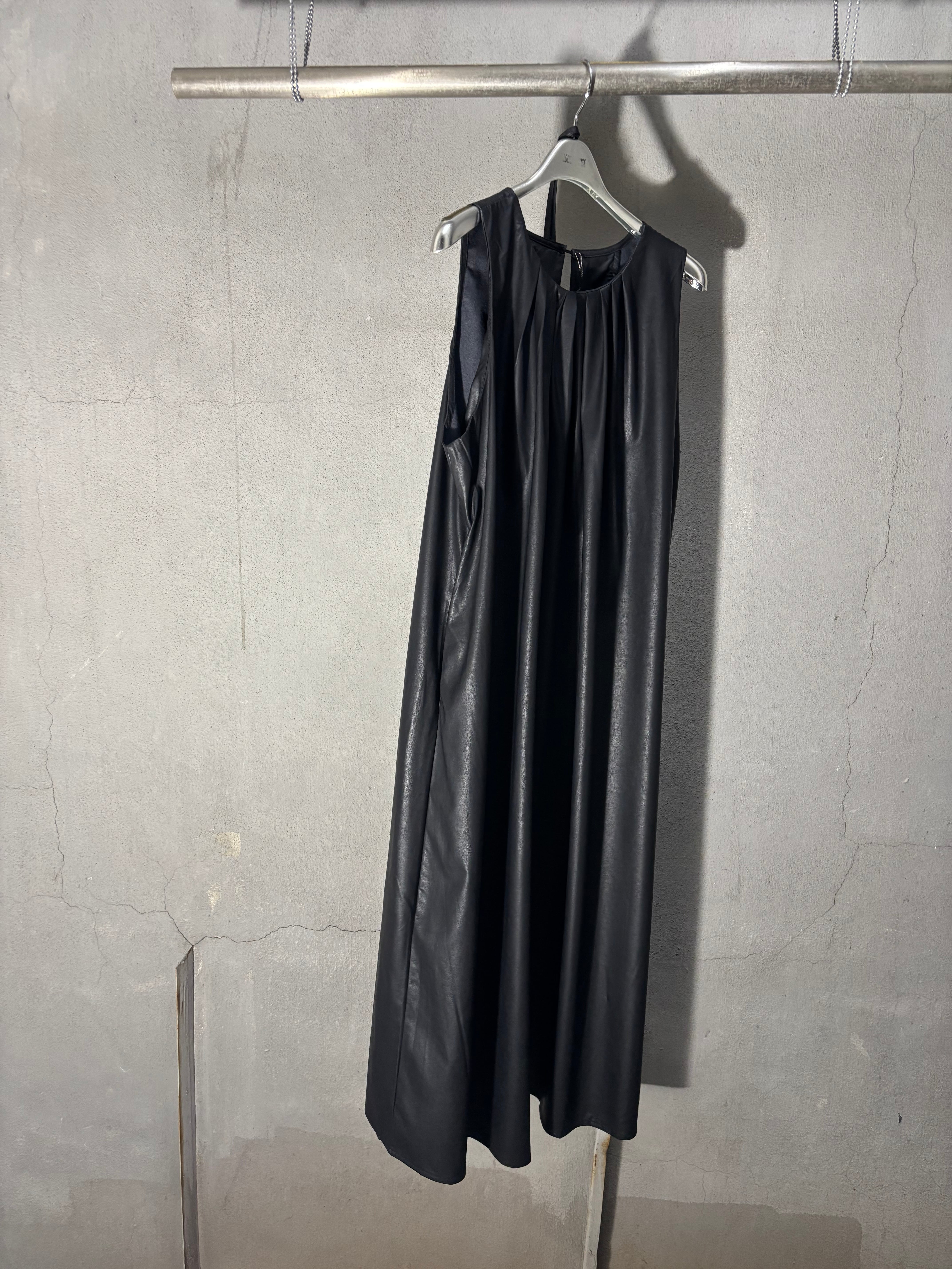 eco leather gather neck design long one-piece ワンピース ロングワンピ 合皮 エコレザー ブラック 黒