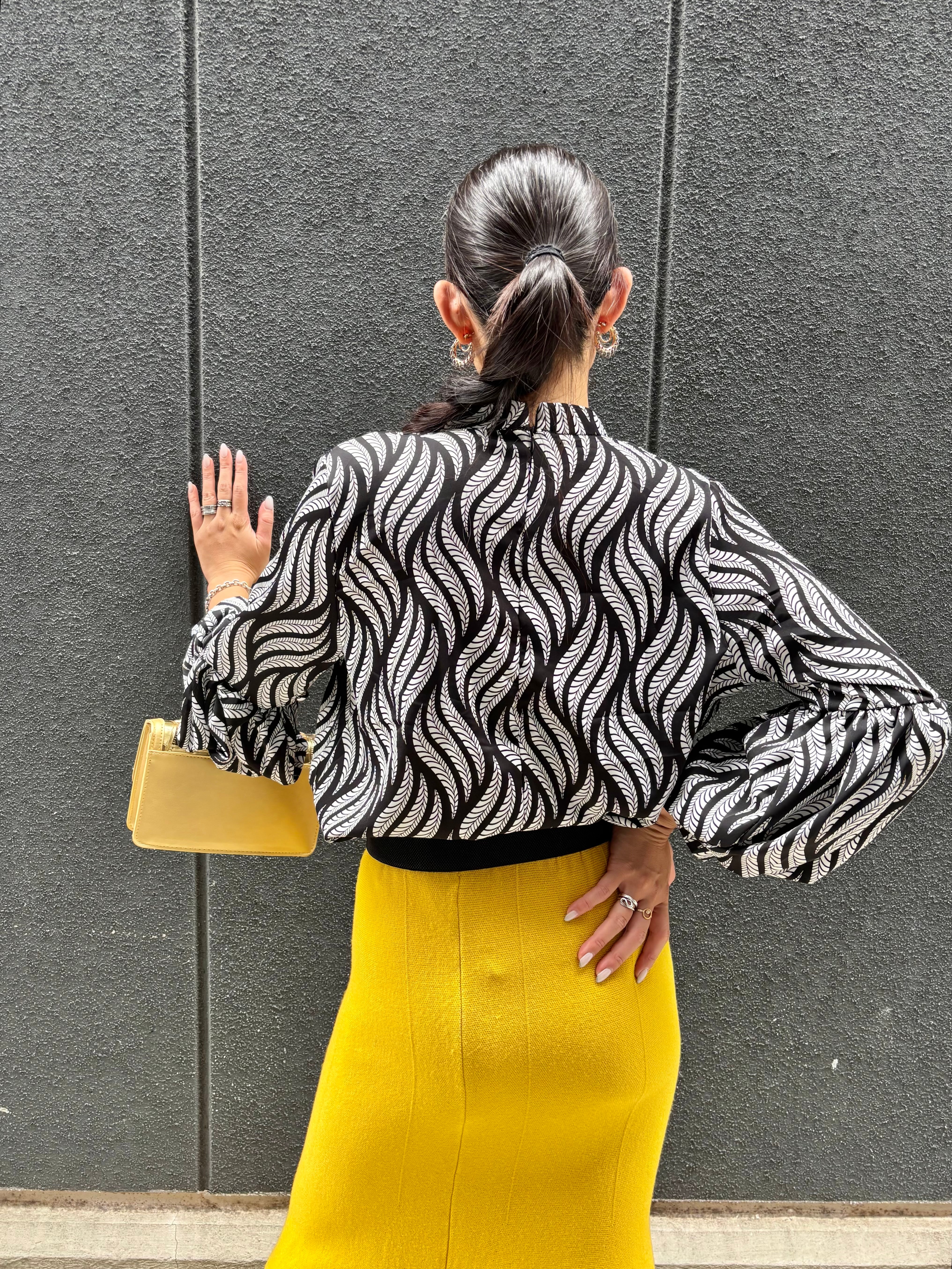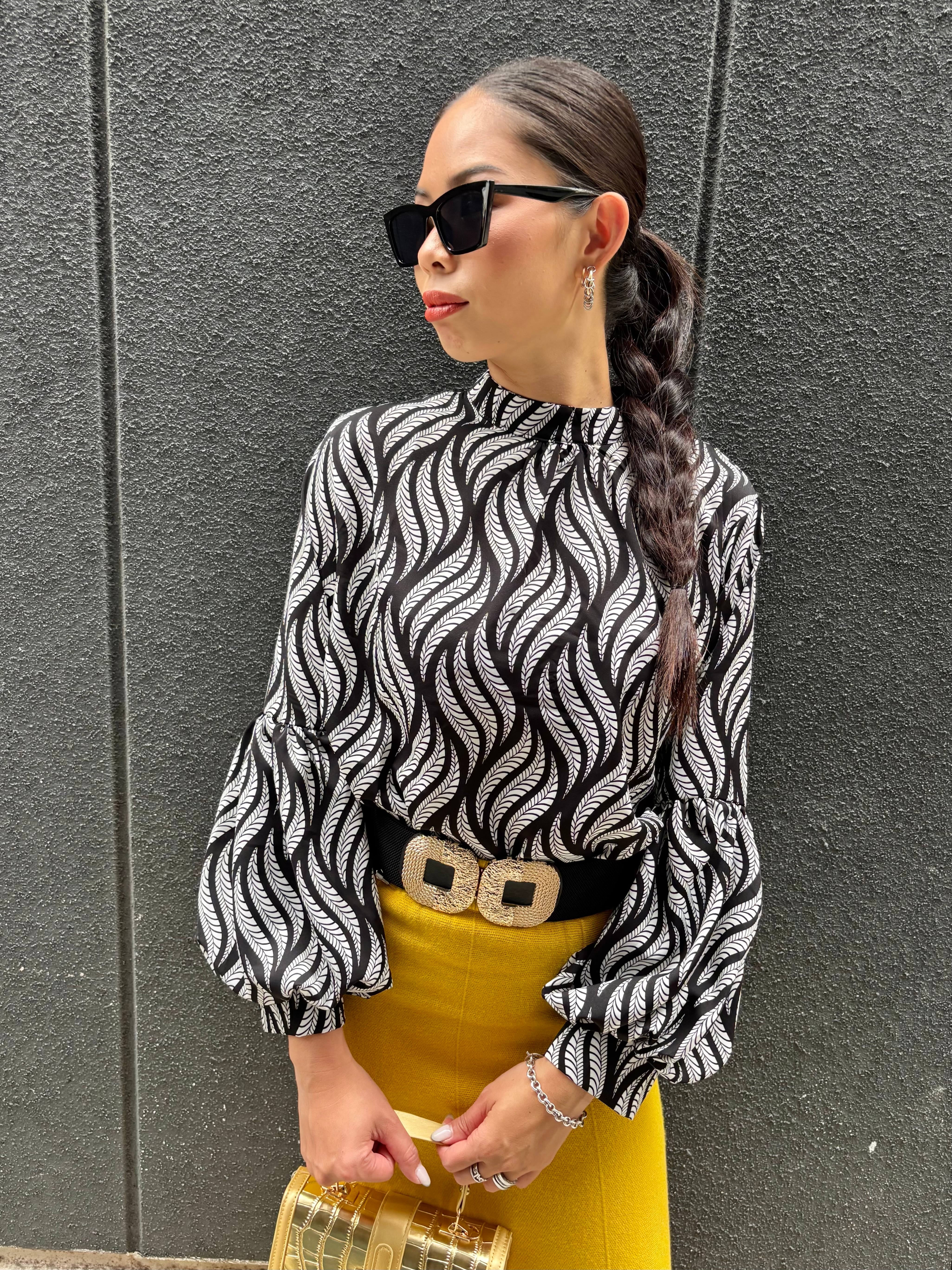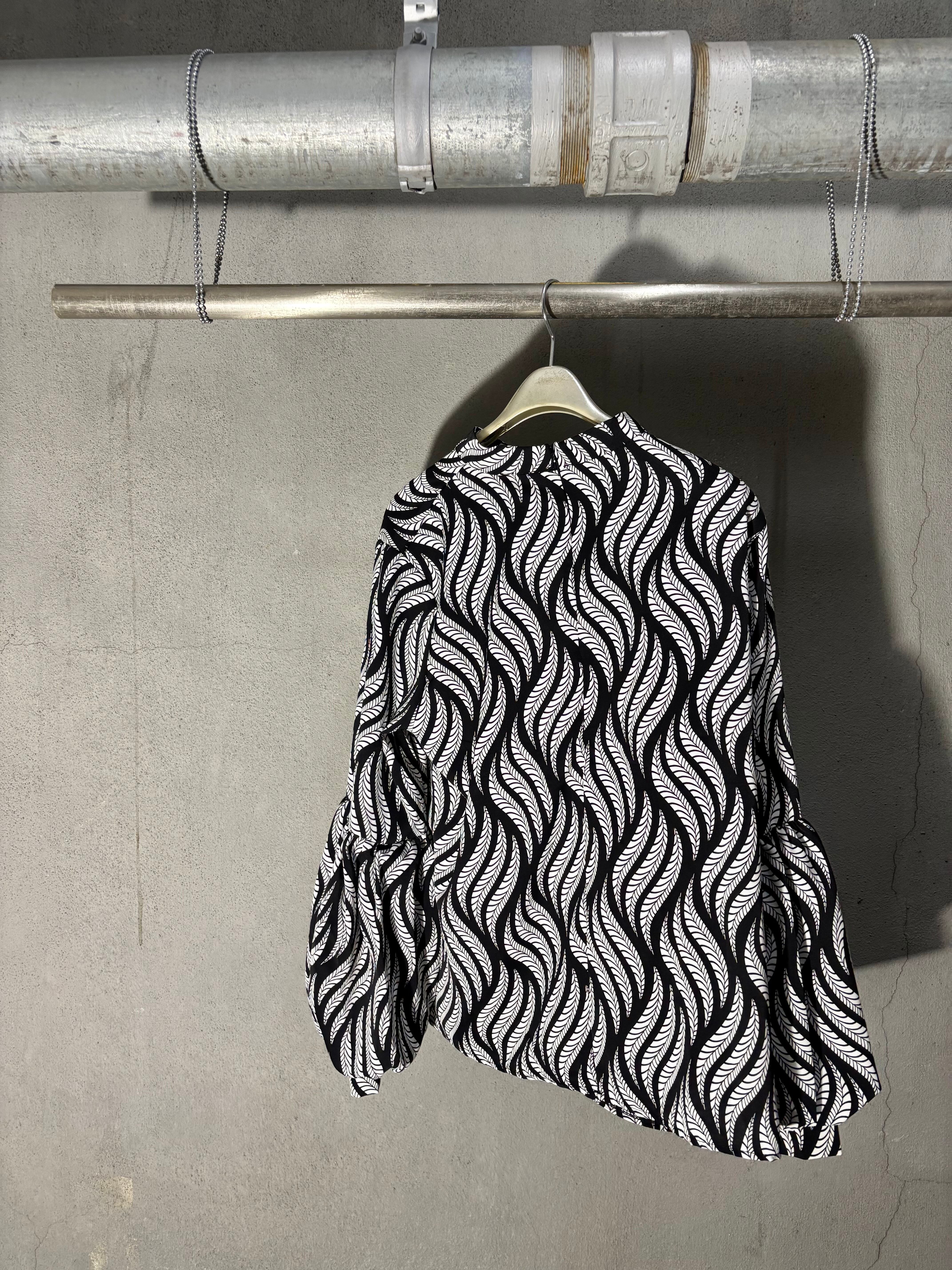 lanthan sleeve × stand neck design tops トップス スタンドネック ランタンスリーブ バイカラー 柄トップス デザイントップス