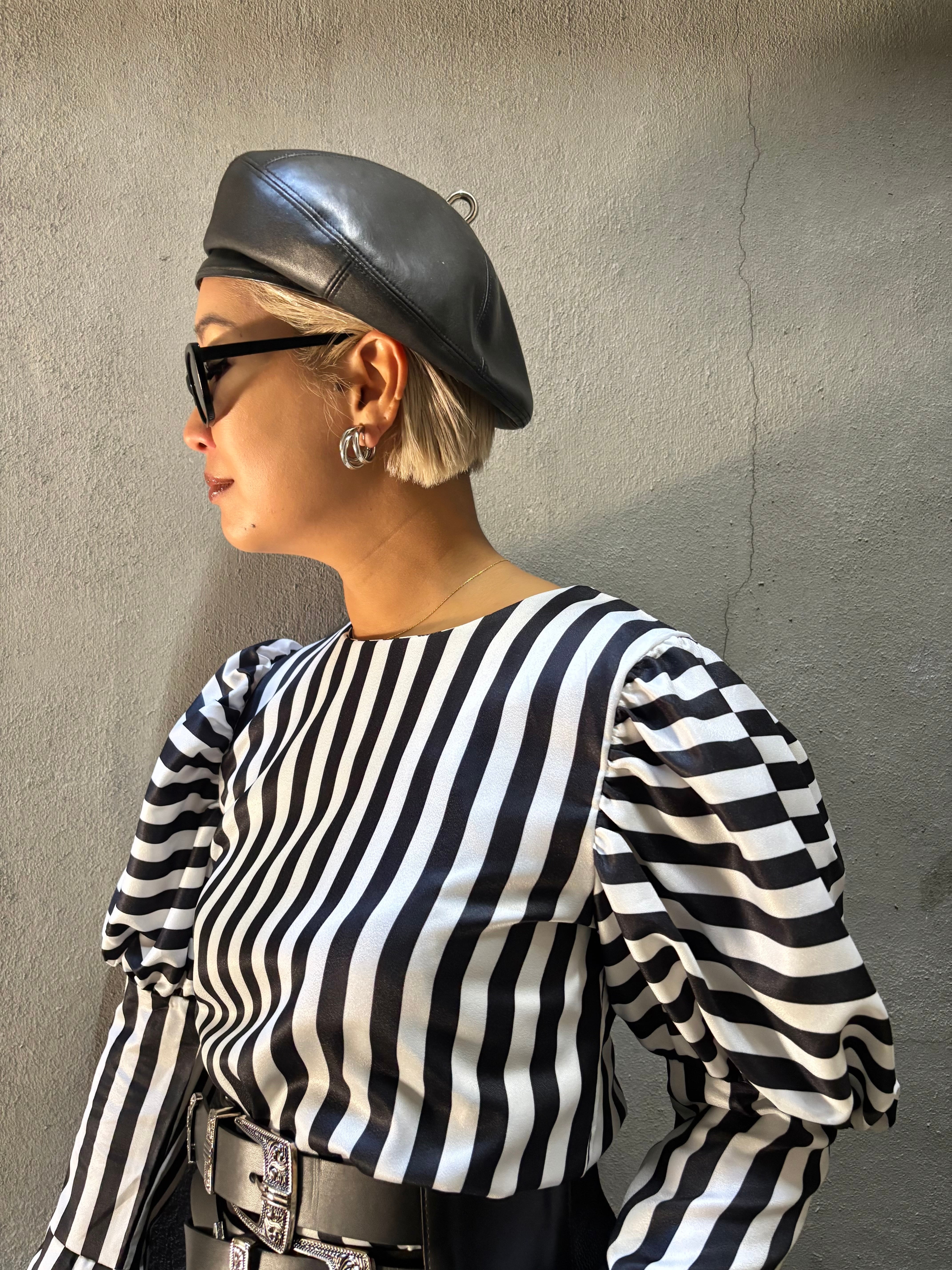 ストライプデザインが際立つ、白黒のバイカラーのデザイントップスです!