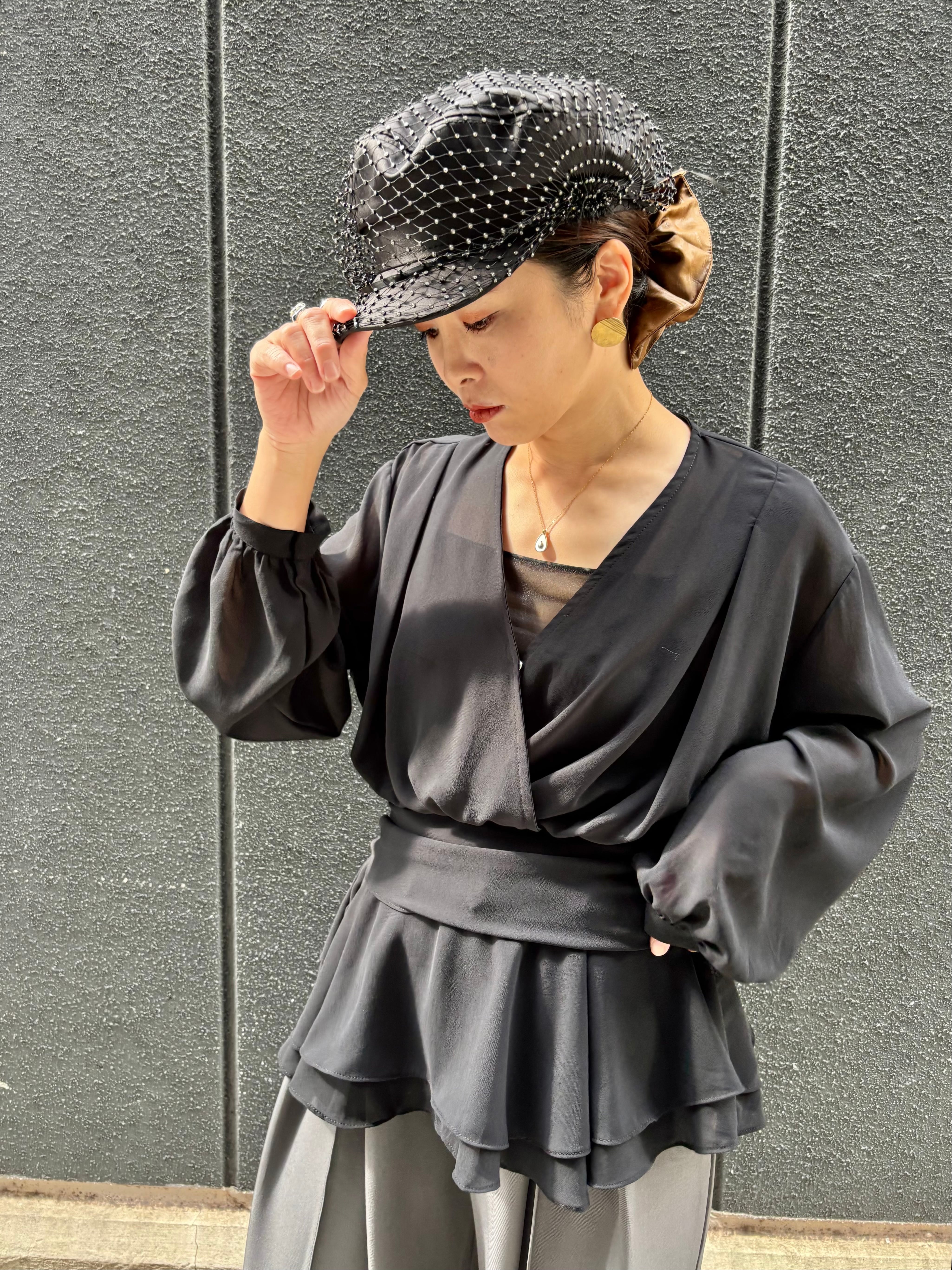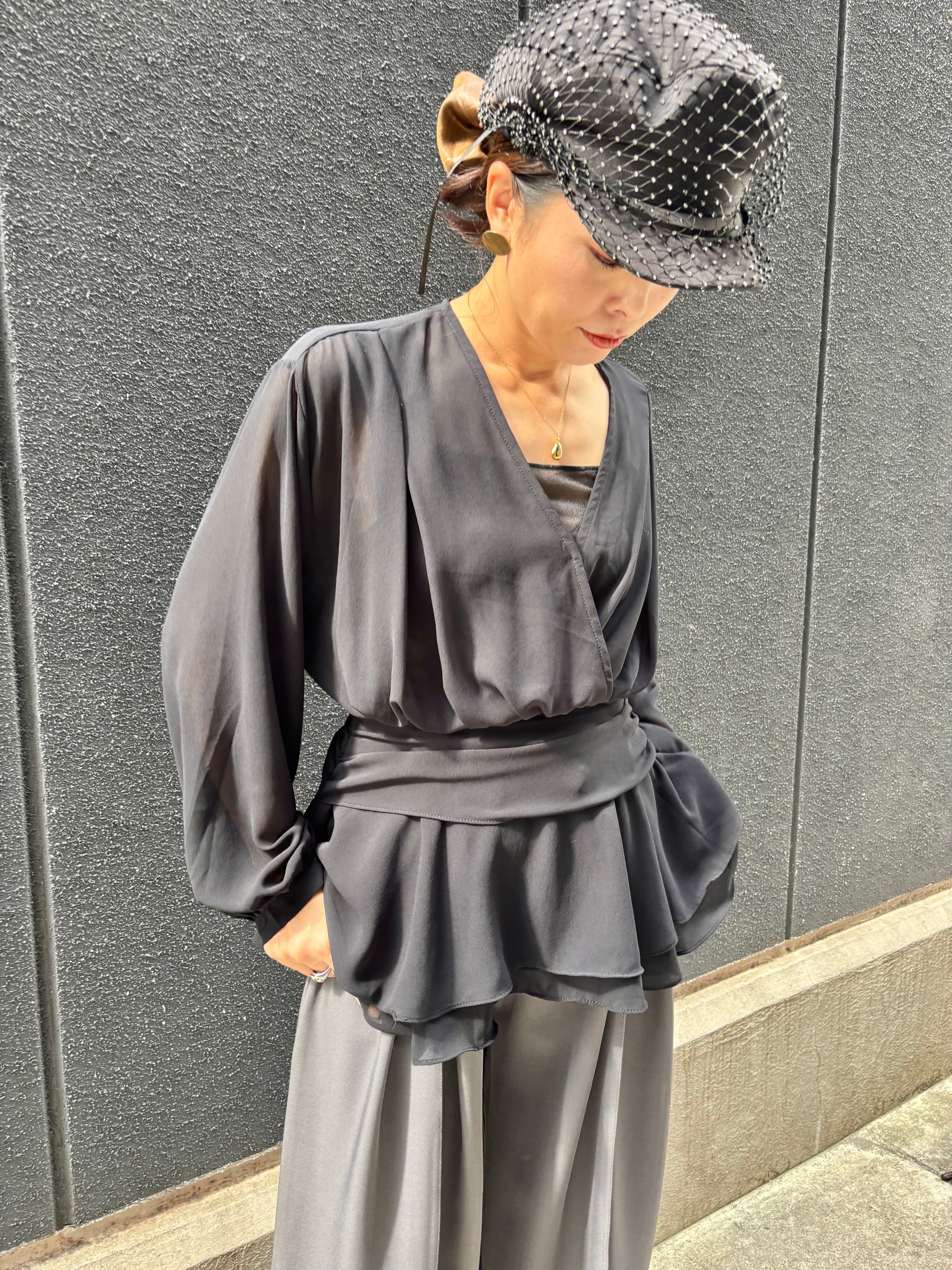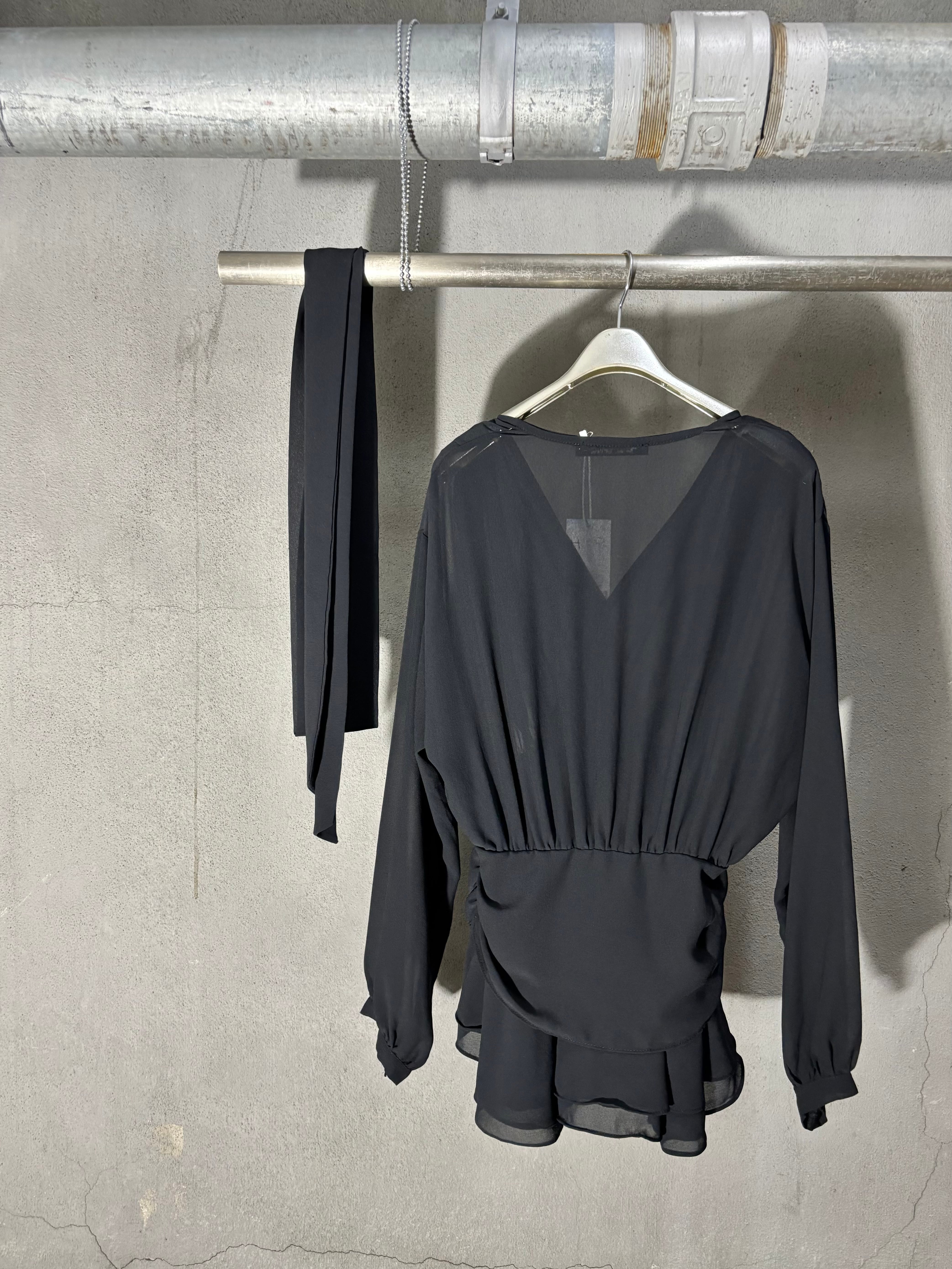 black chiffon cache-coeur V-neck design tunic チュニック シフォン フリル ブラック 黒