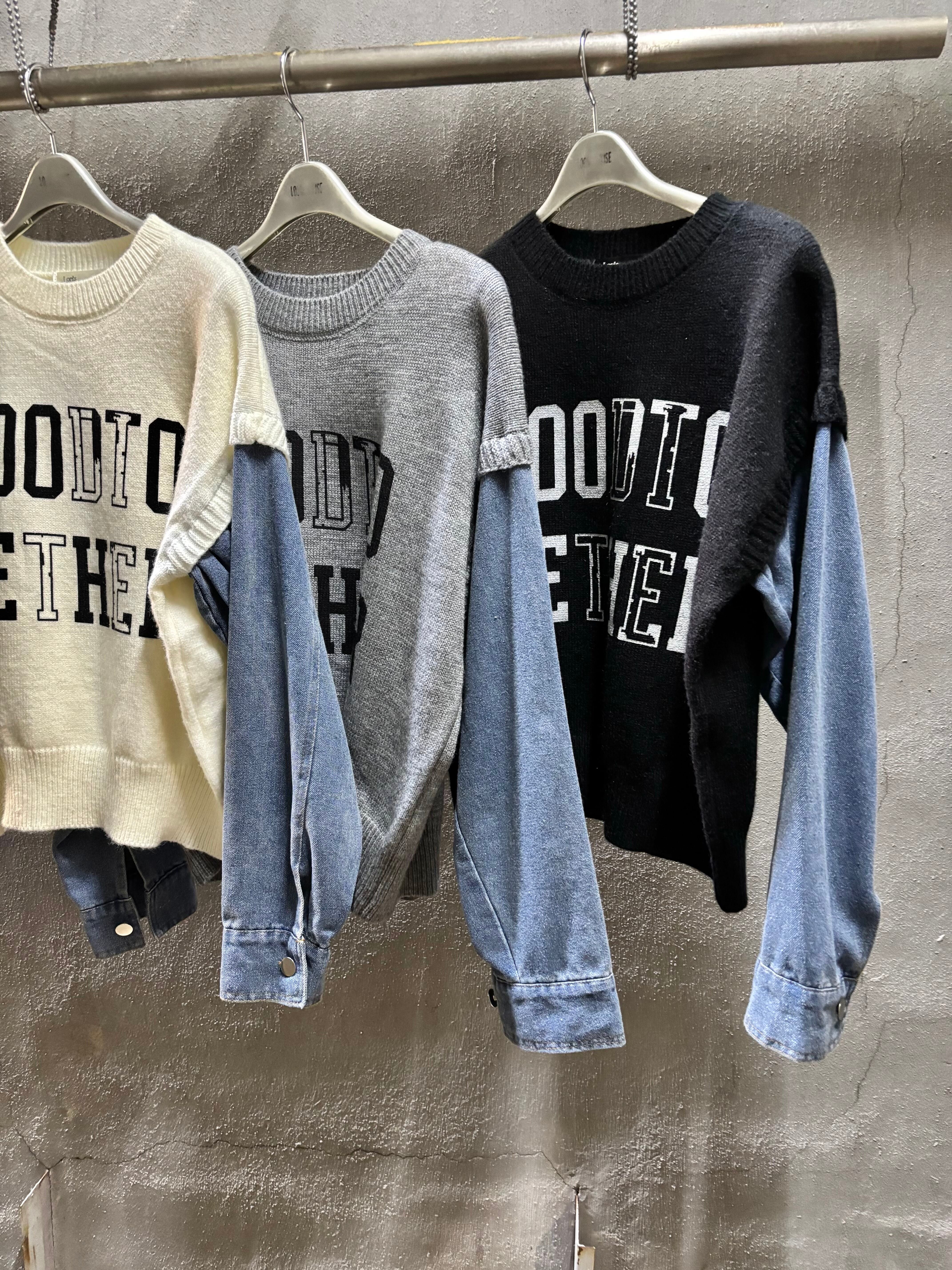 denim sleeve docking design knit tops トップス ニット デニム ドッキング 切替デザイン