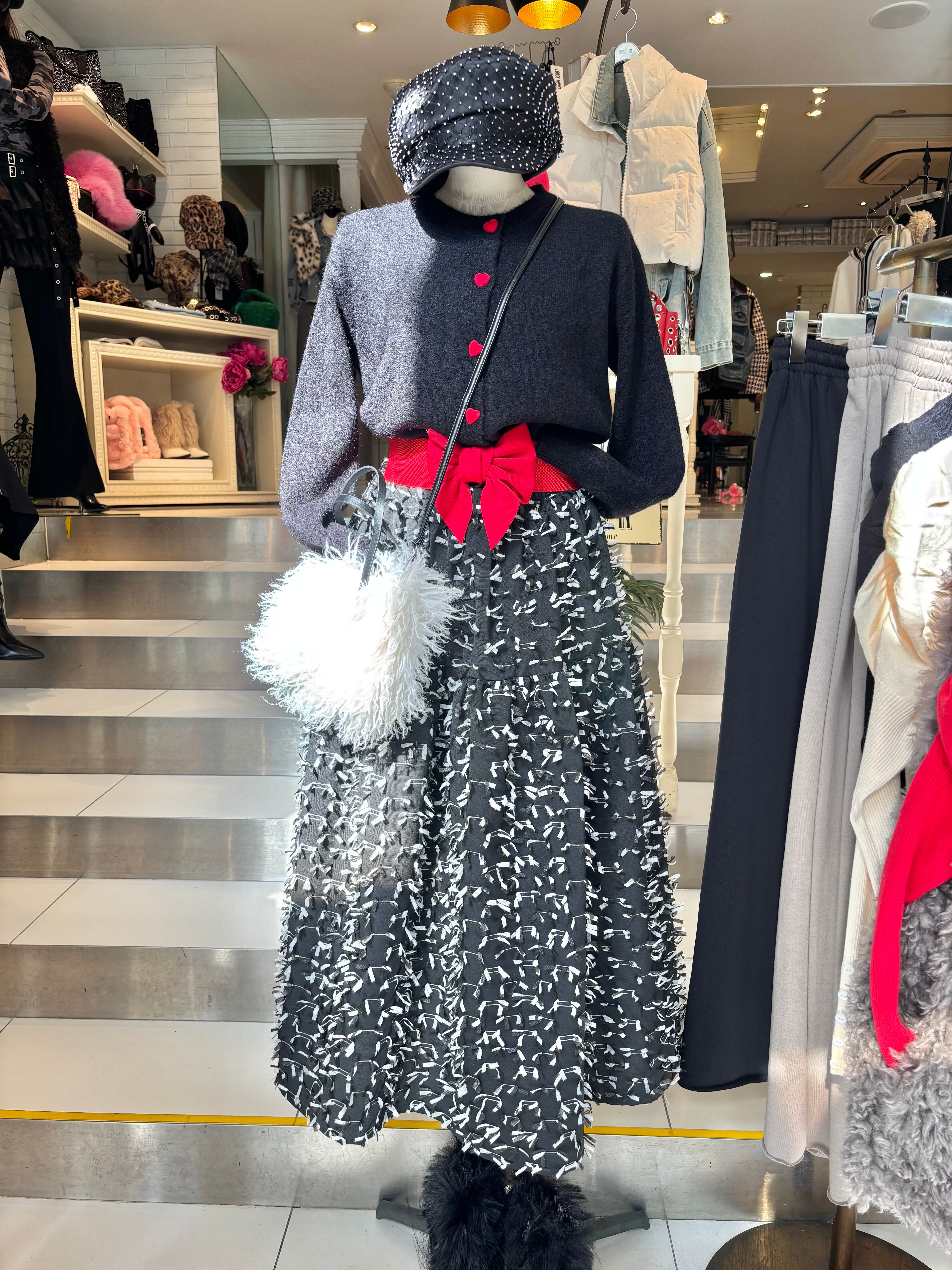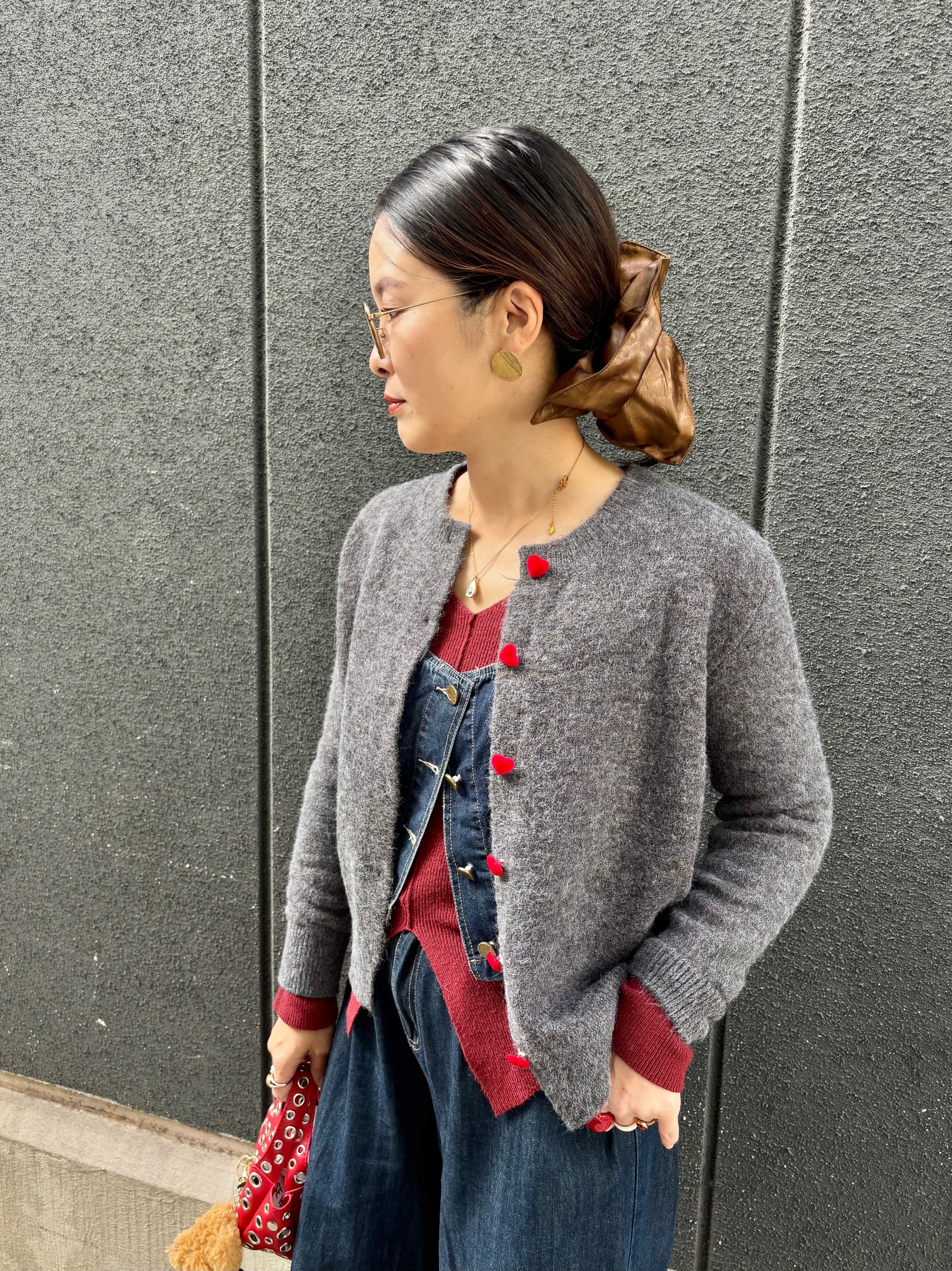 真っ赤なハートのボタンが目を引く、キュートなニットカーディガンです♡
