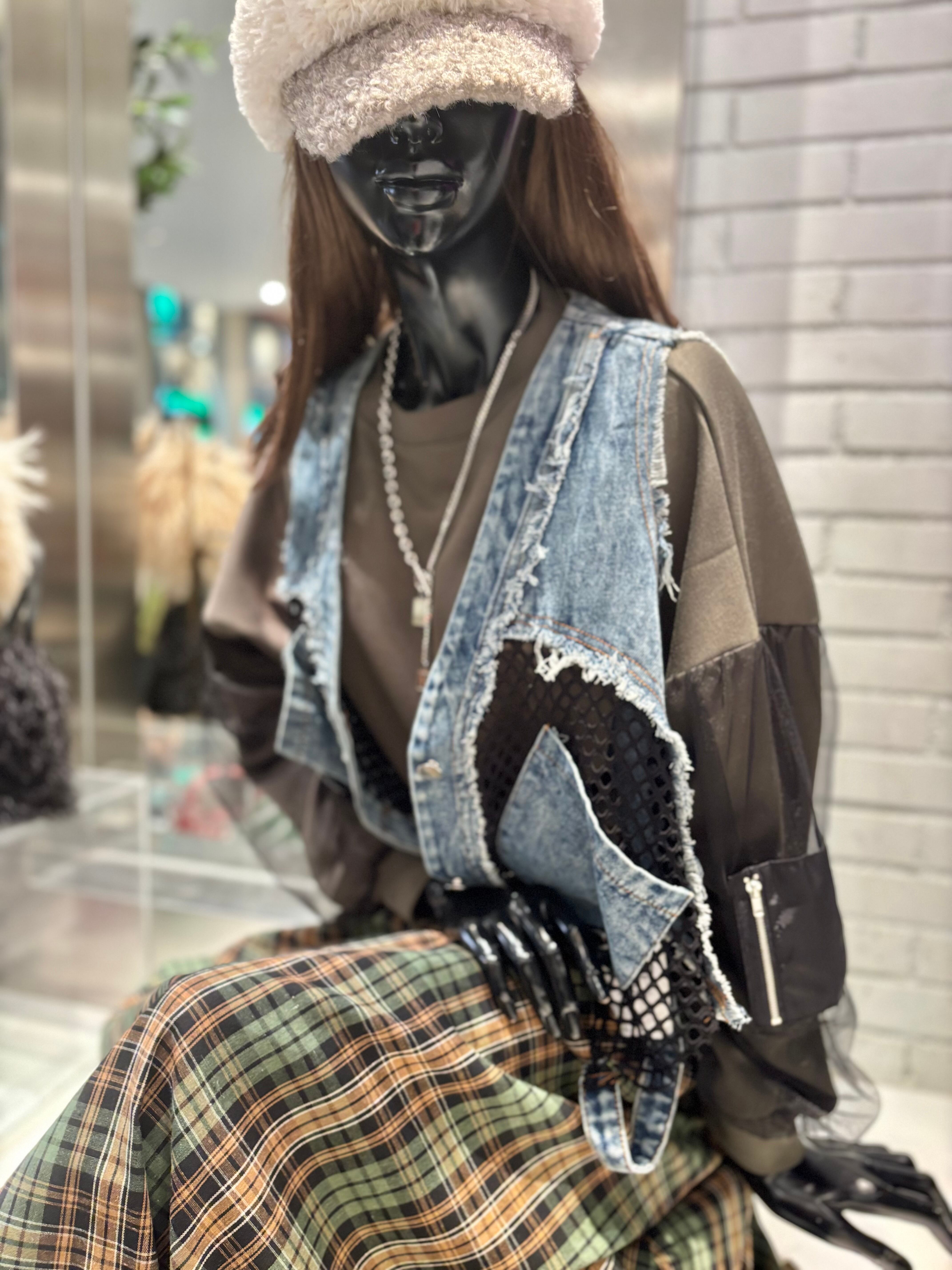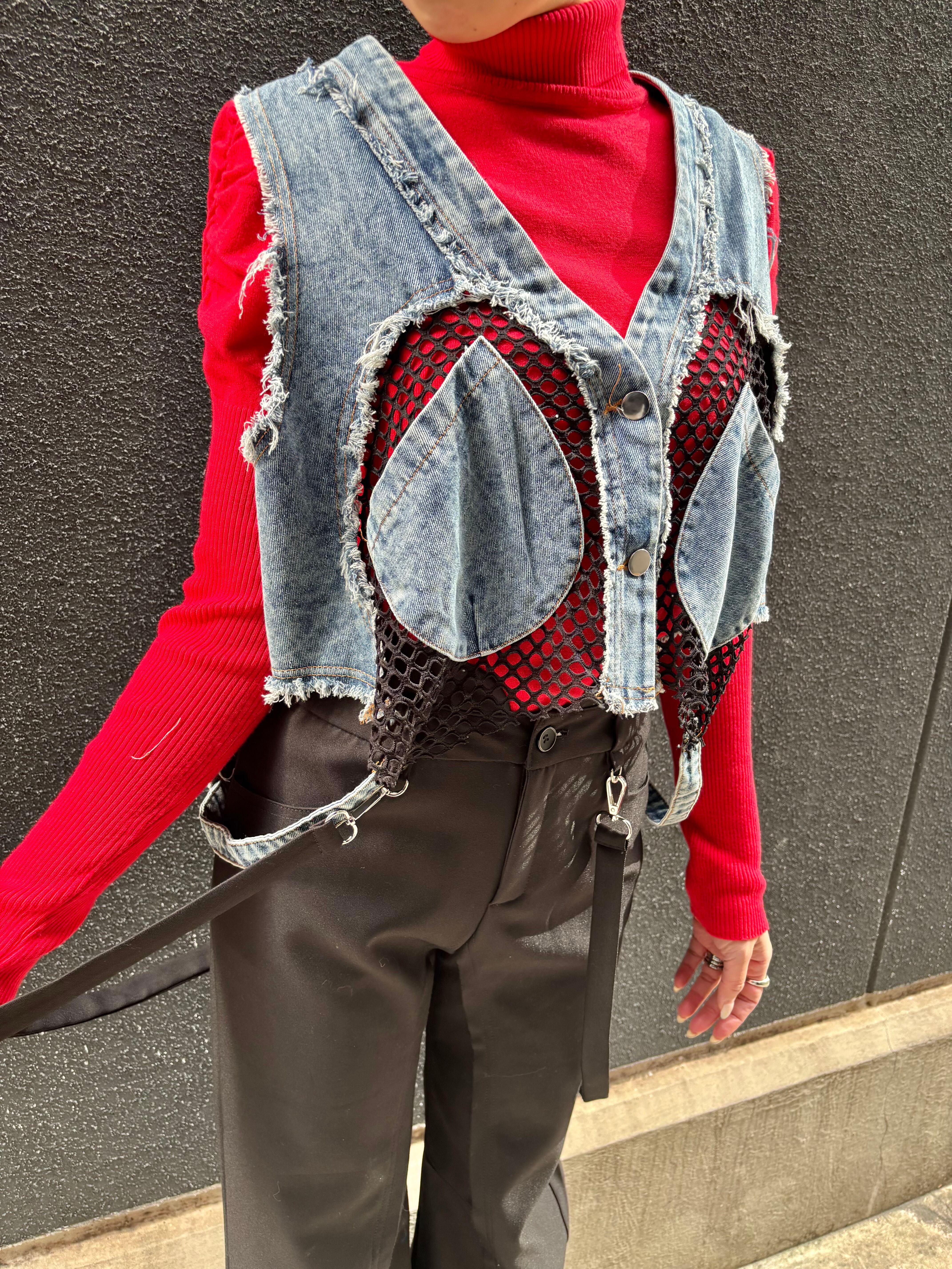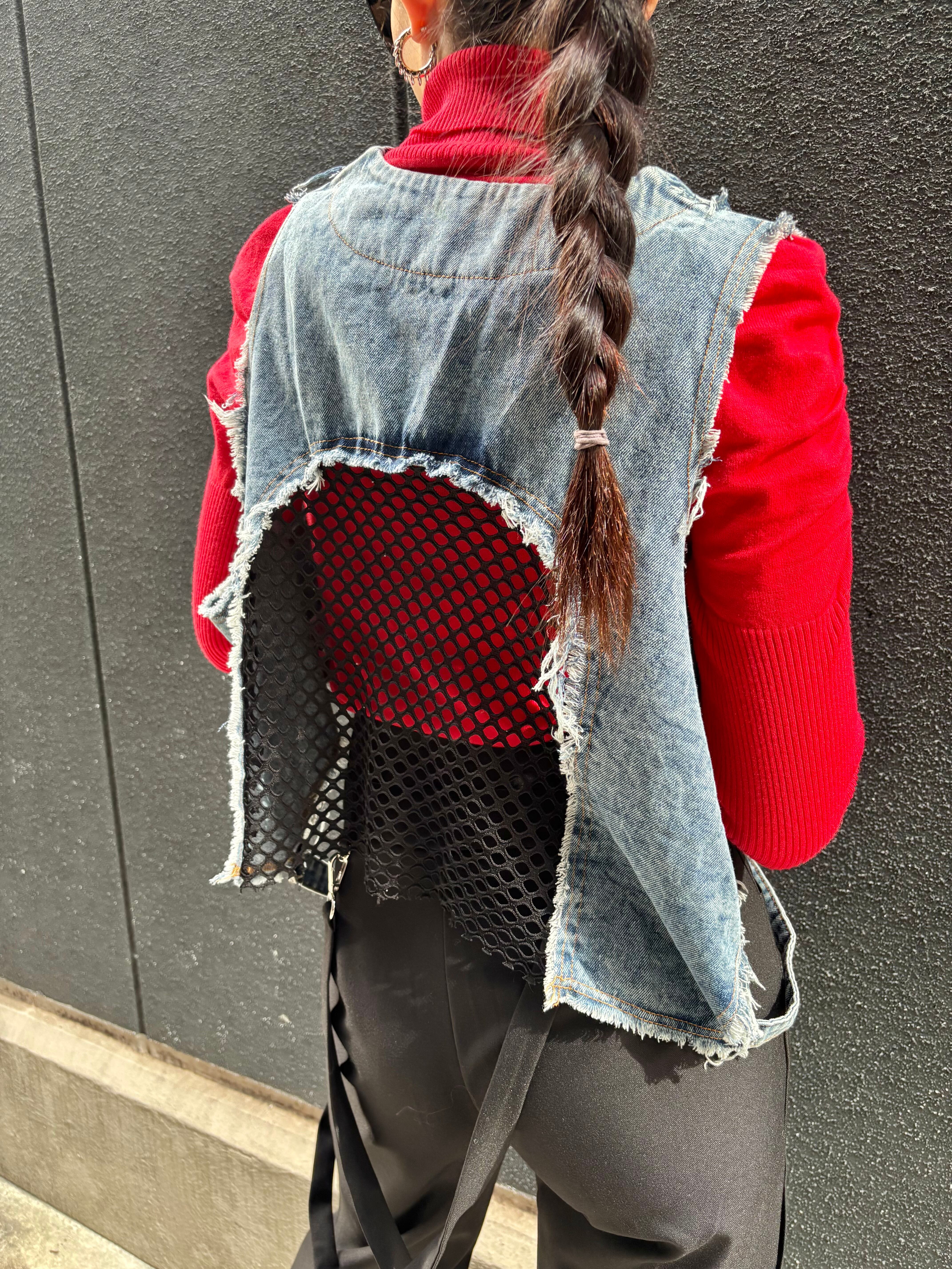 black mesh × denim mix design vest ベスト ジレ デニム メッシュ 切替デザイン 重ね着