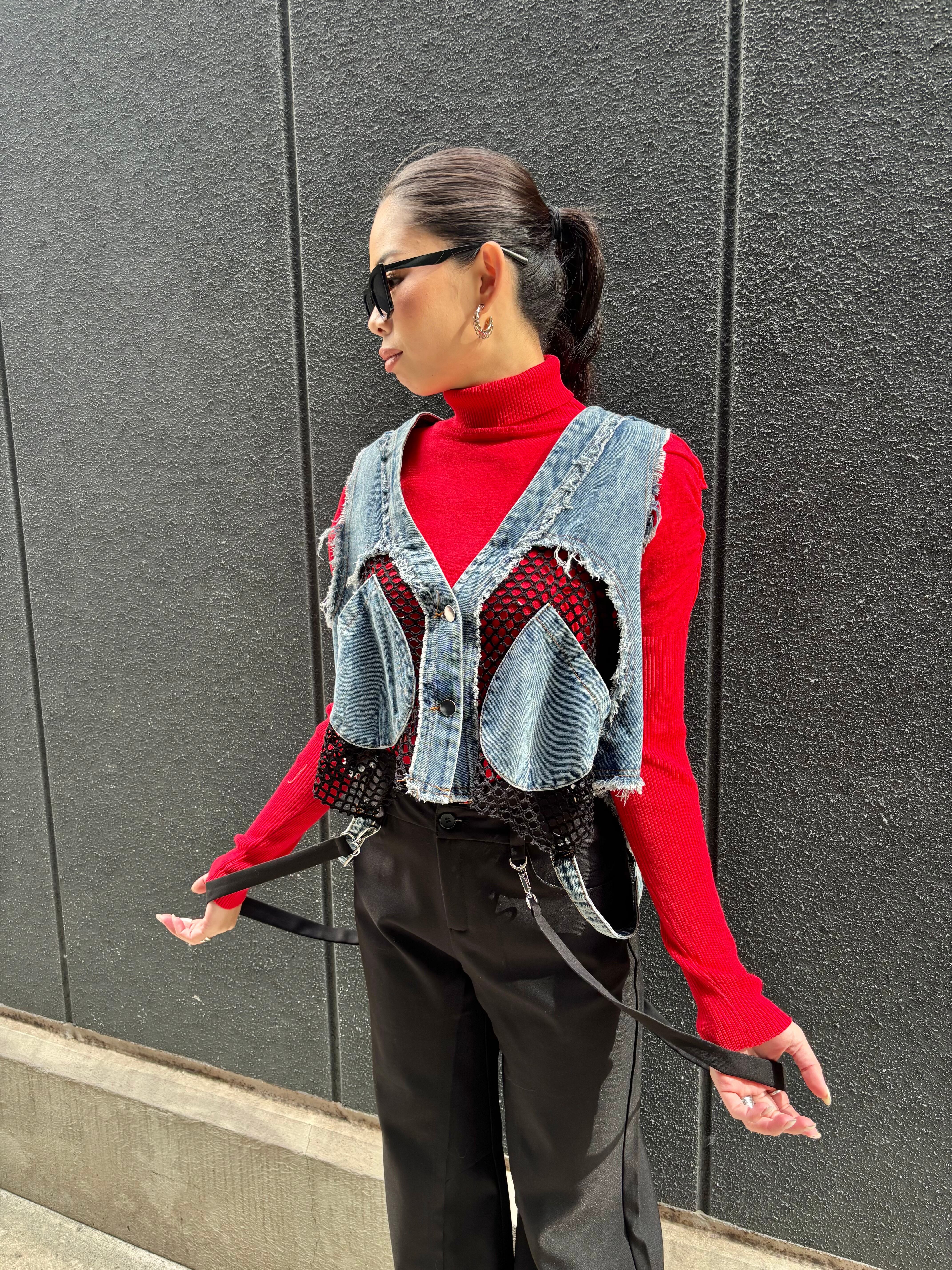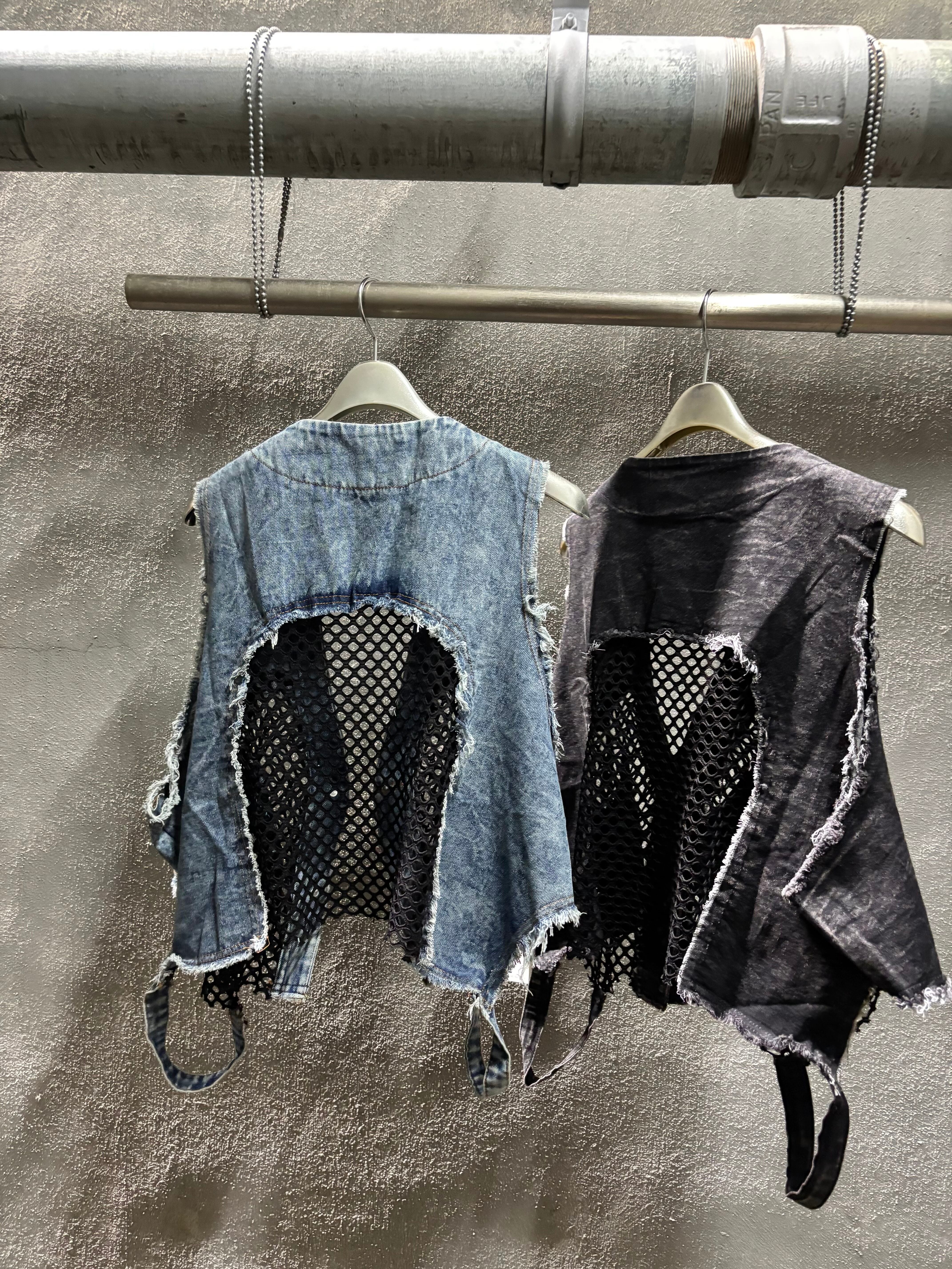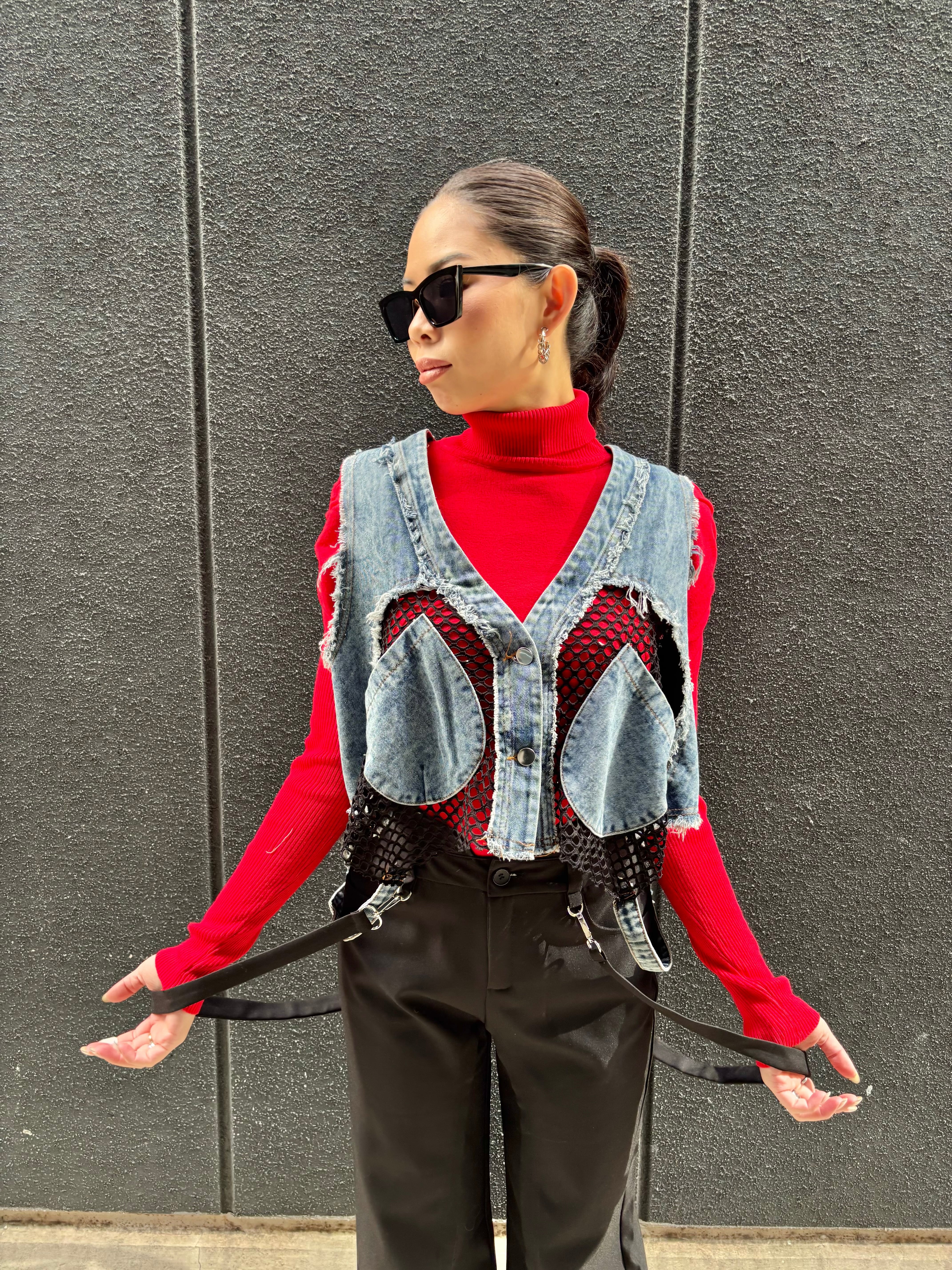 black mesh × denim mix design vest ベスト ジレ デニム メッシュ 切替デザイン 重ね着
