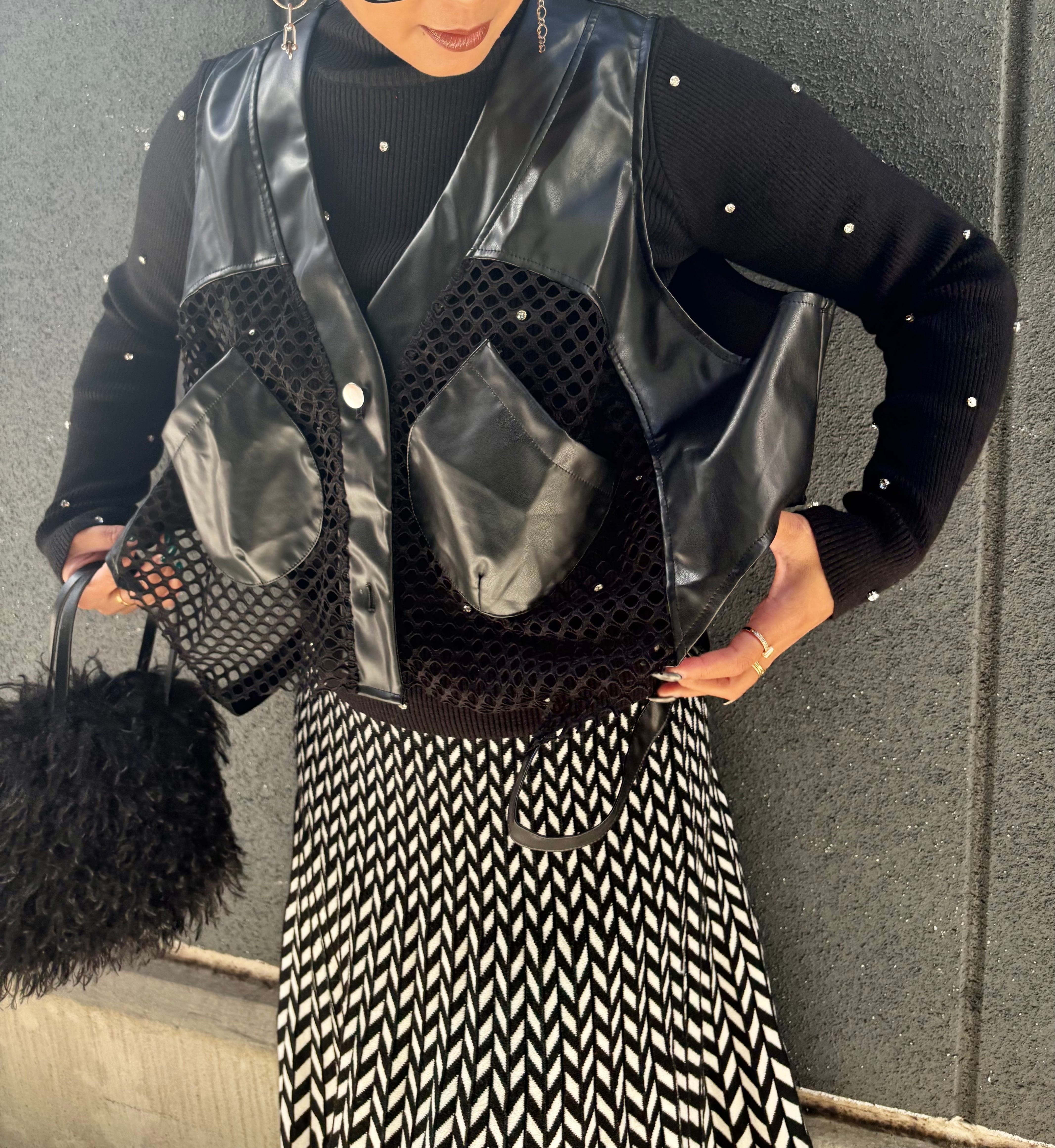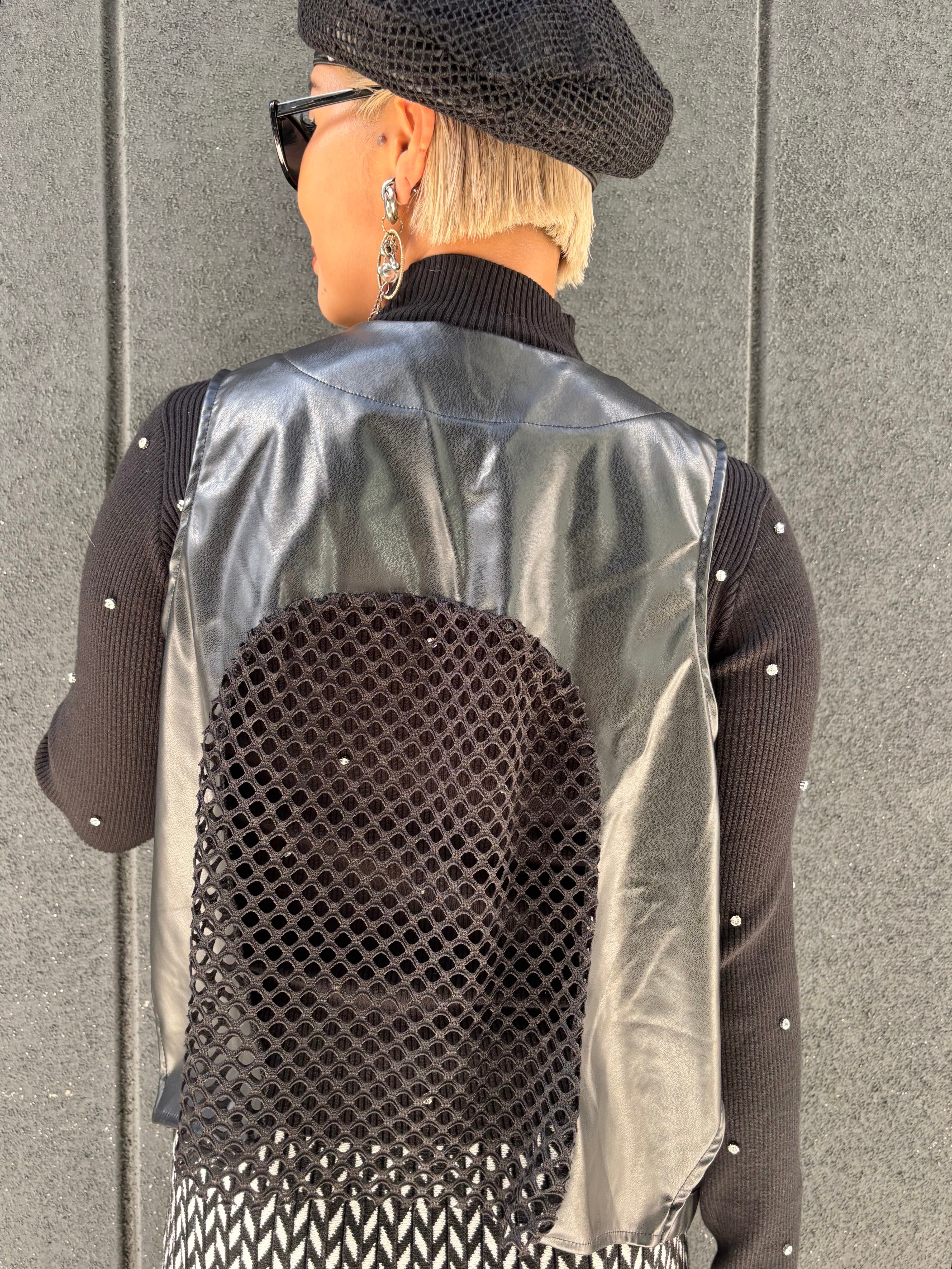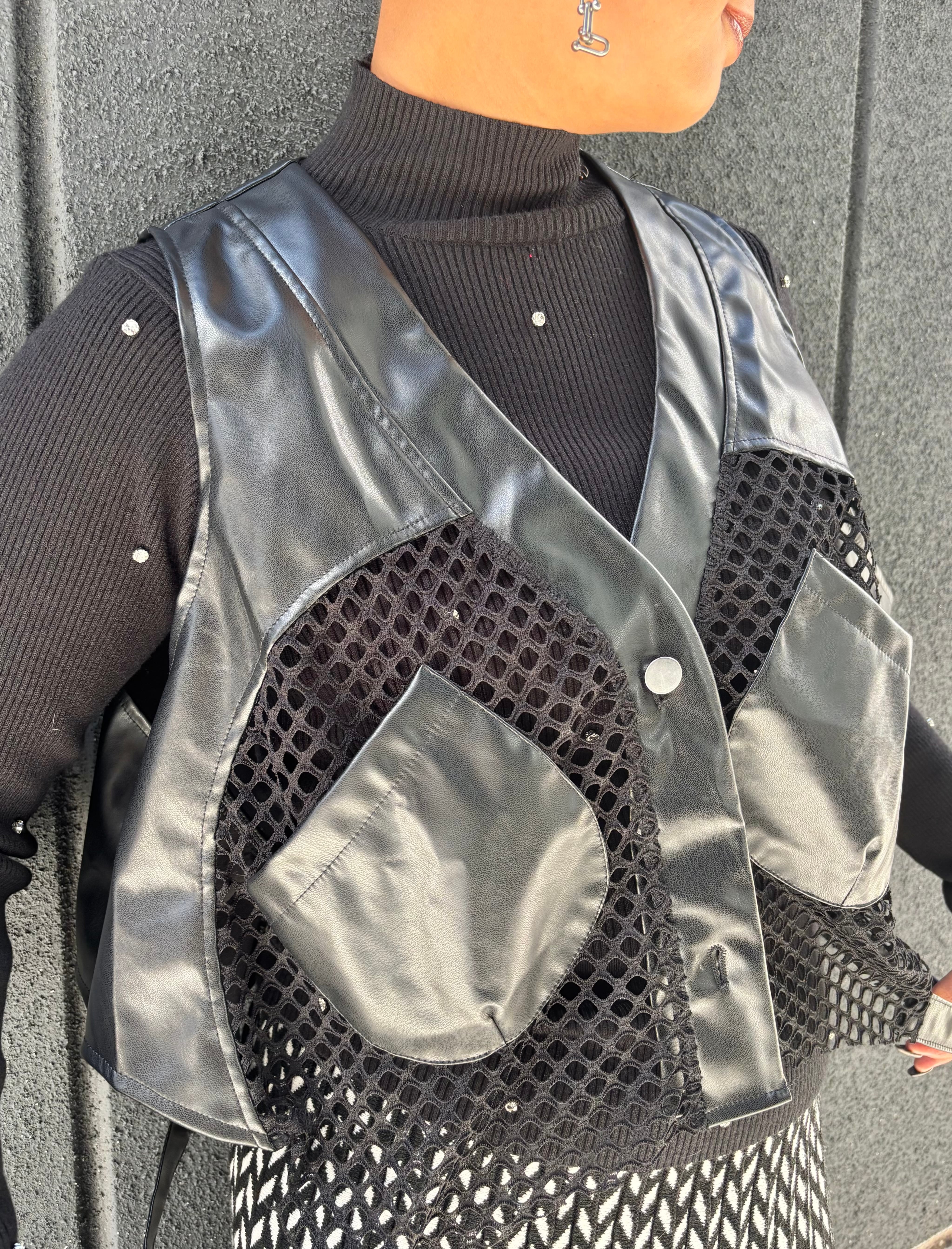 black mesh × eco leather mix design vest ベスト ジレ メッシュ エコレザー 合皮 切替デザイン 重ね着