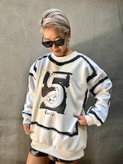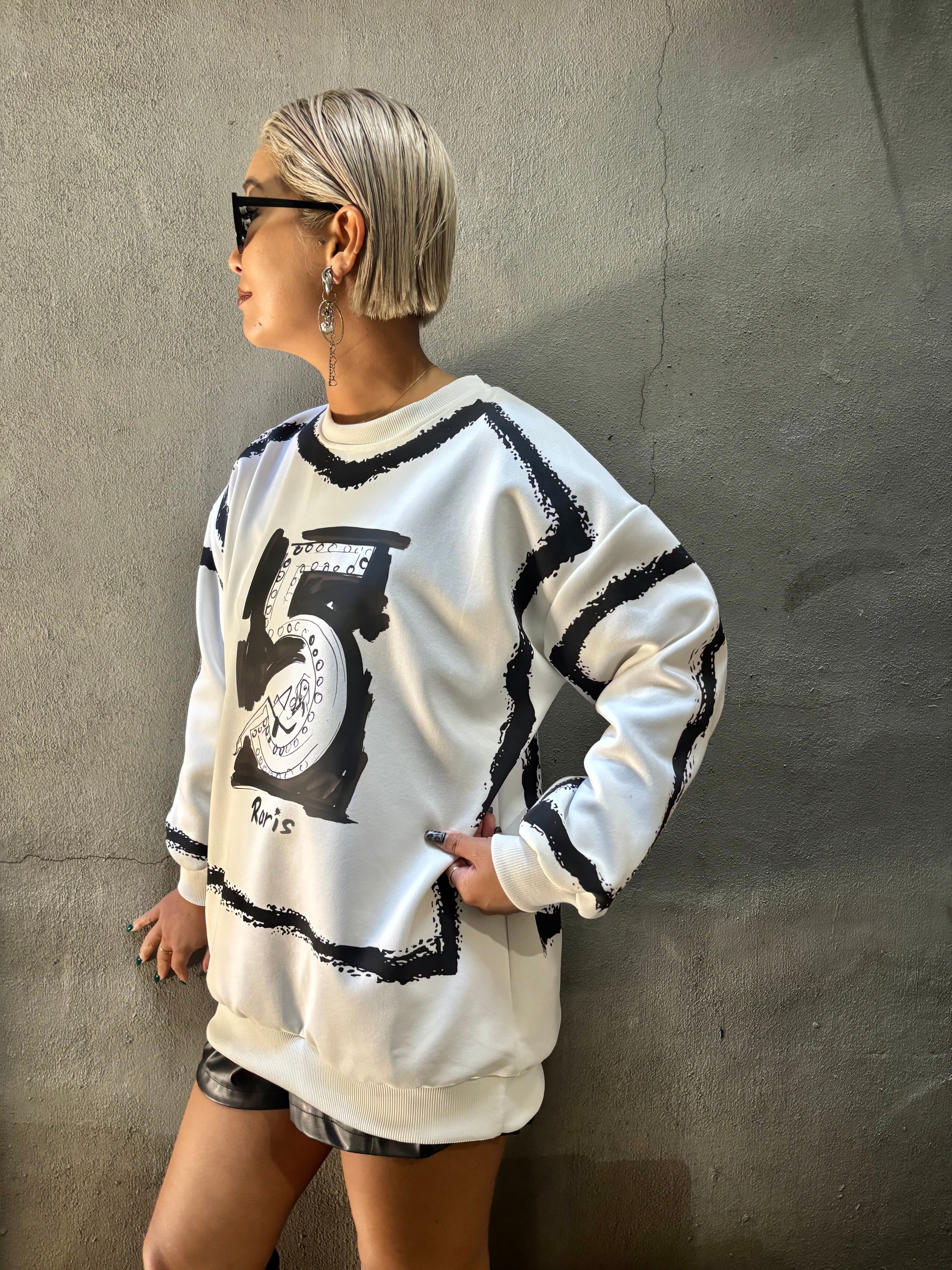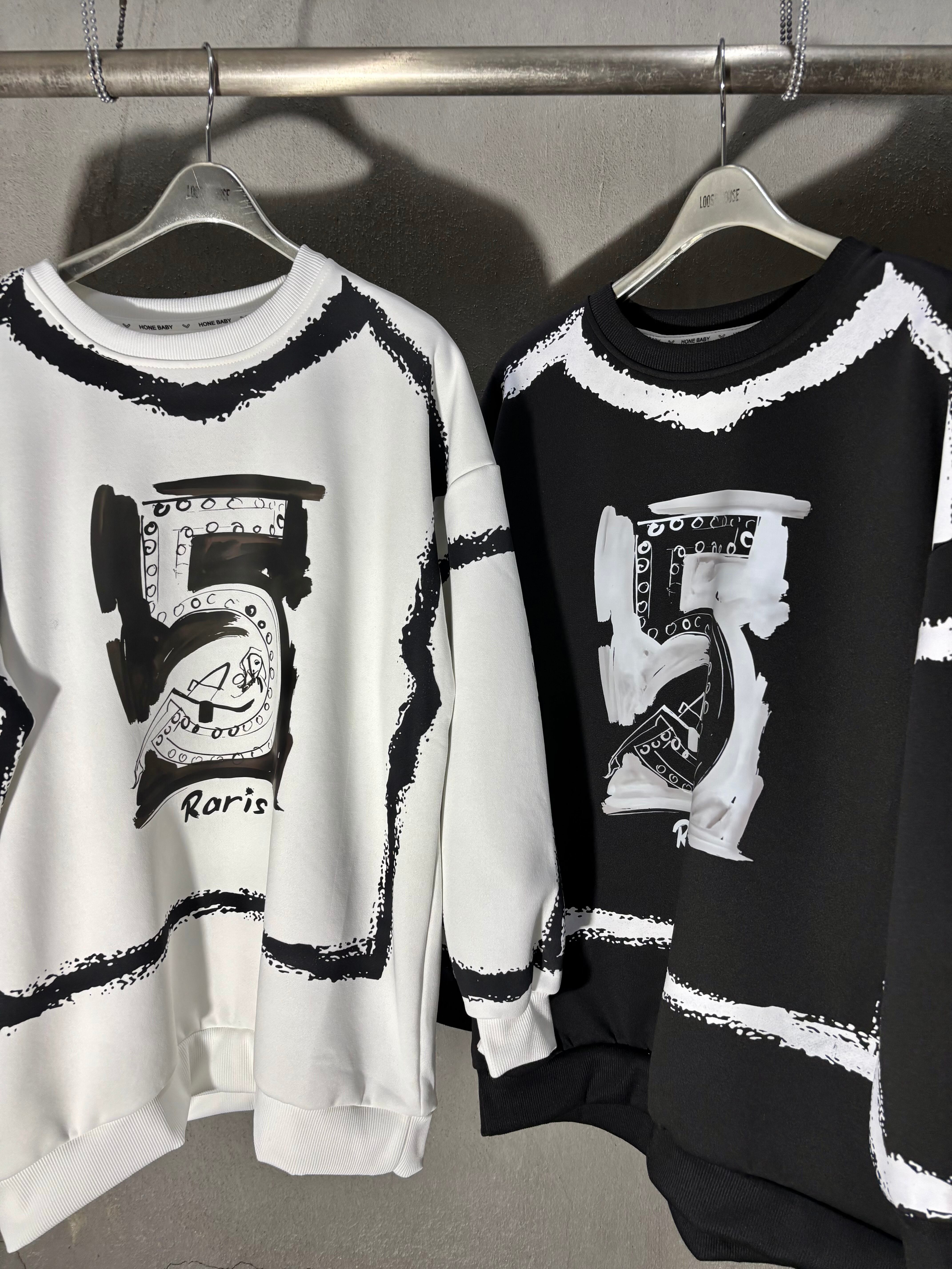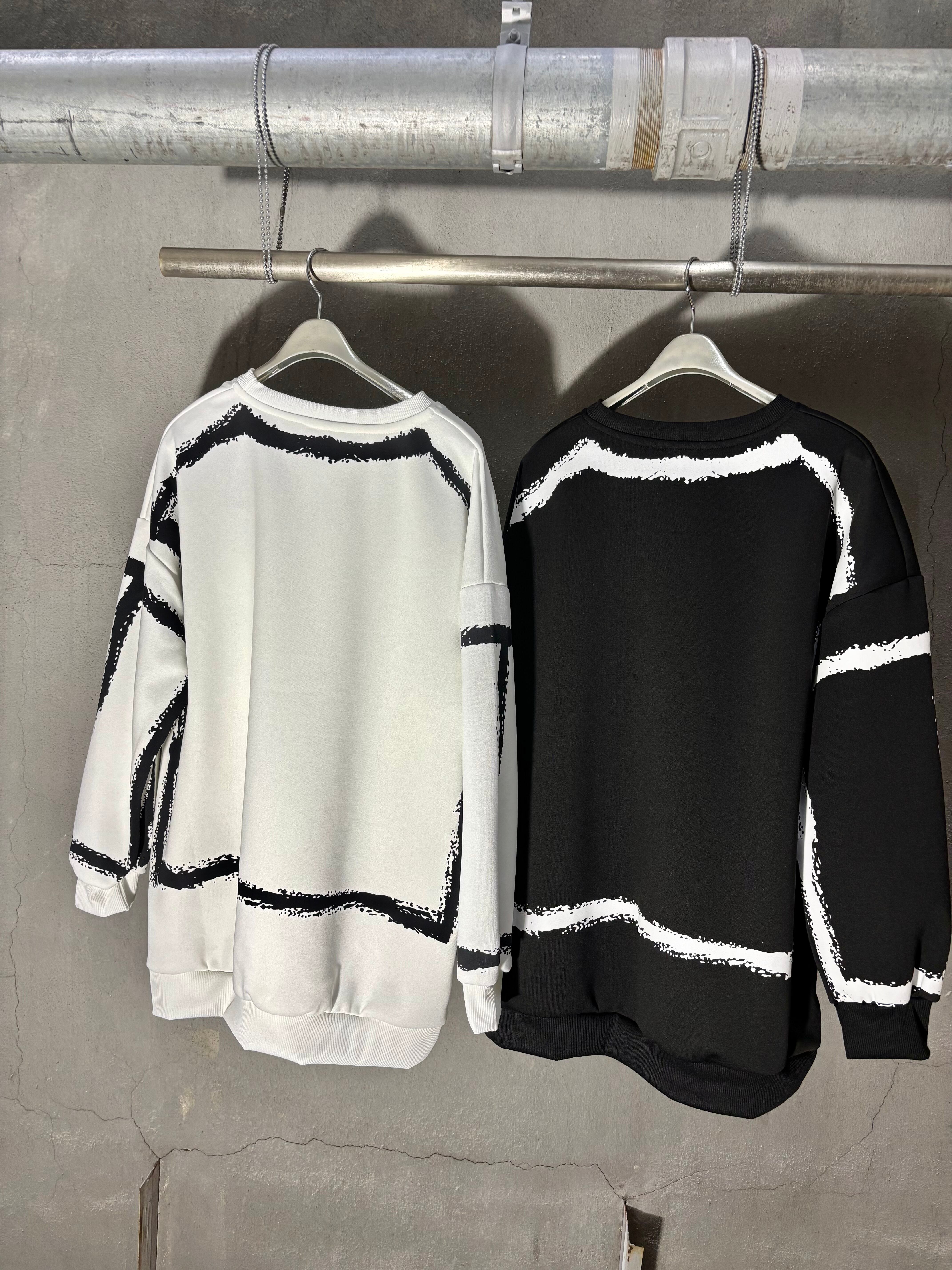bi-color 〝5〟print over size trainer トレーナー トップス オーバーサイズ プリント ペイント バイカラー 白黒