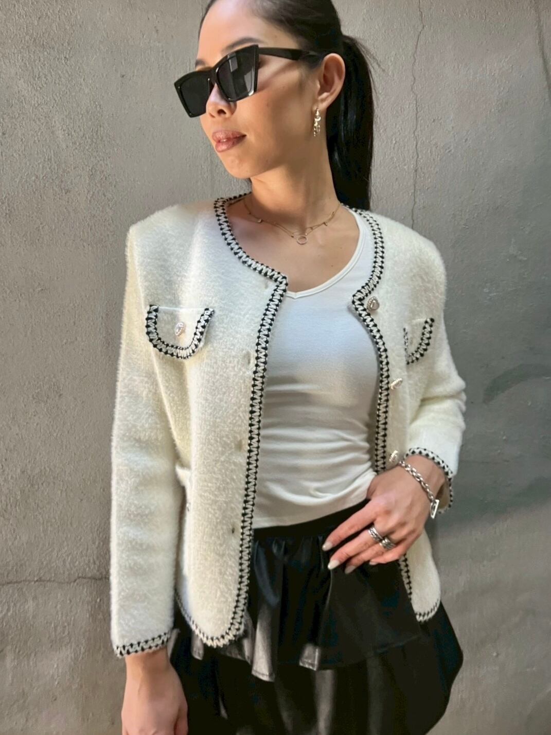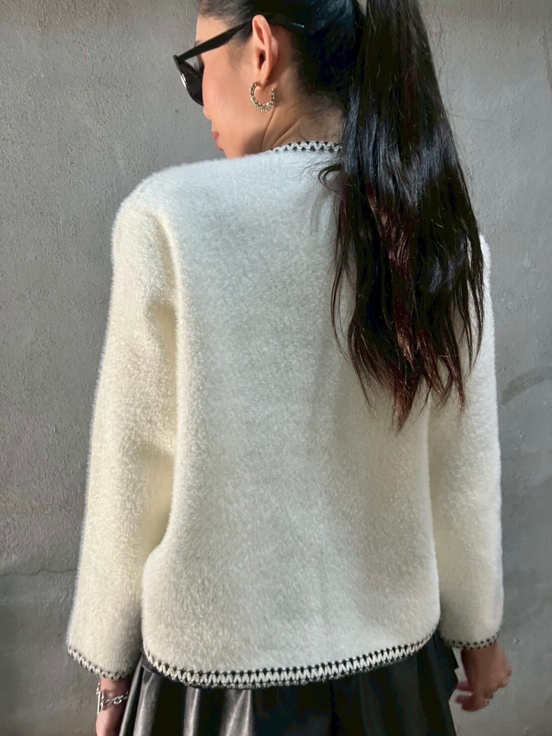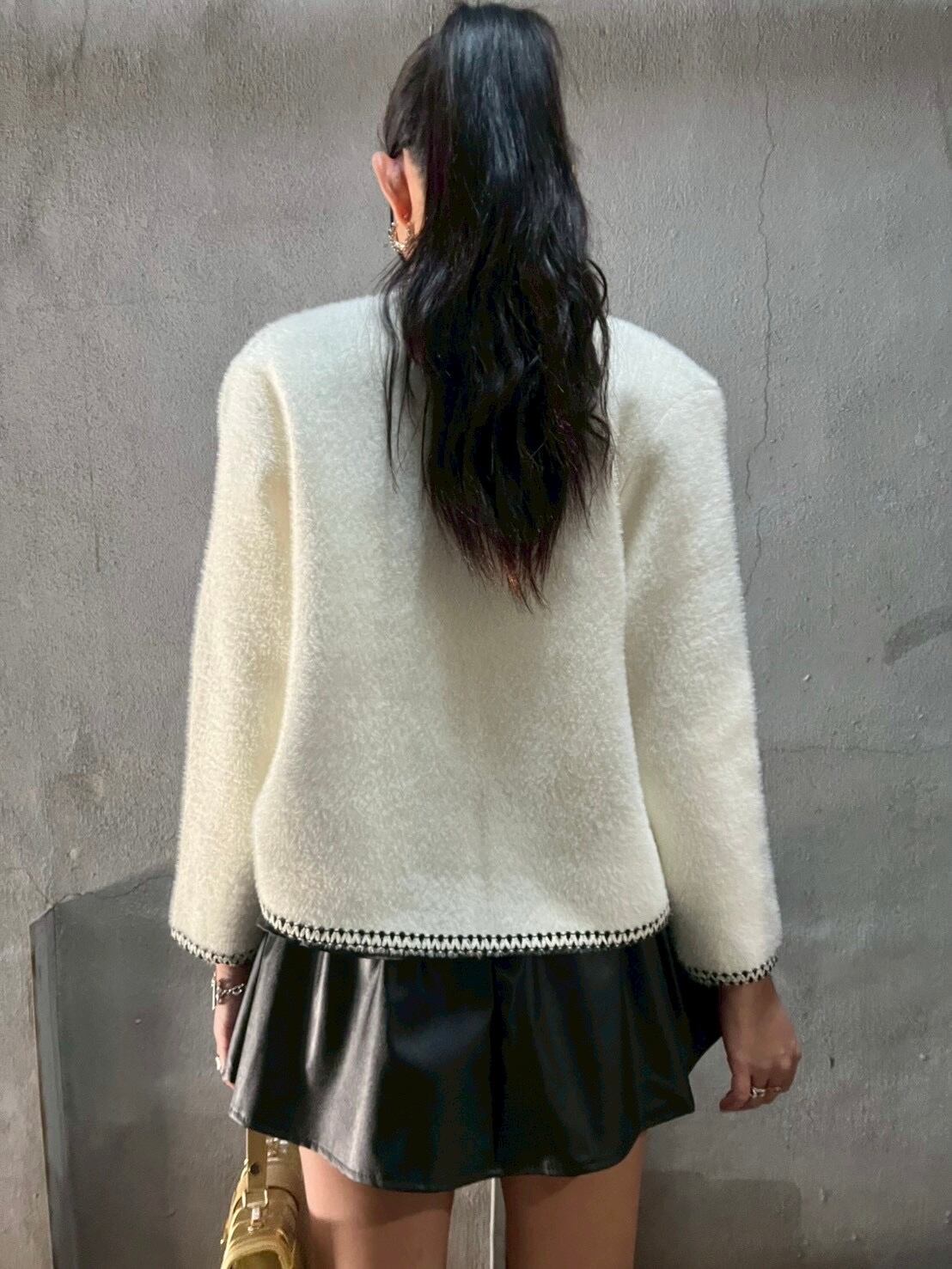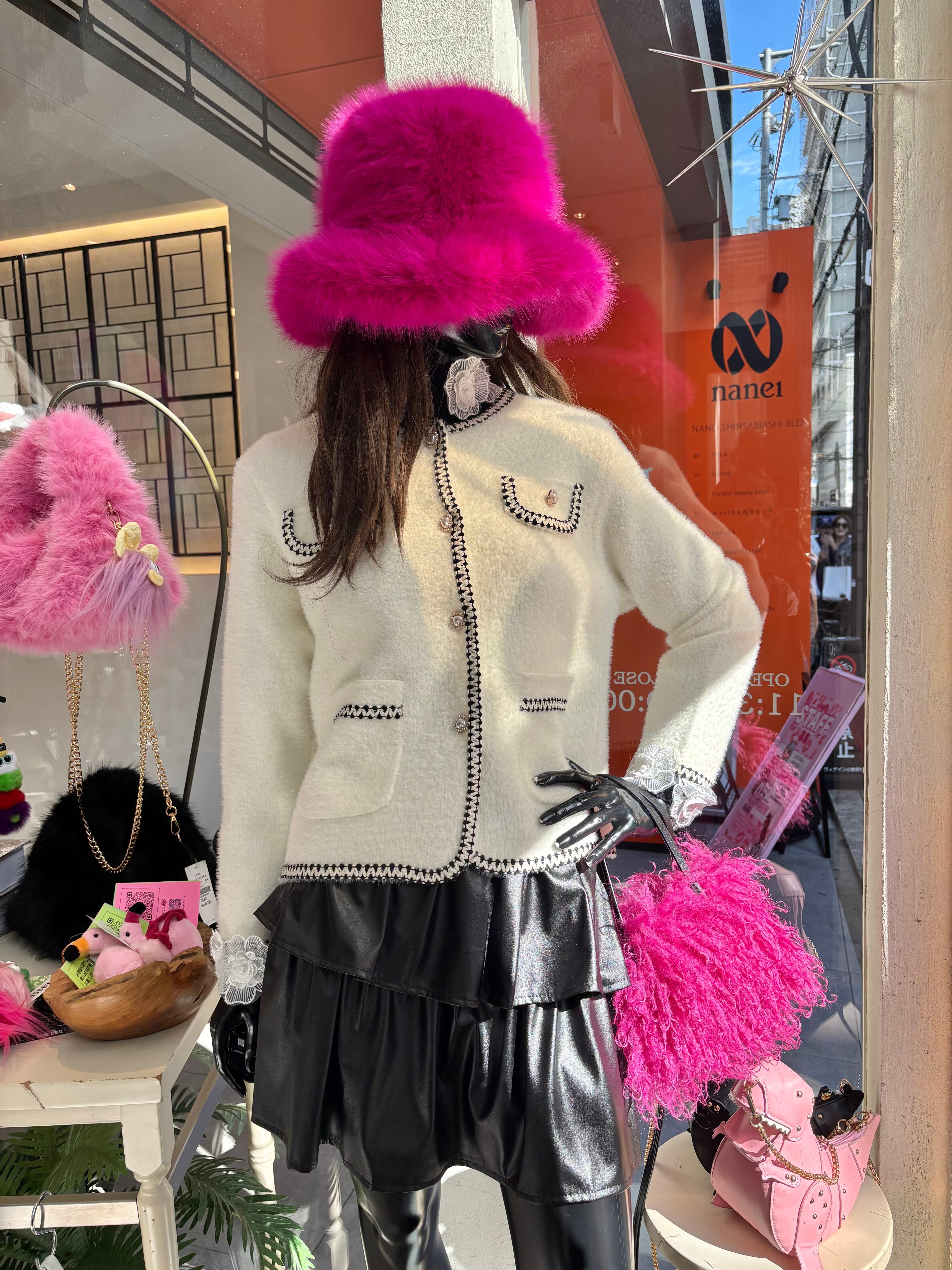 braid trimming C-neck design shaggy knit jacket ジャケット シャギー ニット Cネック ハート パール ボタン きれいめ