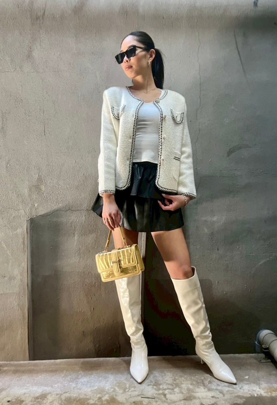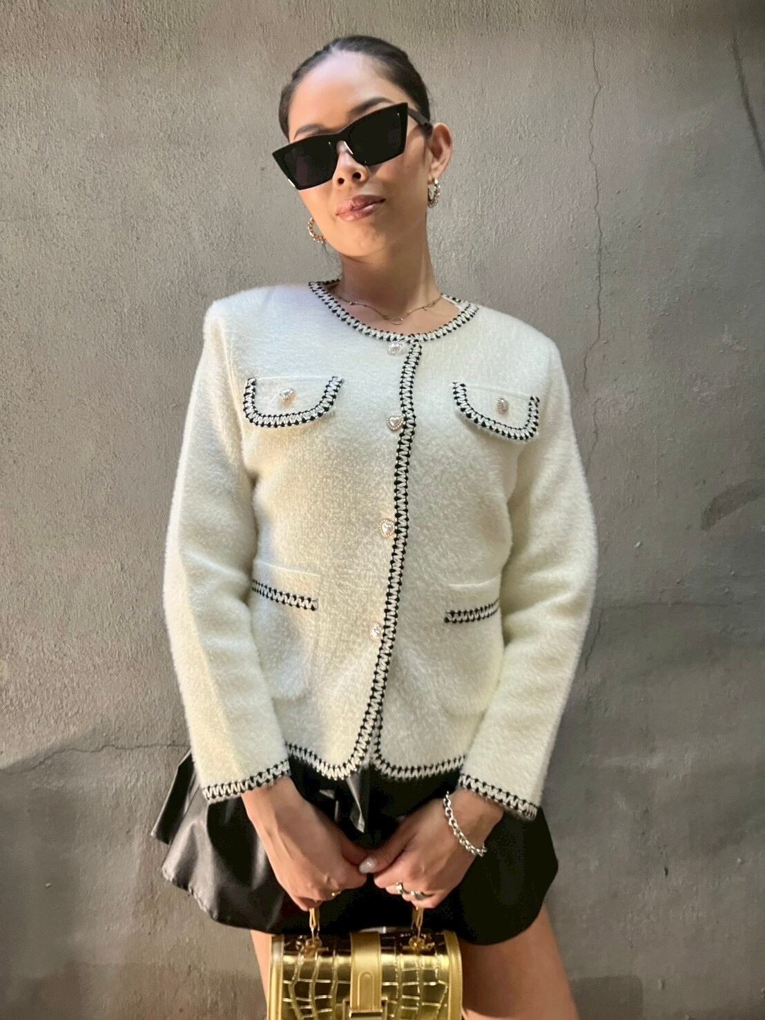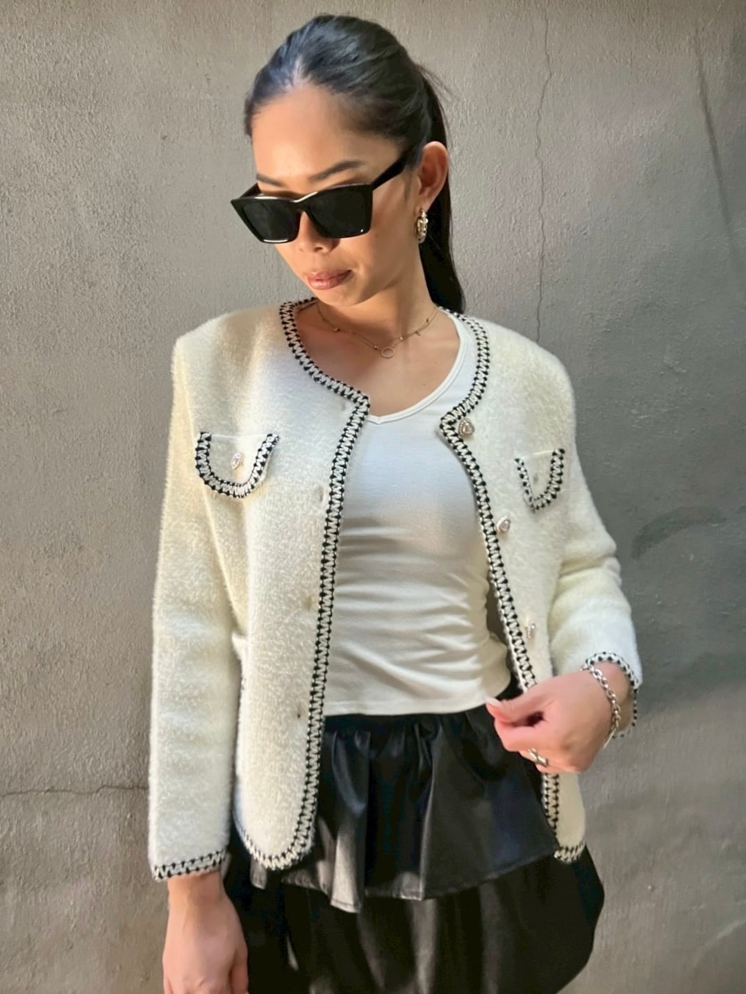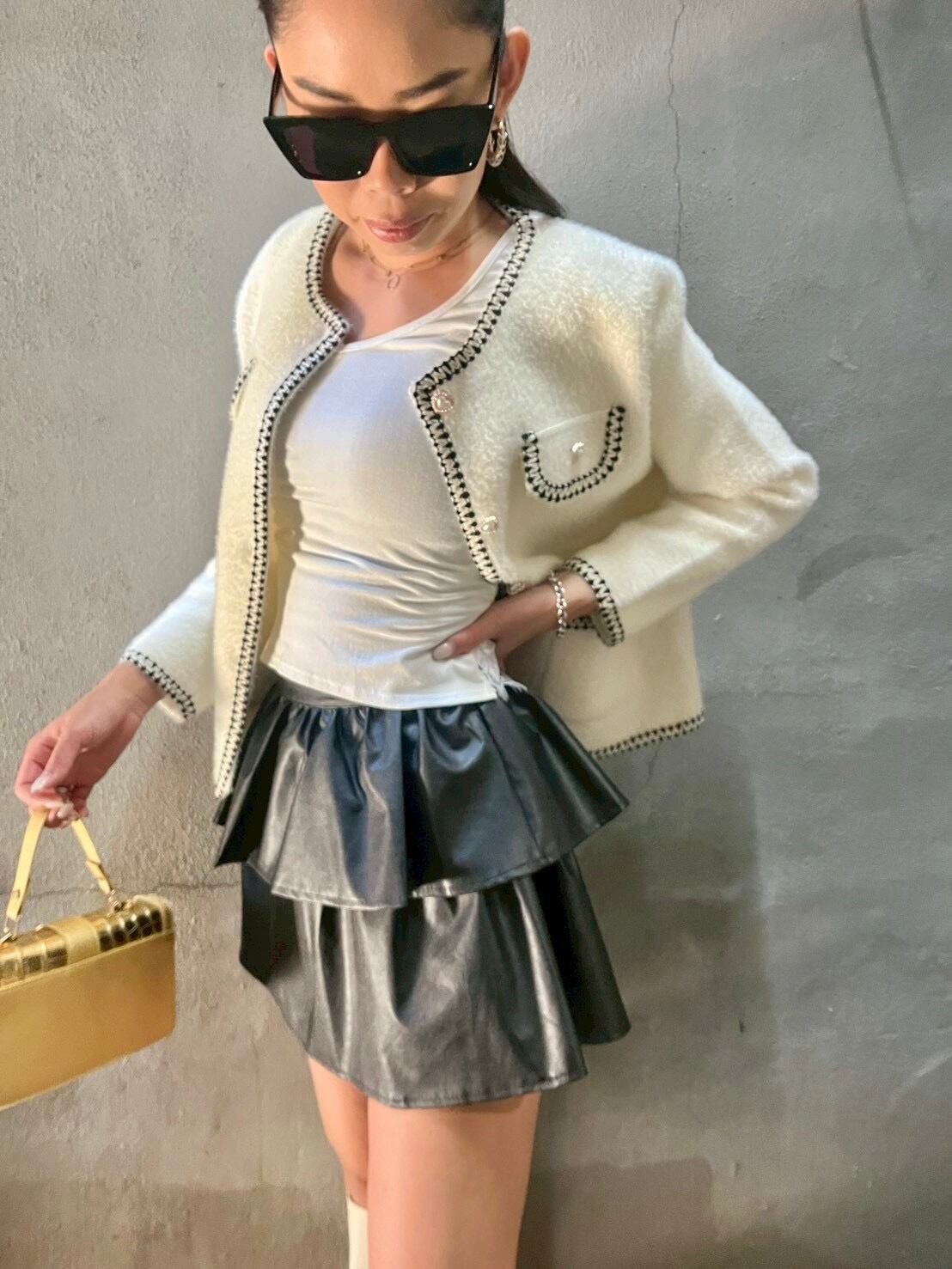 braid trimming C-neck design shaggy knit jacket ジャケット シャギー ニット Cネック ハート パール ボタン きれいめ