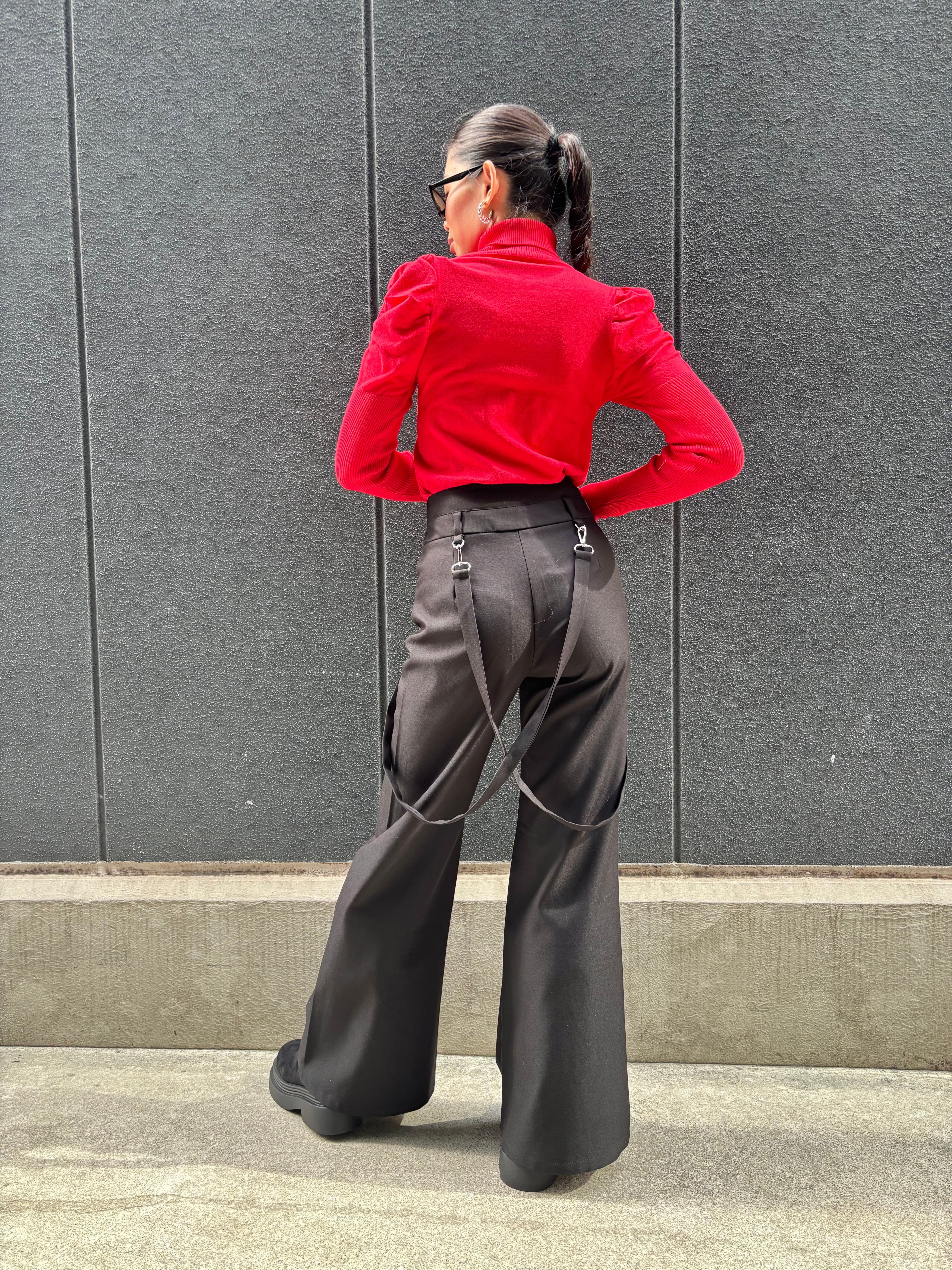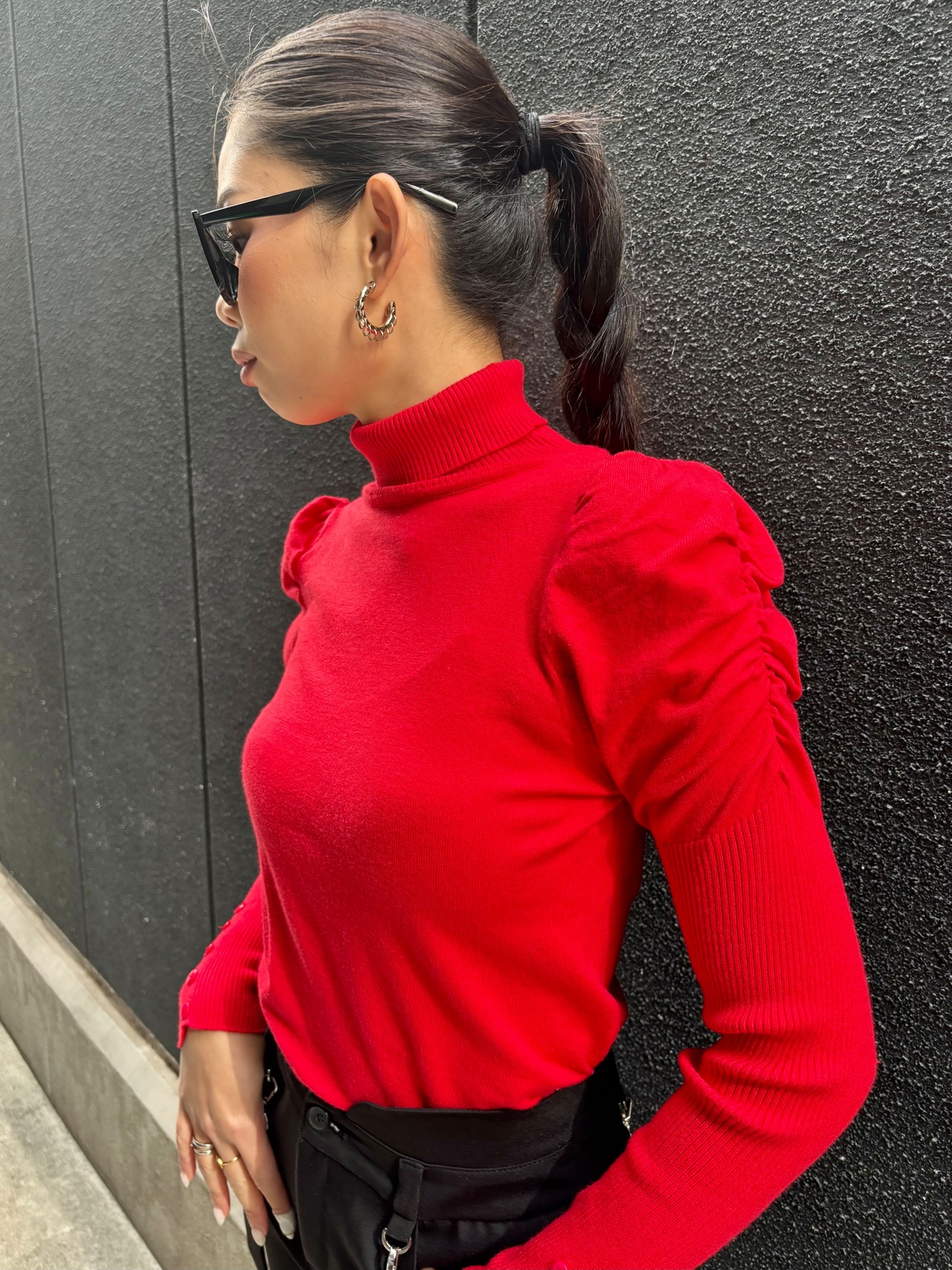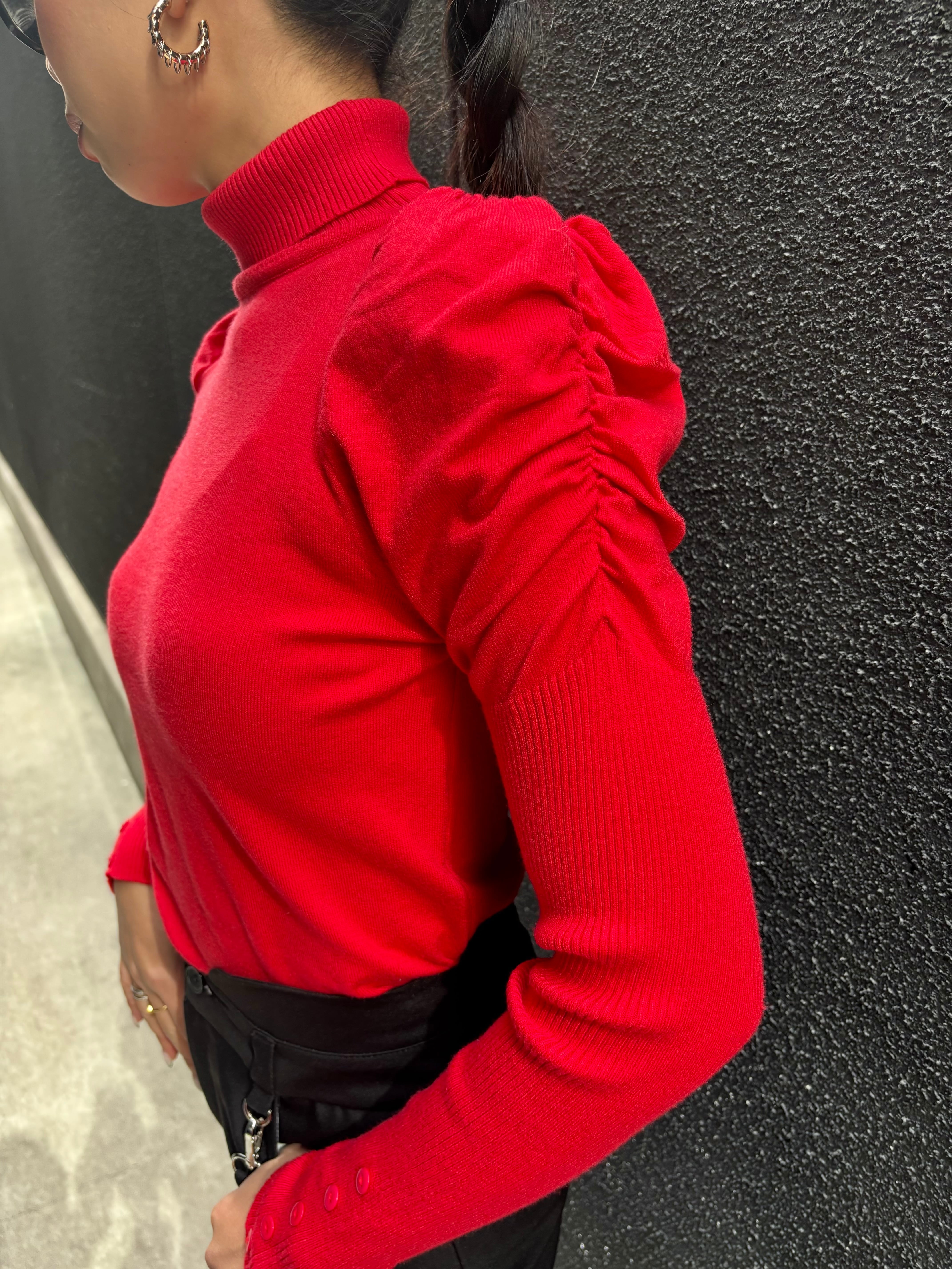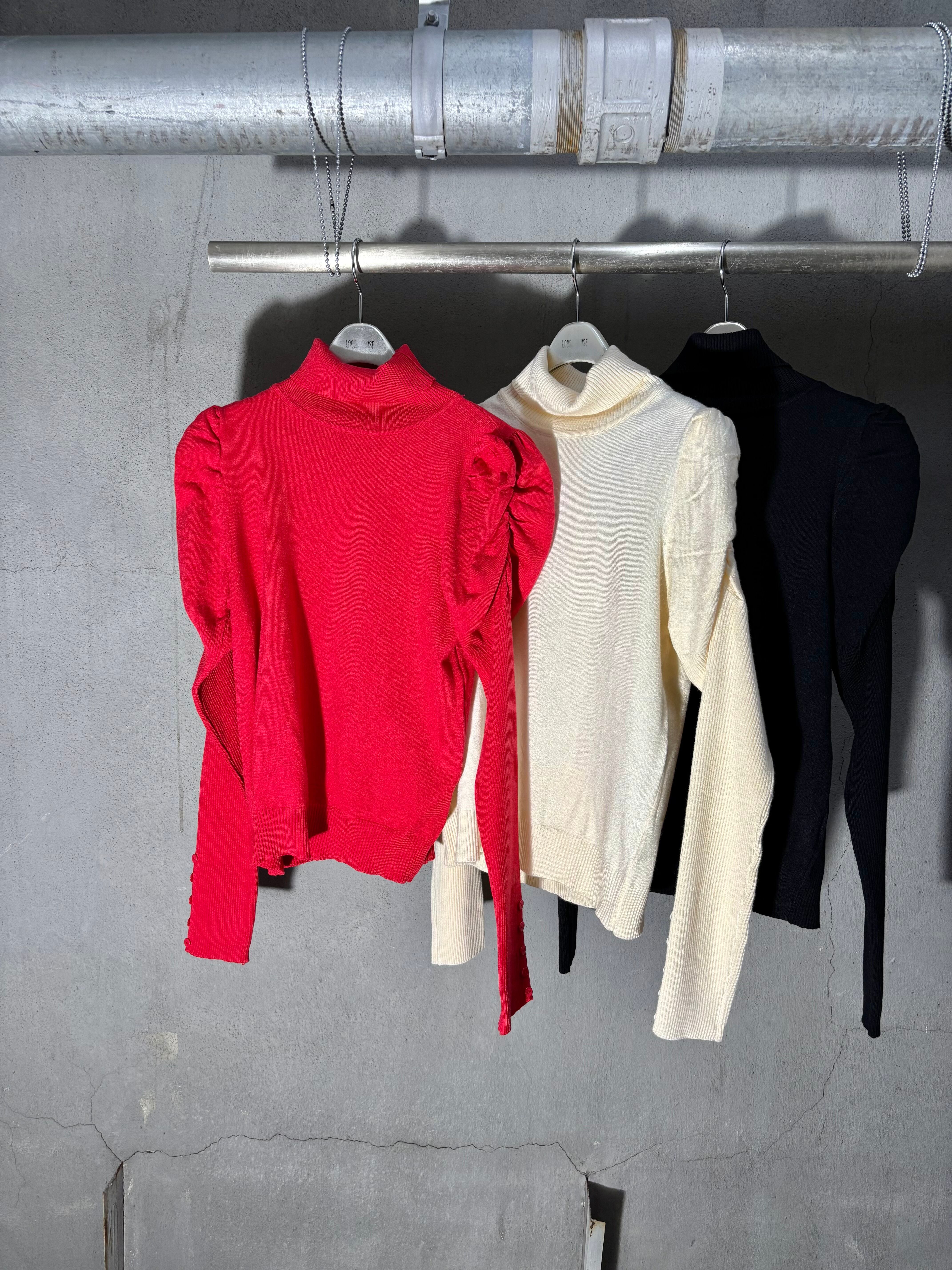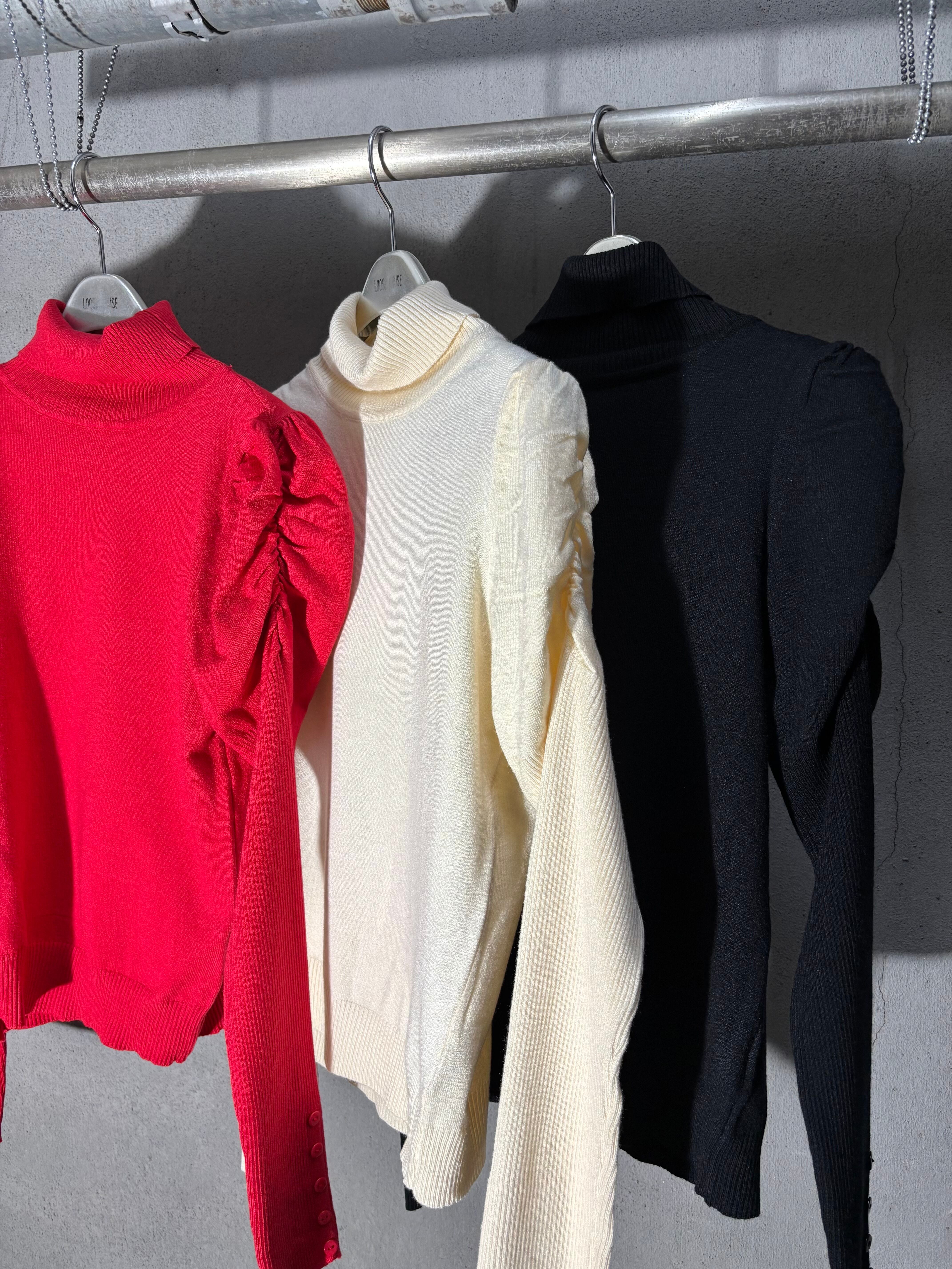 gather sleeve design soft knit tops トップス ニット 薄手 ギャザー スリーブ ハイネック