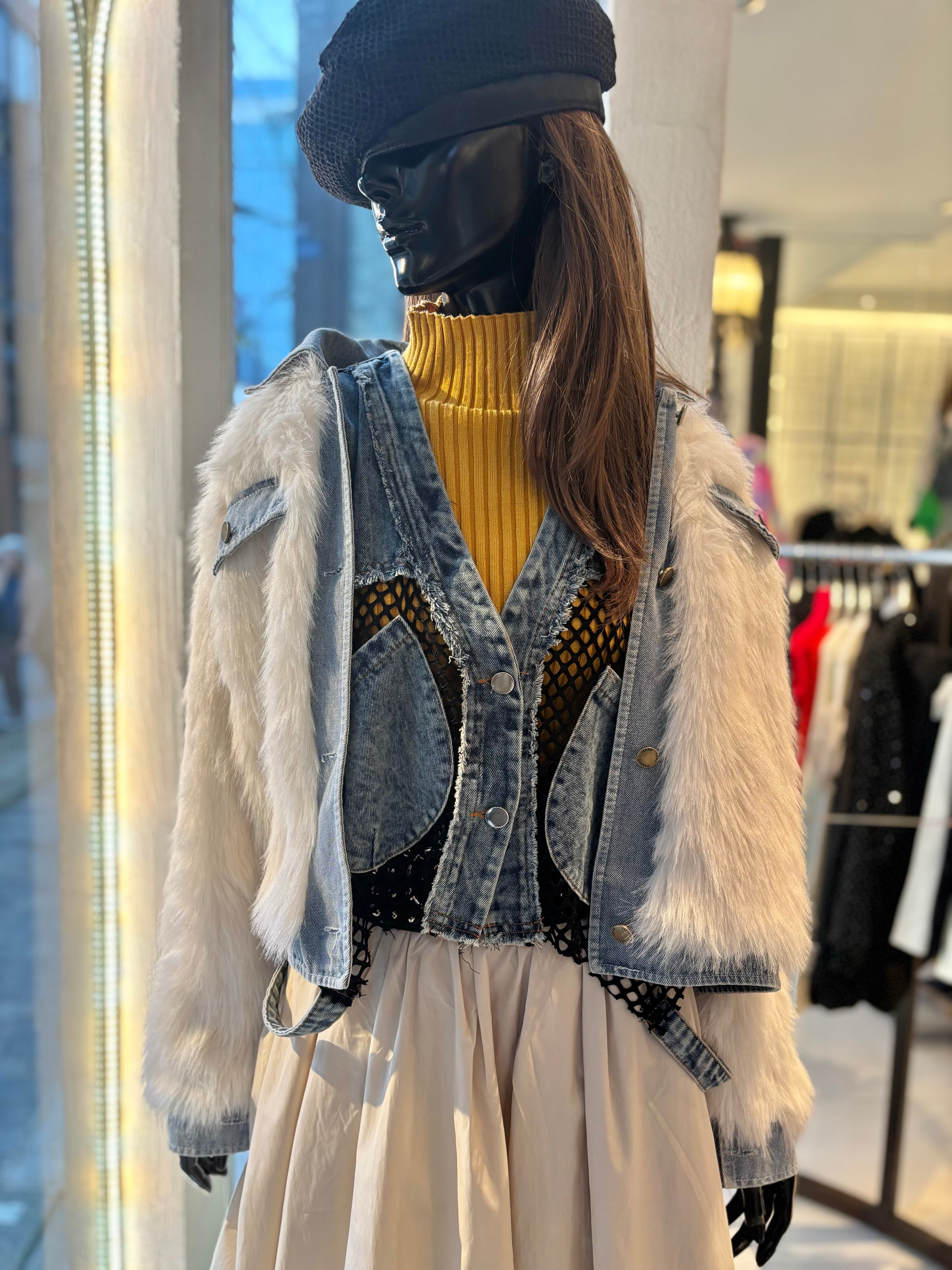 このジャケットは、肌触りの良いフェイクファーとデニムを組み合わせた一着です。