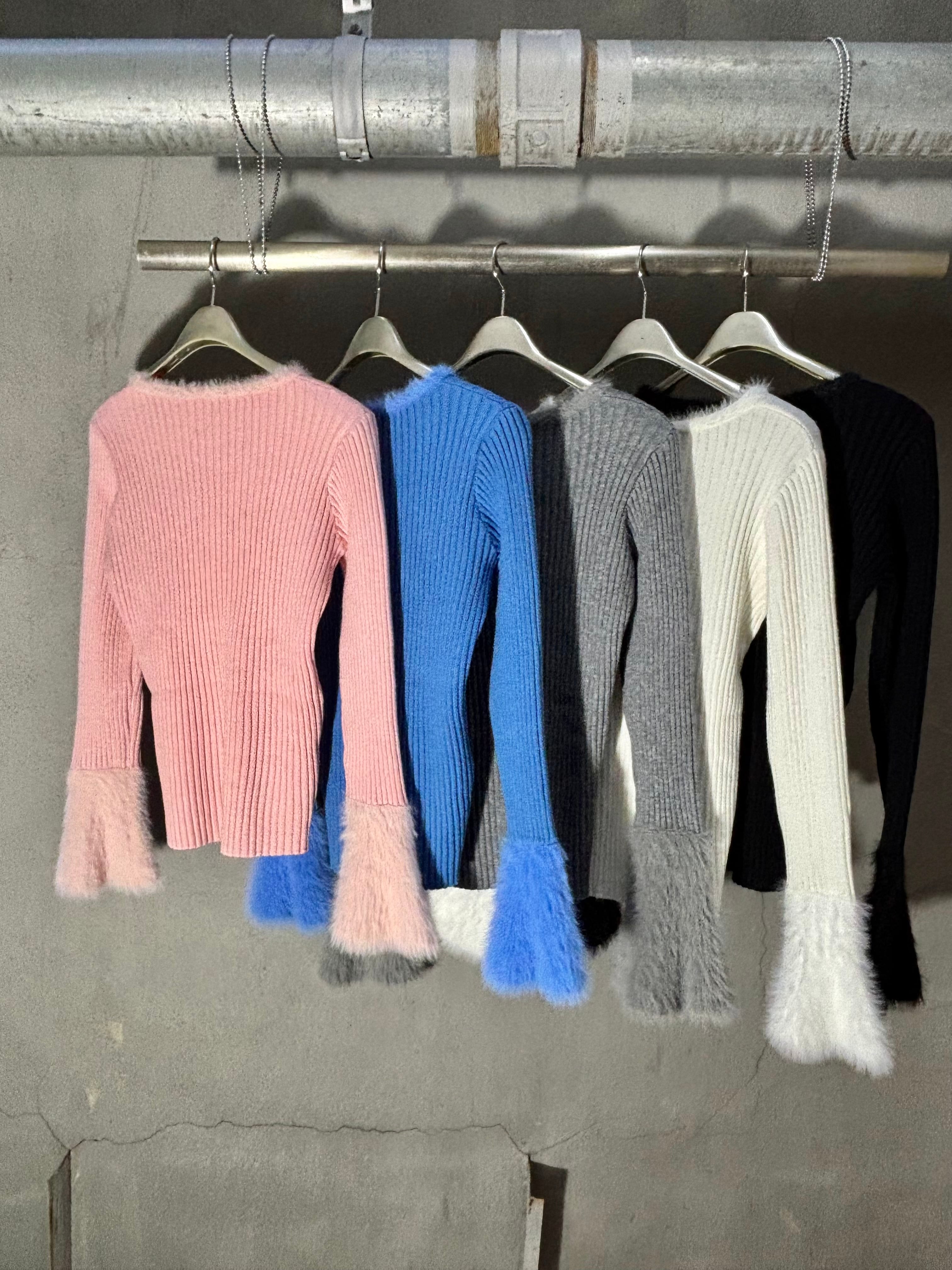 首周りと袖口に施されたシャギーが可愛らしさを引き立てるリブニットトップス♡
