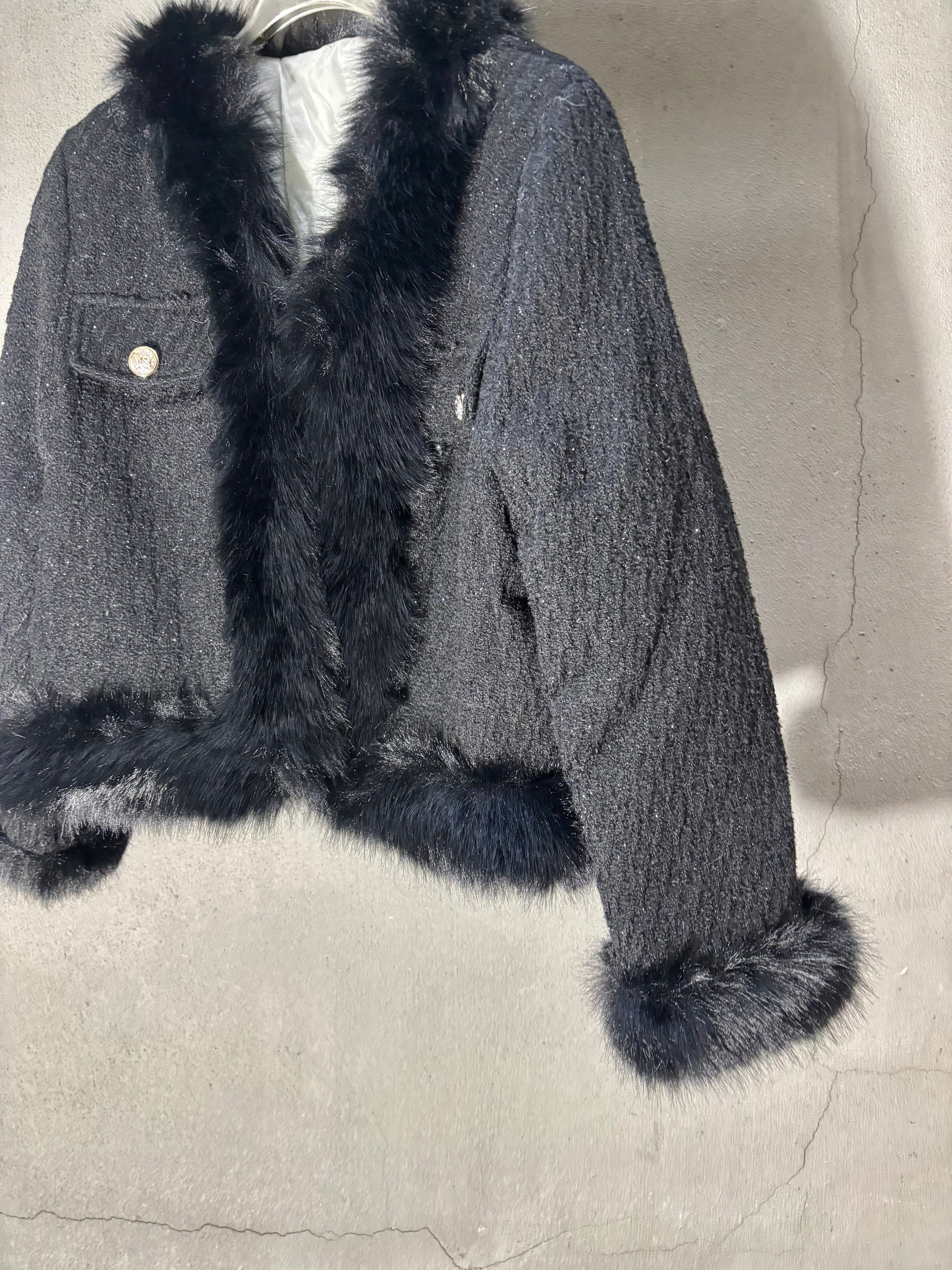silver film glitter × black fur trimming design jacket ジャケット アウター ファー 中綿 金ボタン アウター