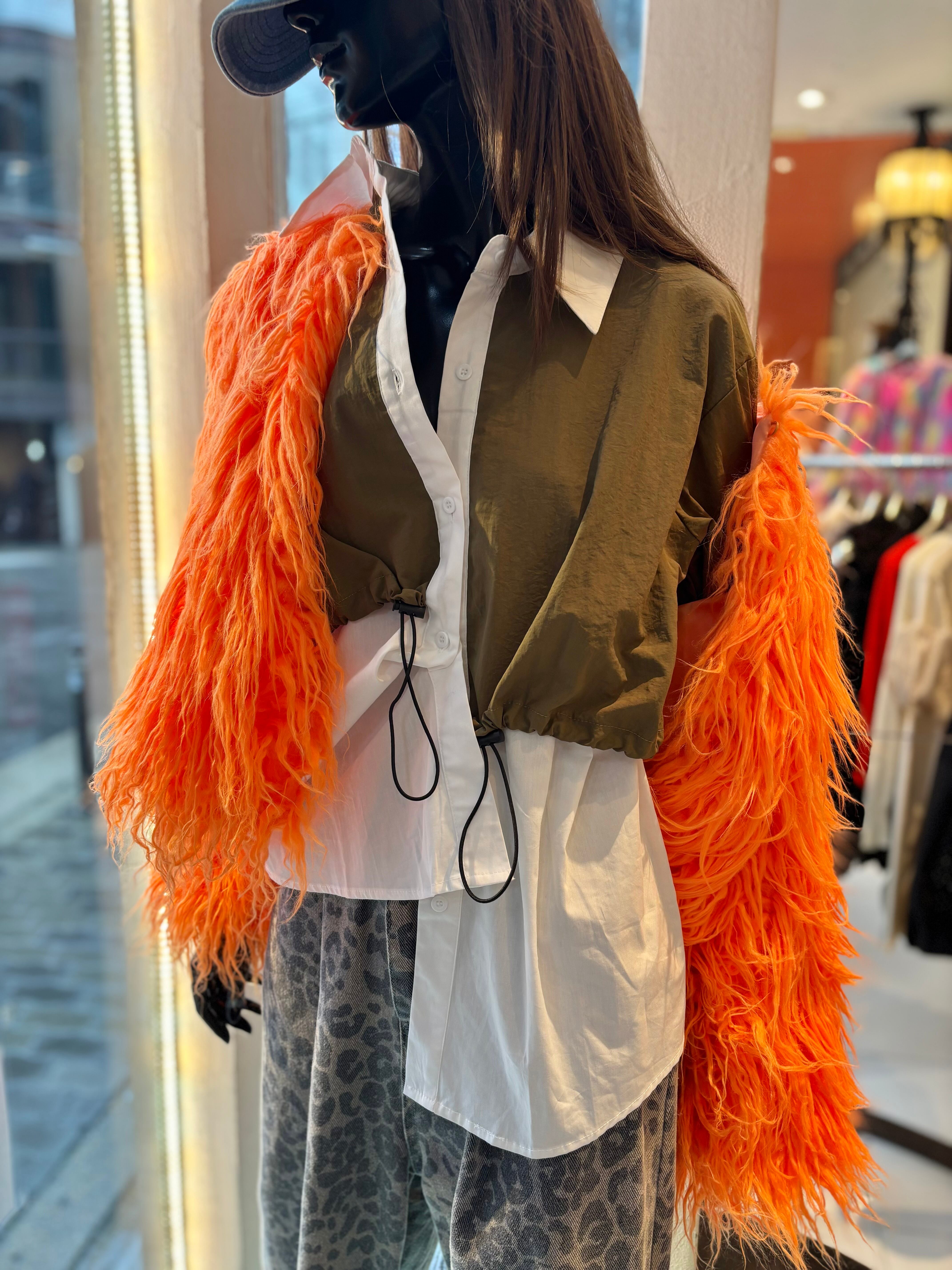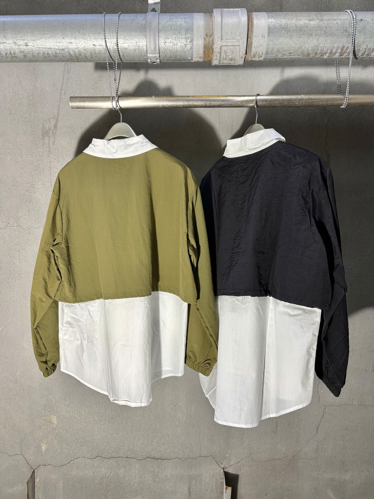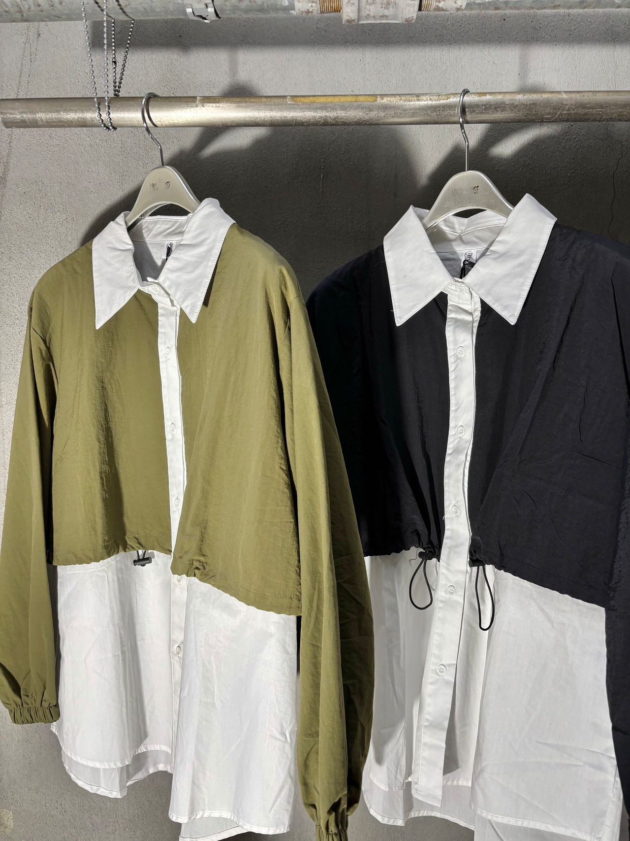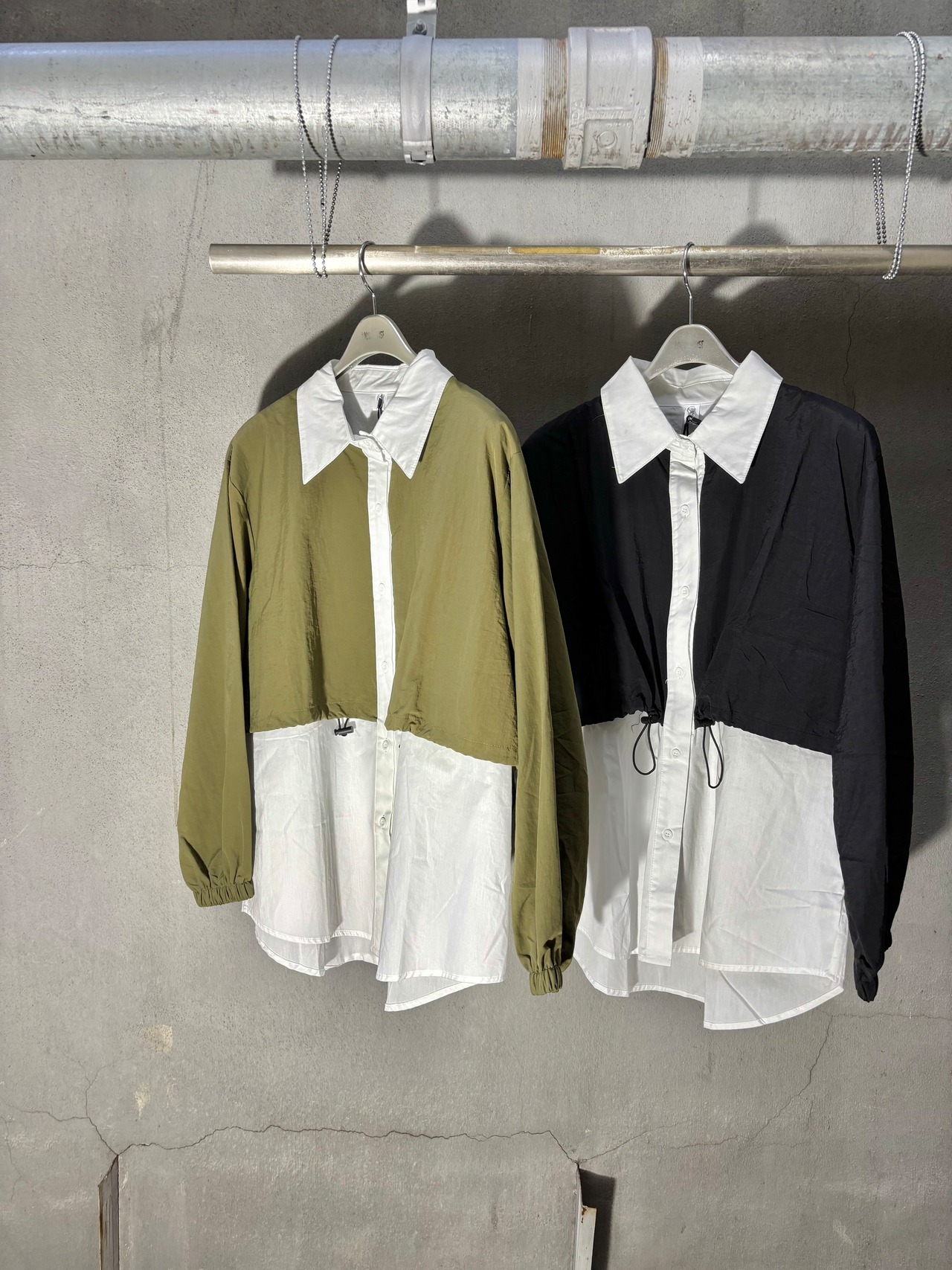 different fabrics mix docking design shirt シャツ デザインシャツ 異素材切替 ドローコード