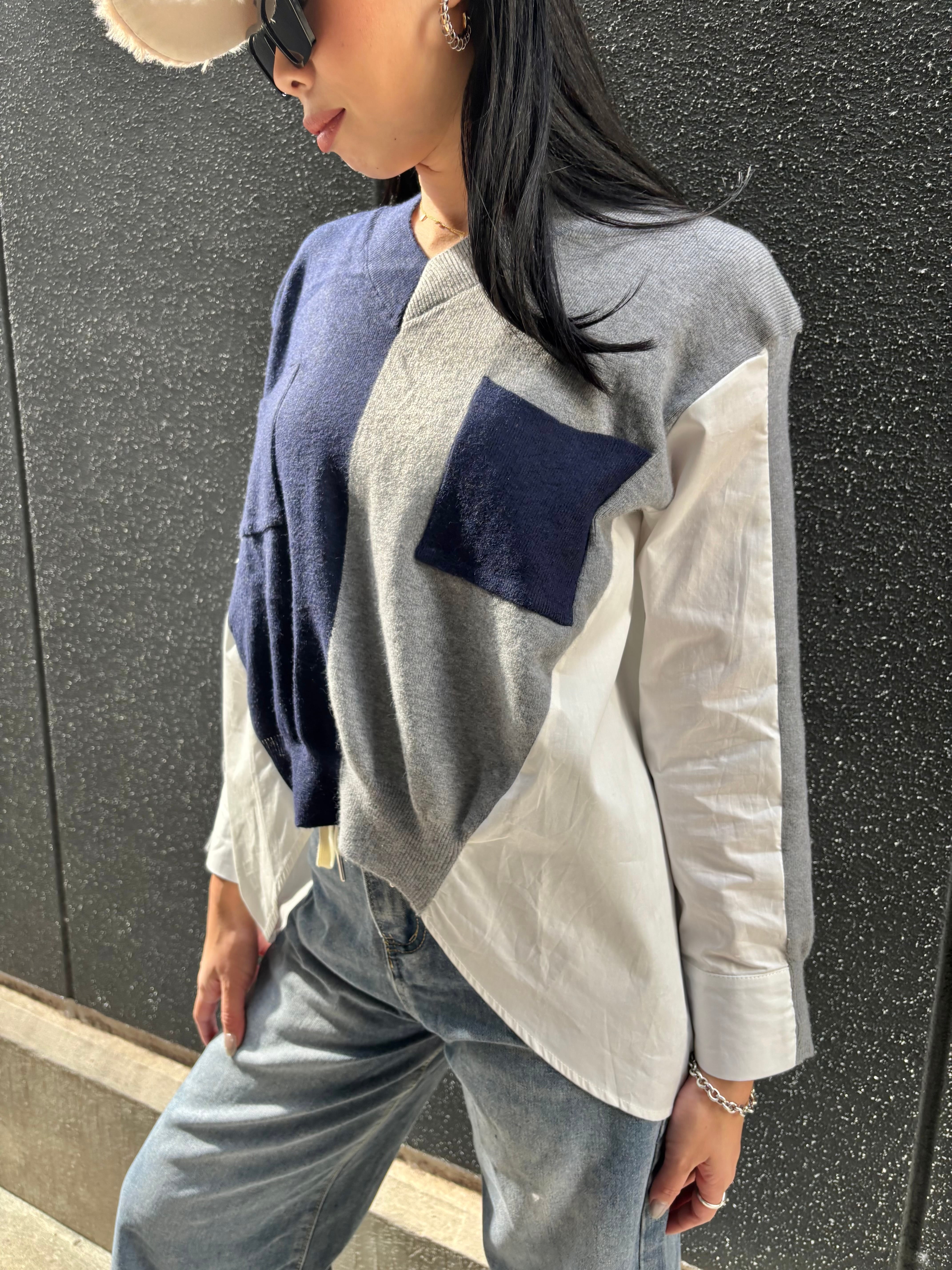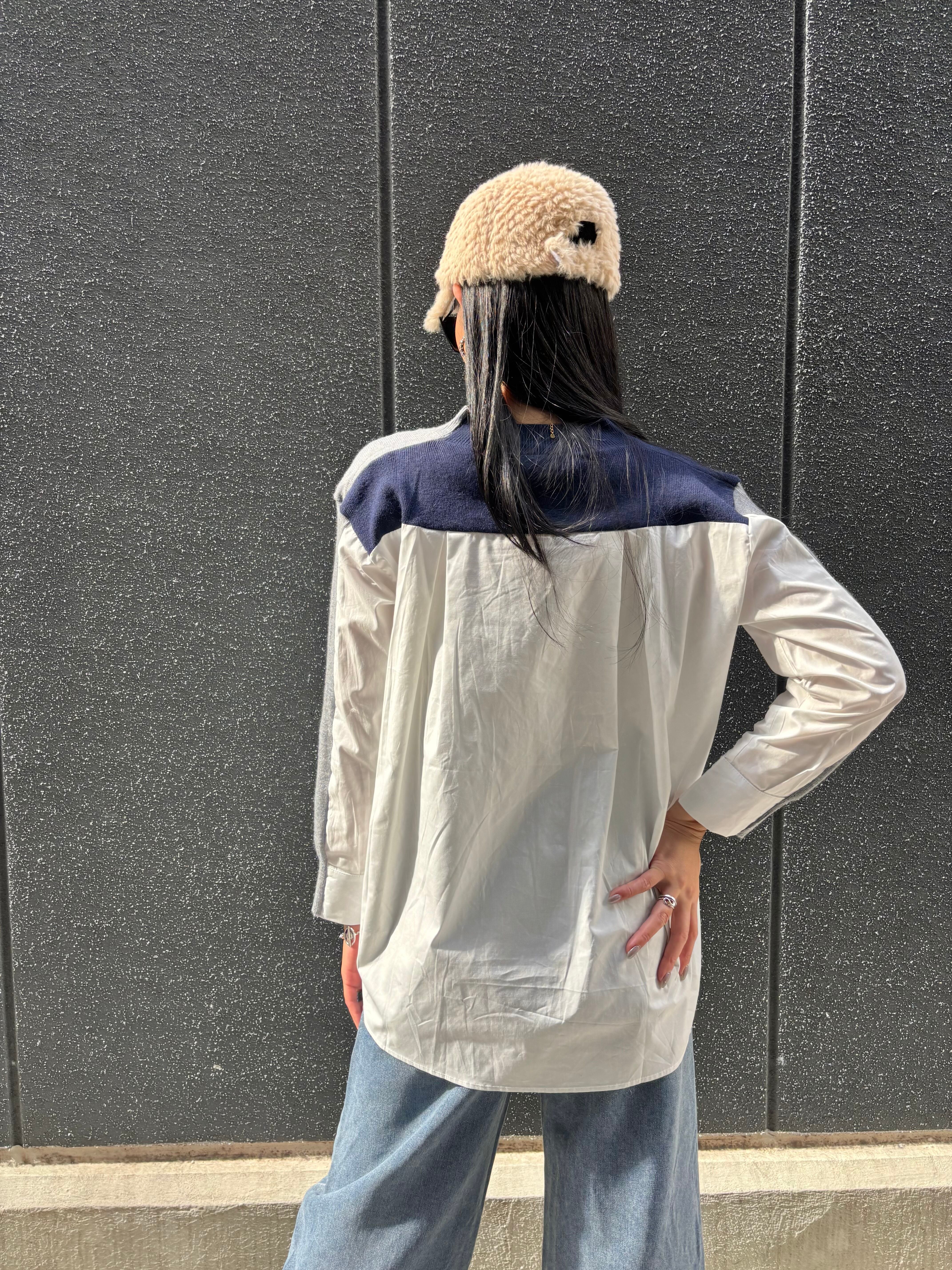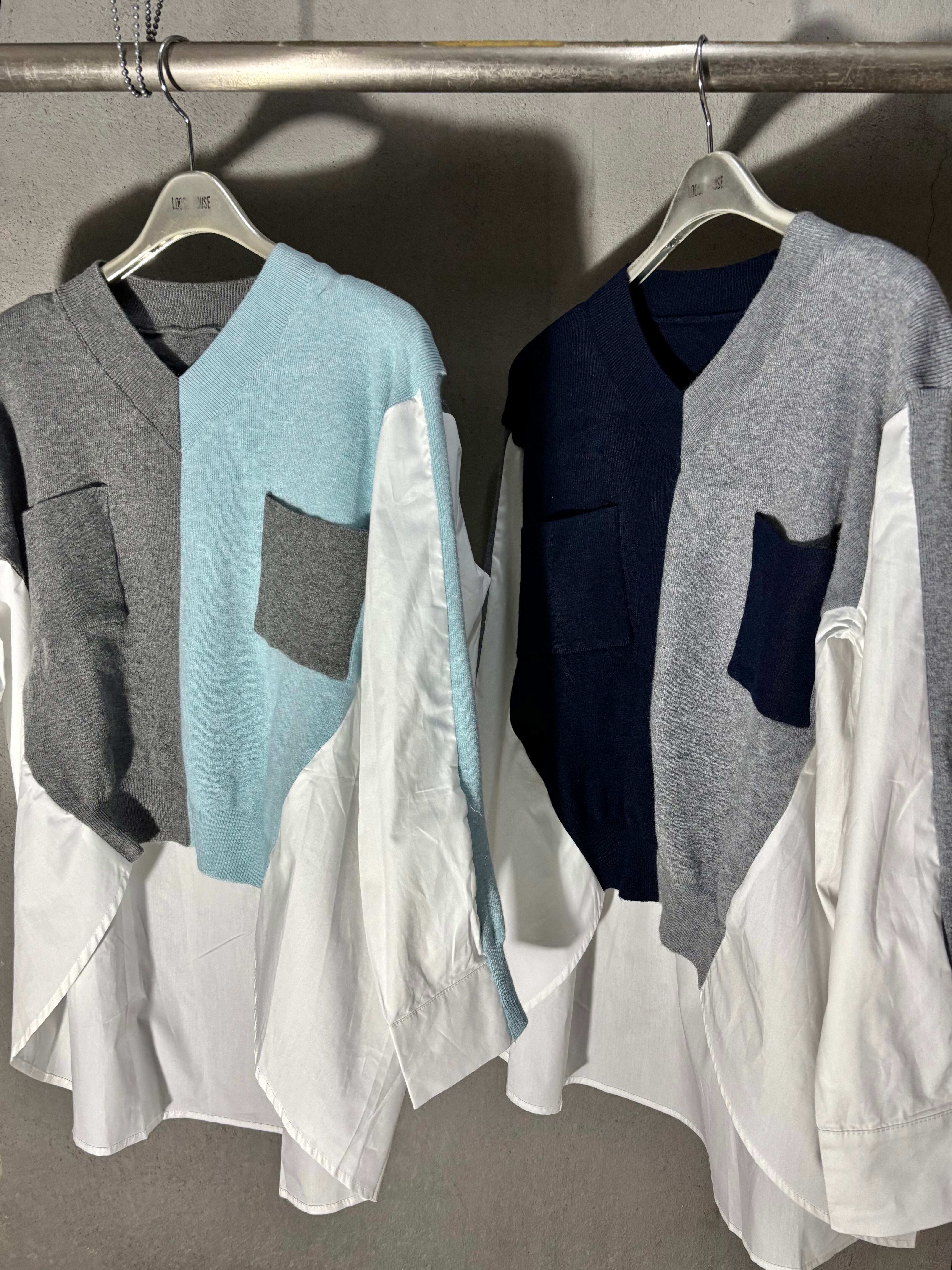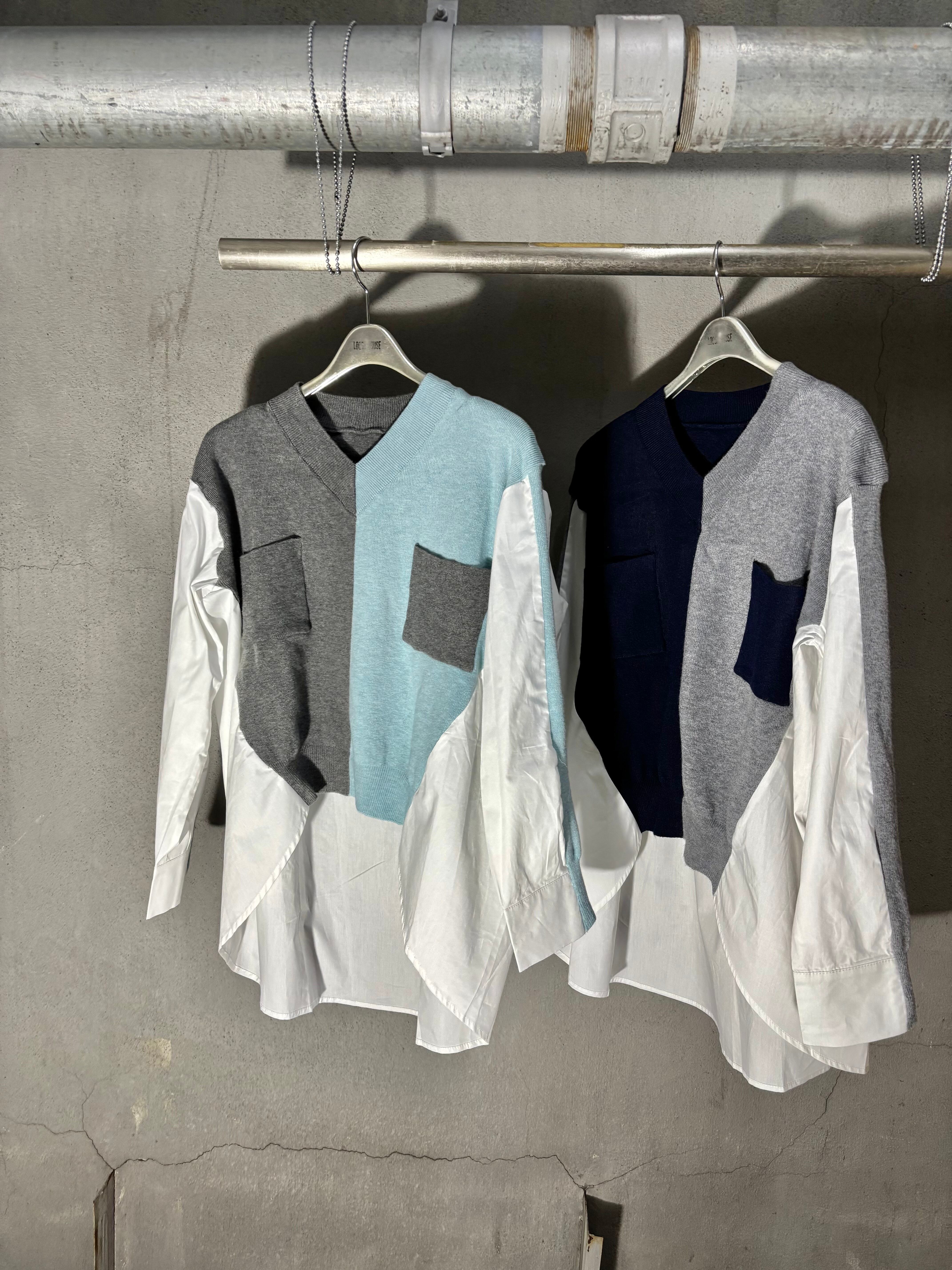 mix color docking design shirt シャツ デザインシャツ 異素材切替 ニット 配色 ドッキング ポケット Vネック