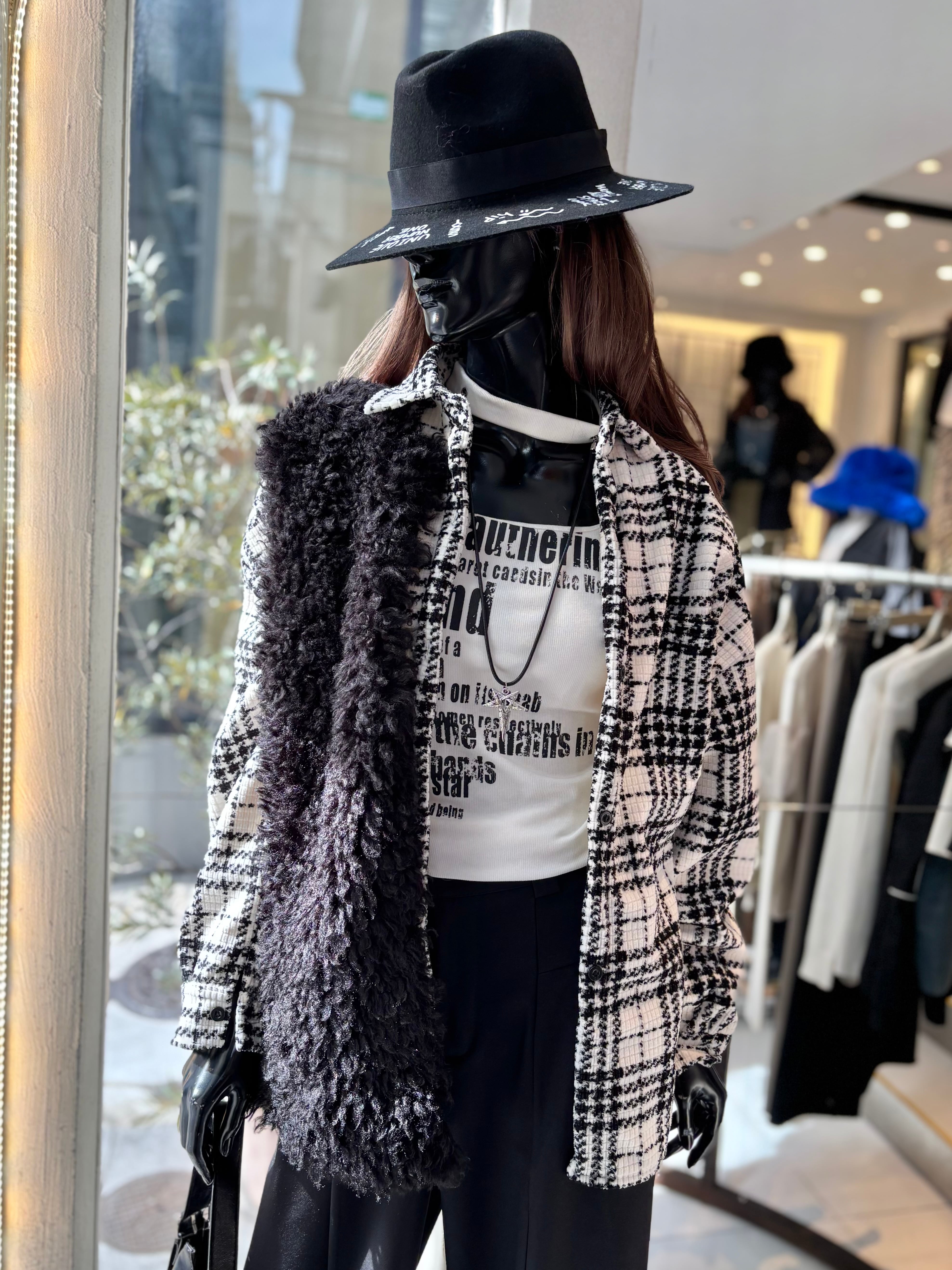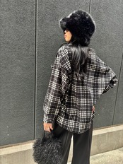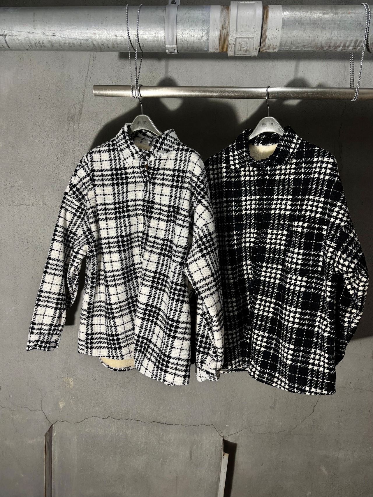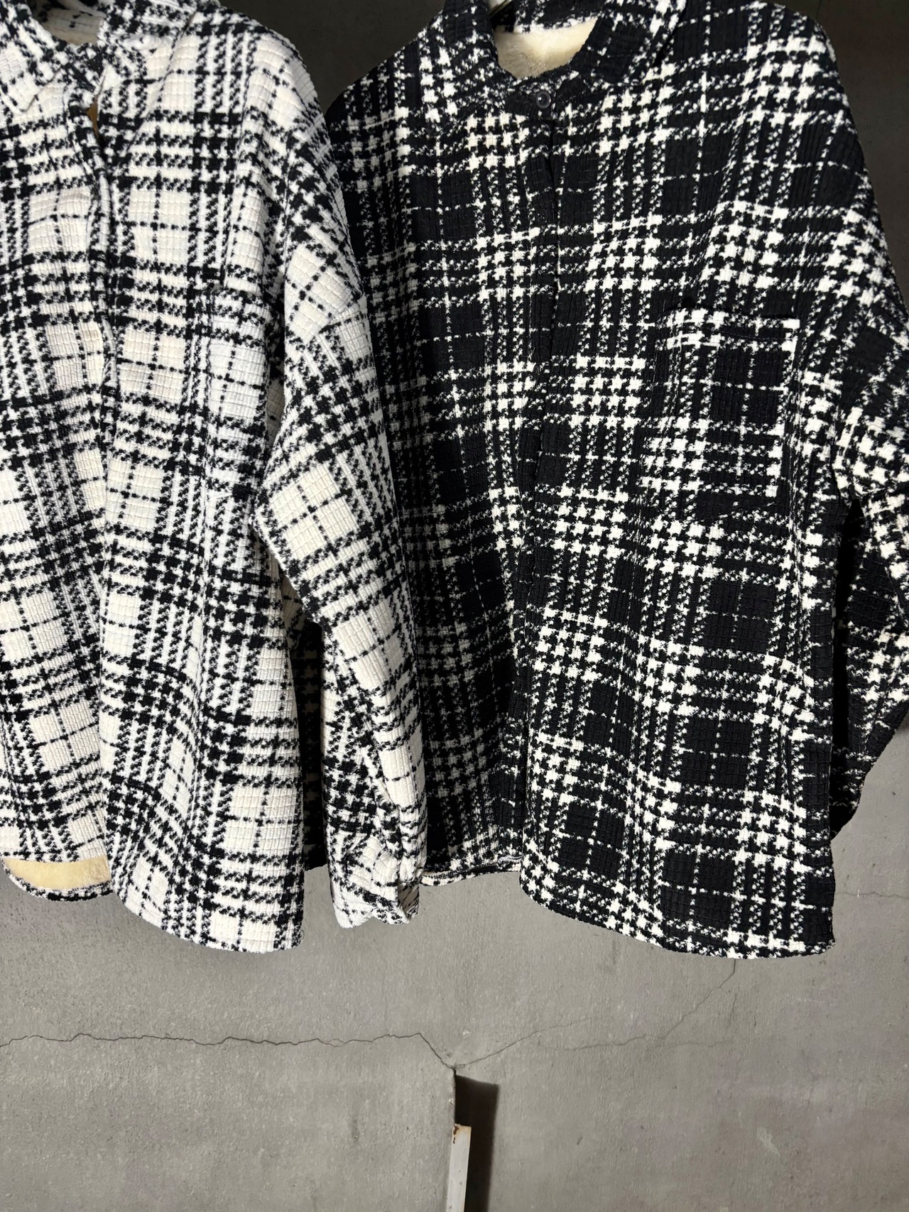 bi-color check corduroy shirt jacket シャツ ジャケット 裏ボア チェック 白黒 バイカラー