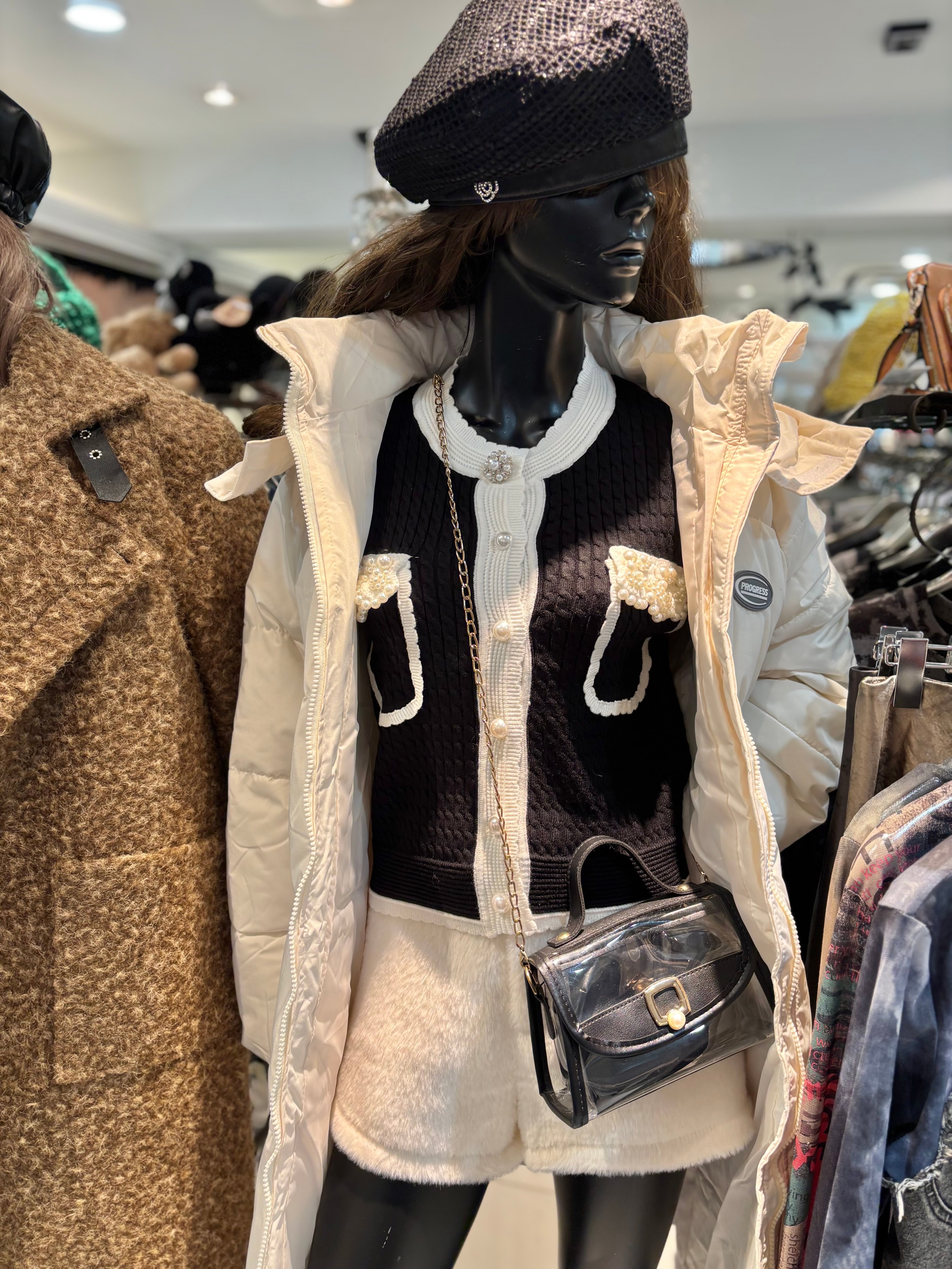 白黒のバイカラーと、ボタンとポケットのデザインが魅力で、シンプルながらも個性を引き立てるアイテム♡