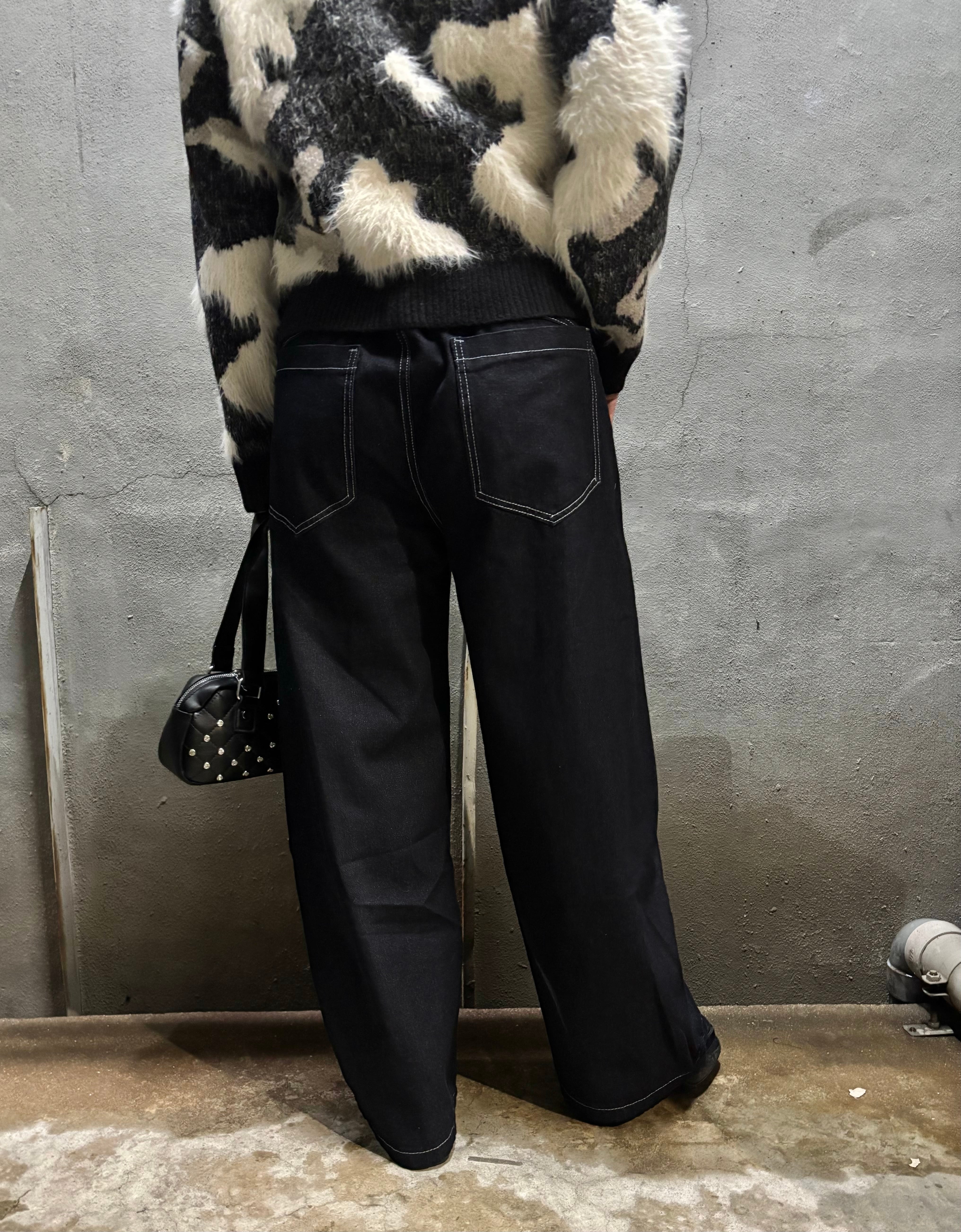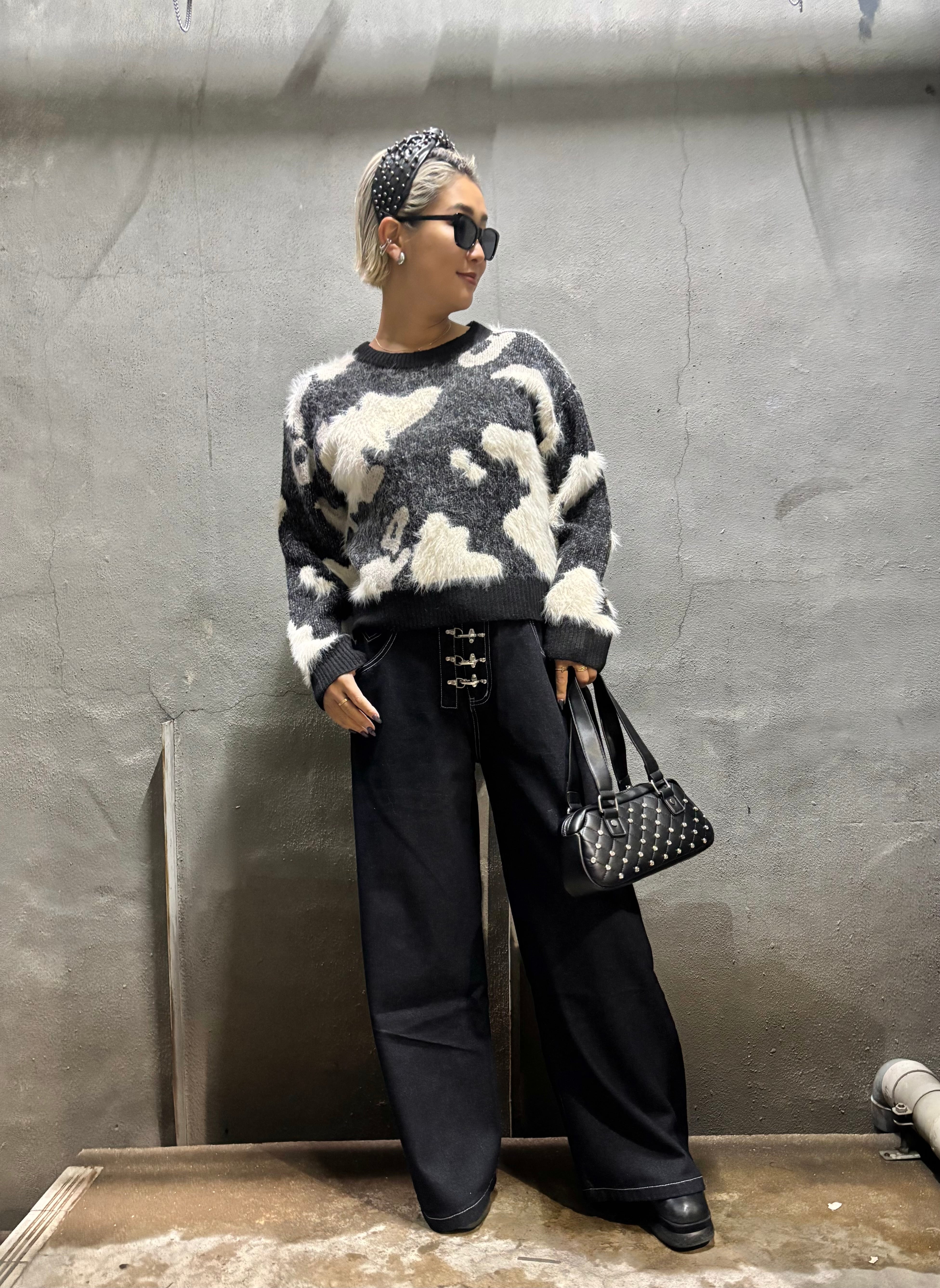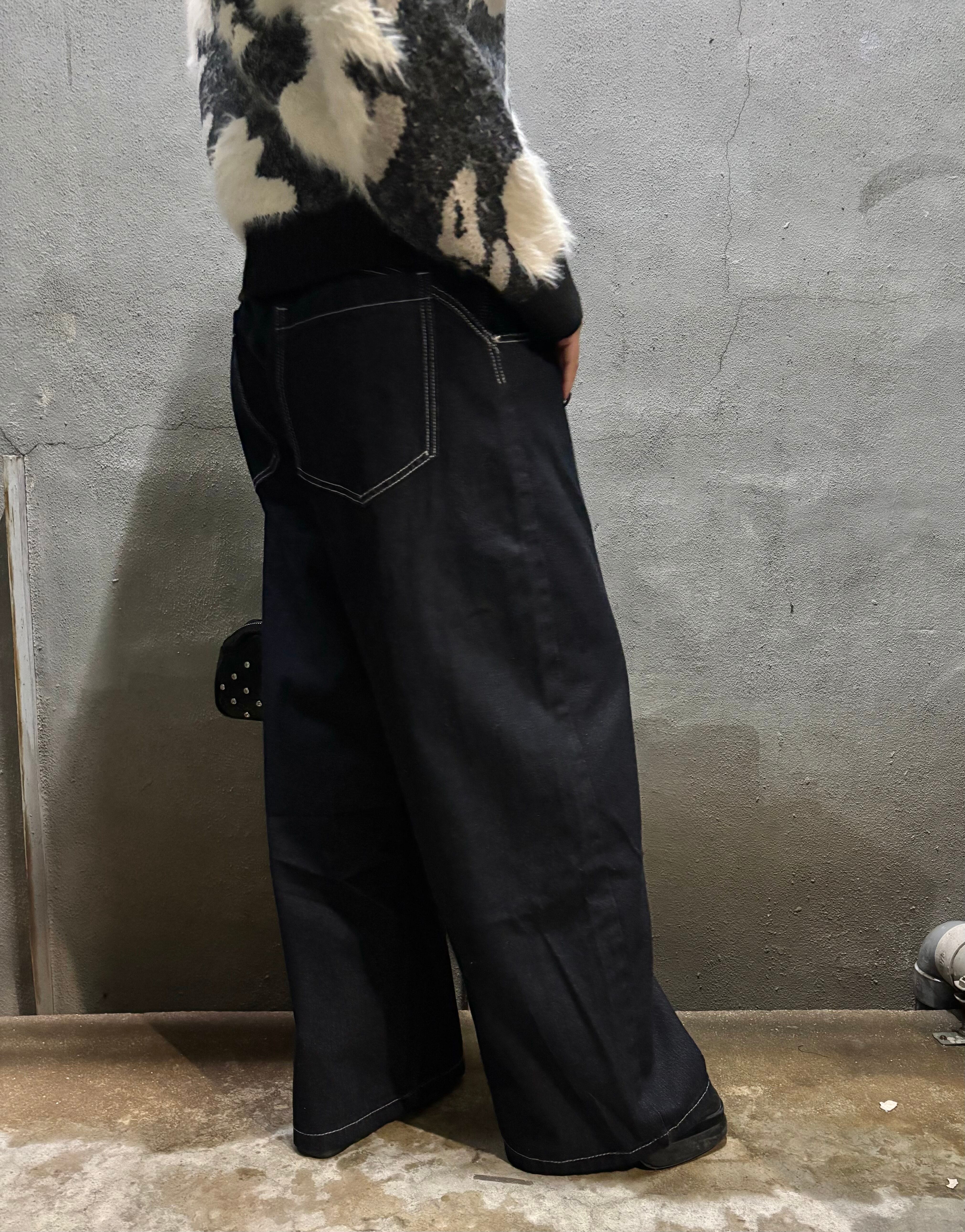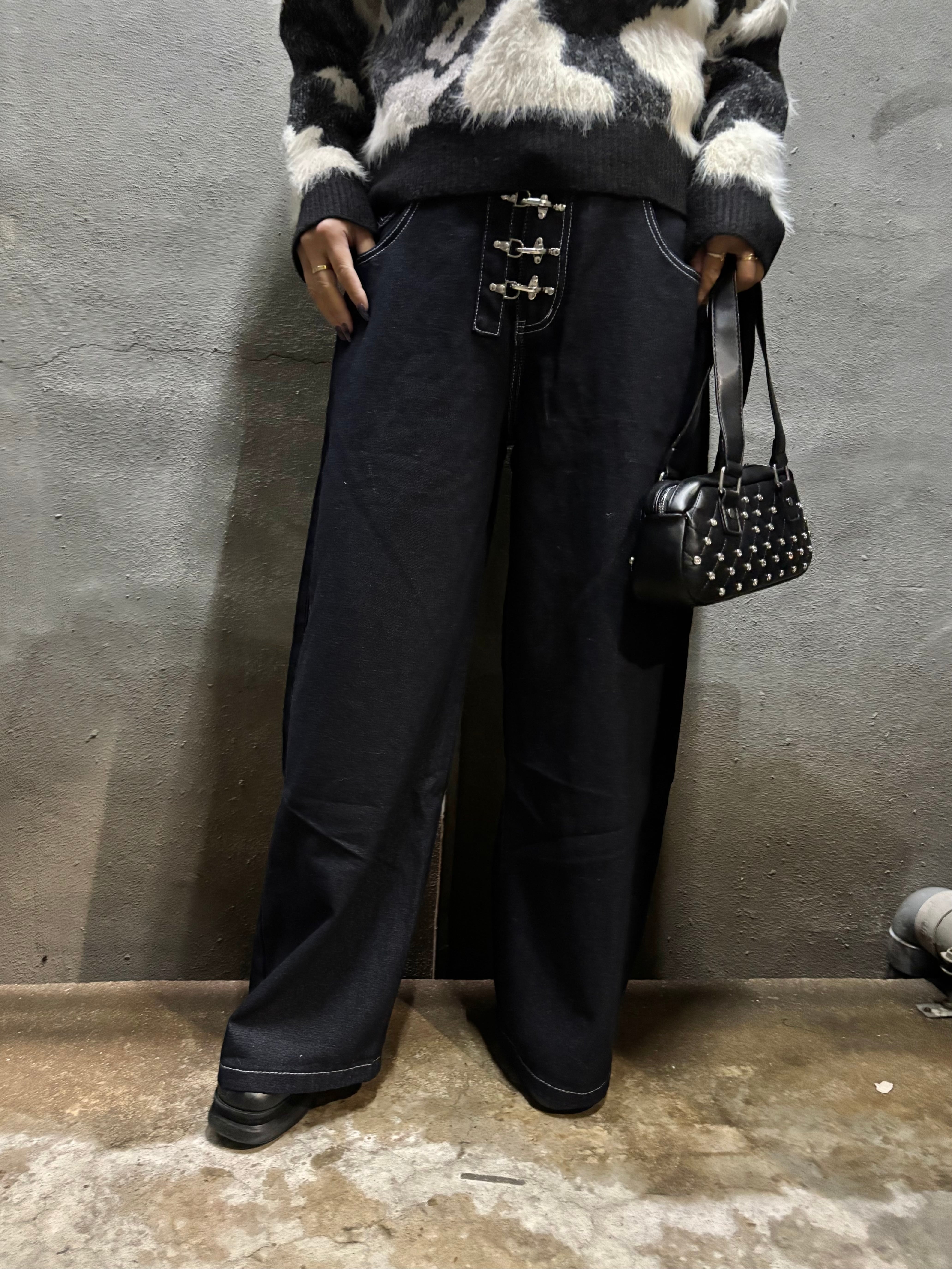 センター部分に施されたシルバーフックが魅力。個性的でありながら、どんなスタイルにもマッチするデニムパンツです!シルバーのフックがさりげなくアクセントを加え、おしゃれ度を一段アップさせます。