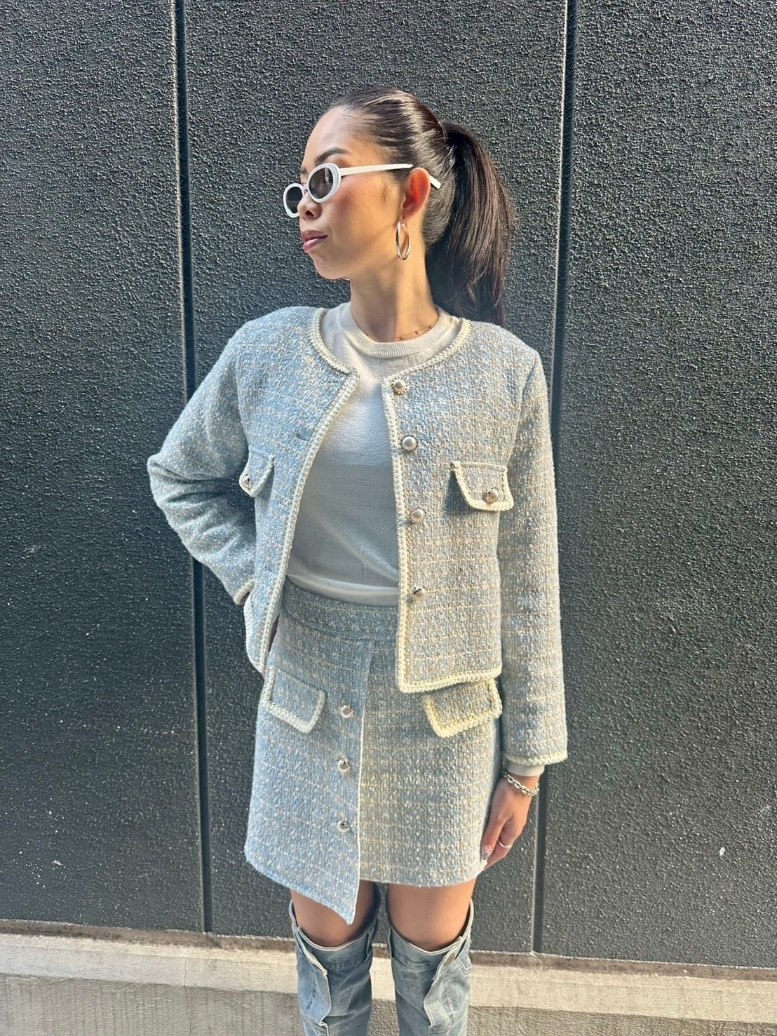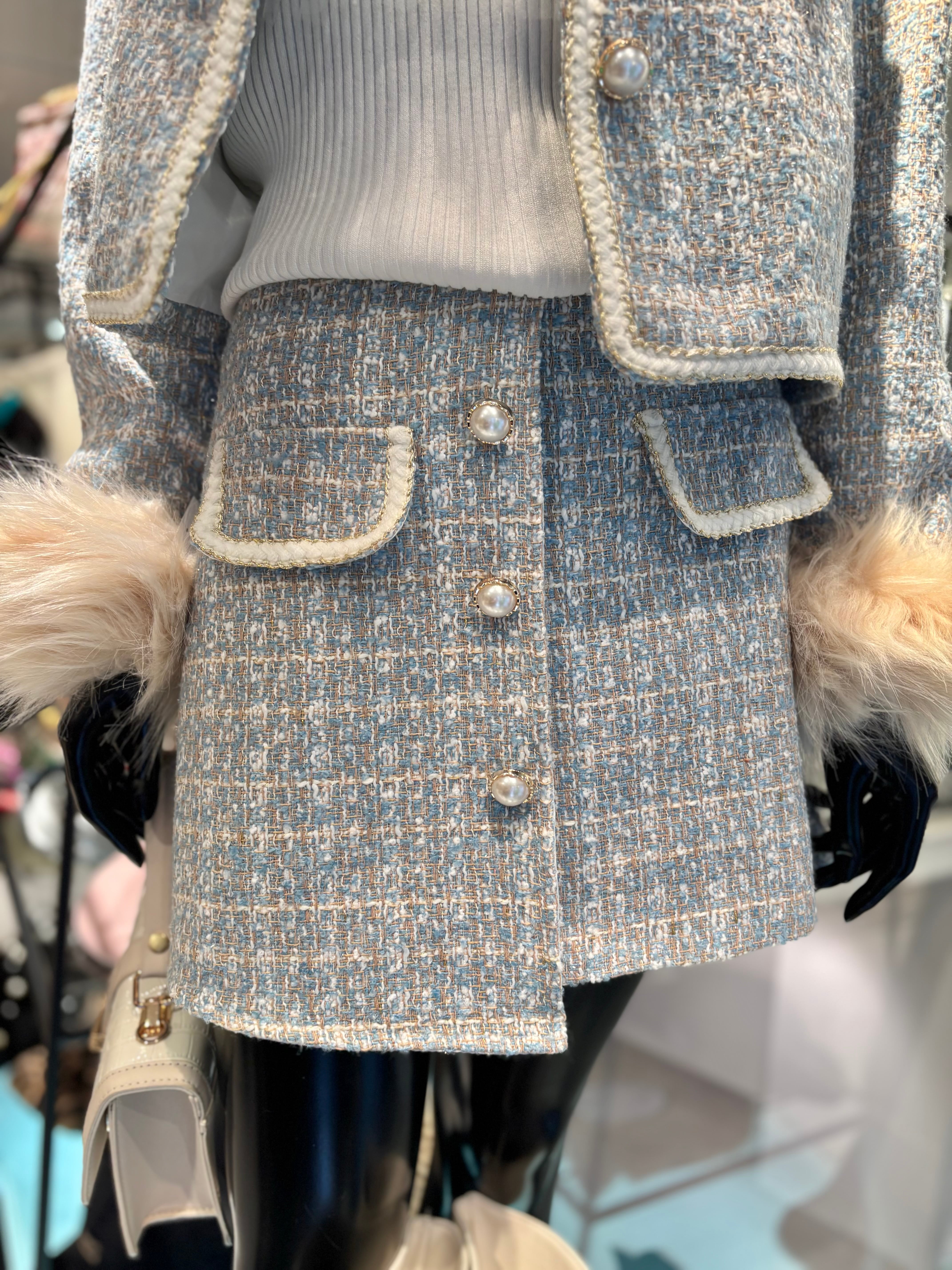 洗練された印象のツィードジャケットとミニスカートの2点セットが新登場!