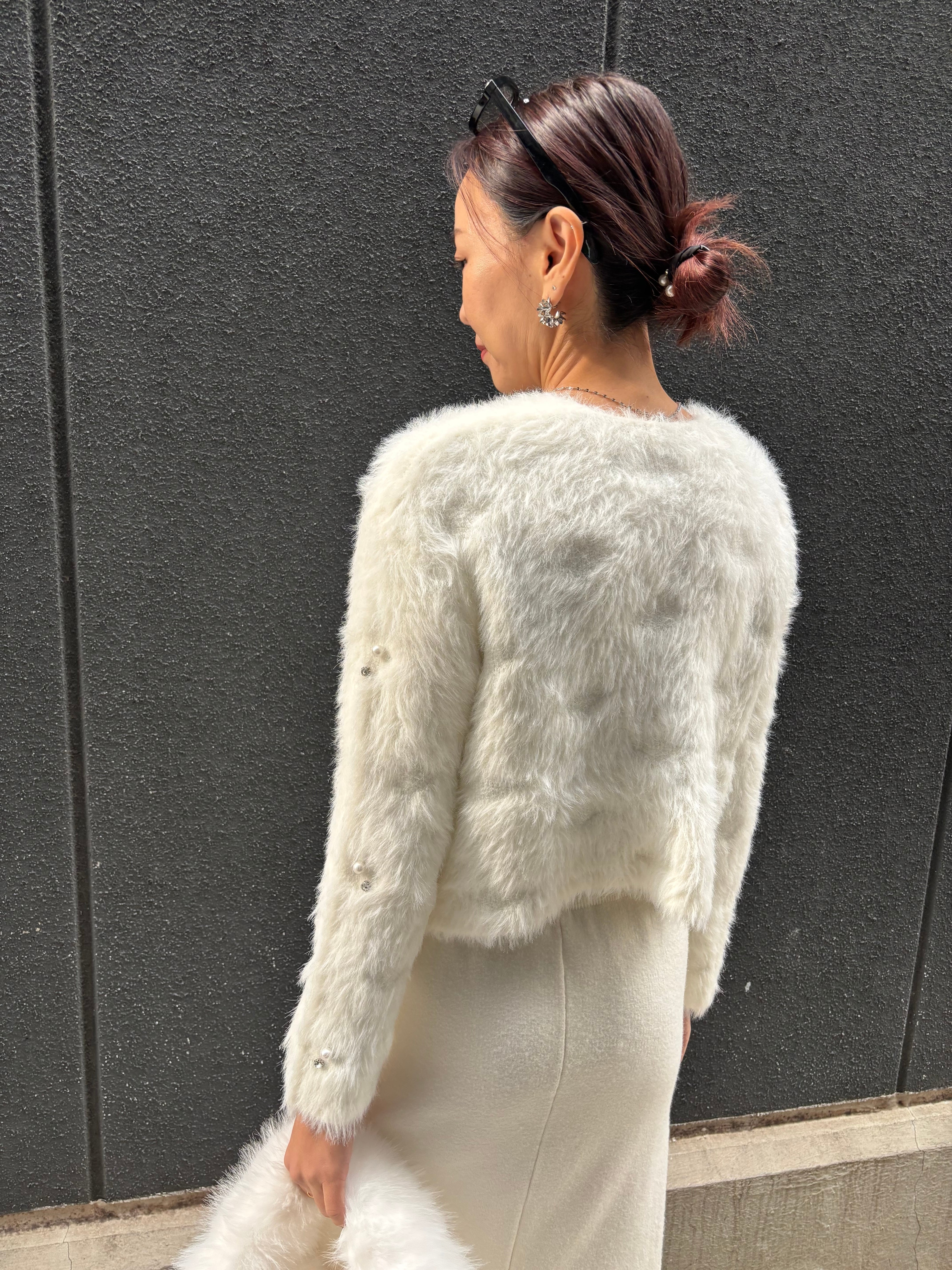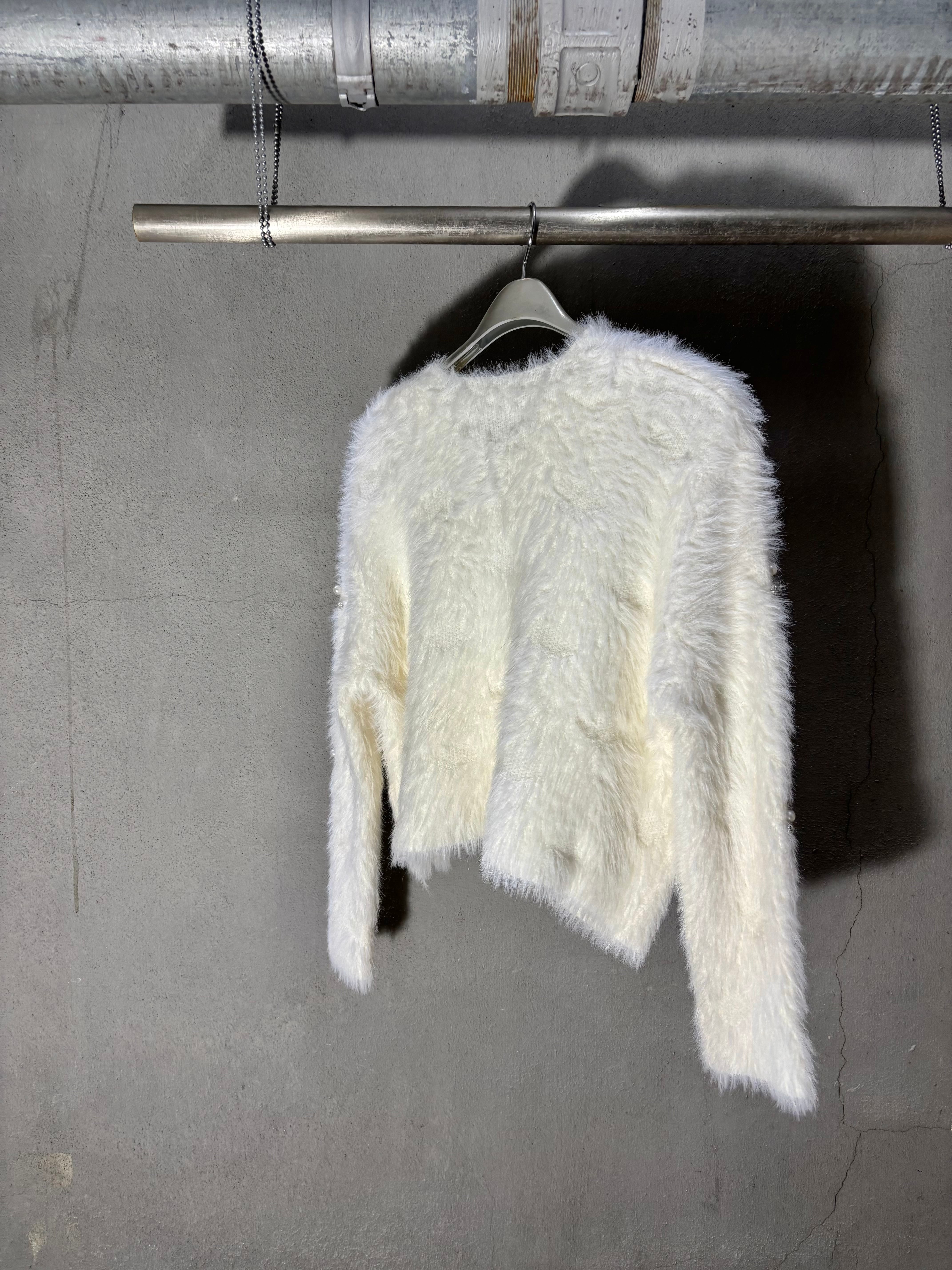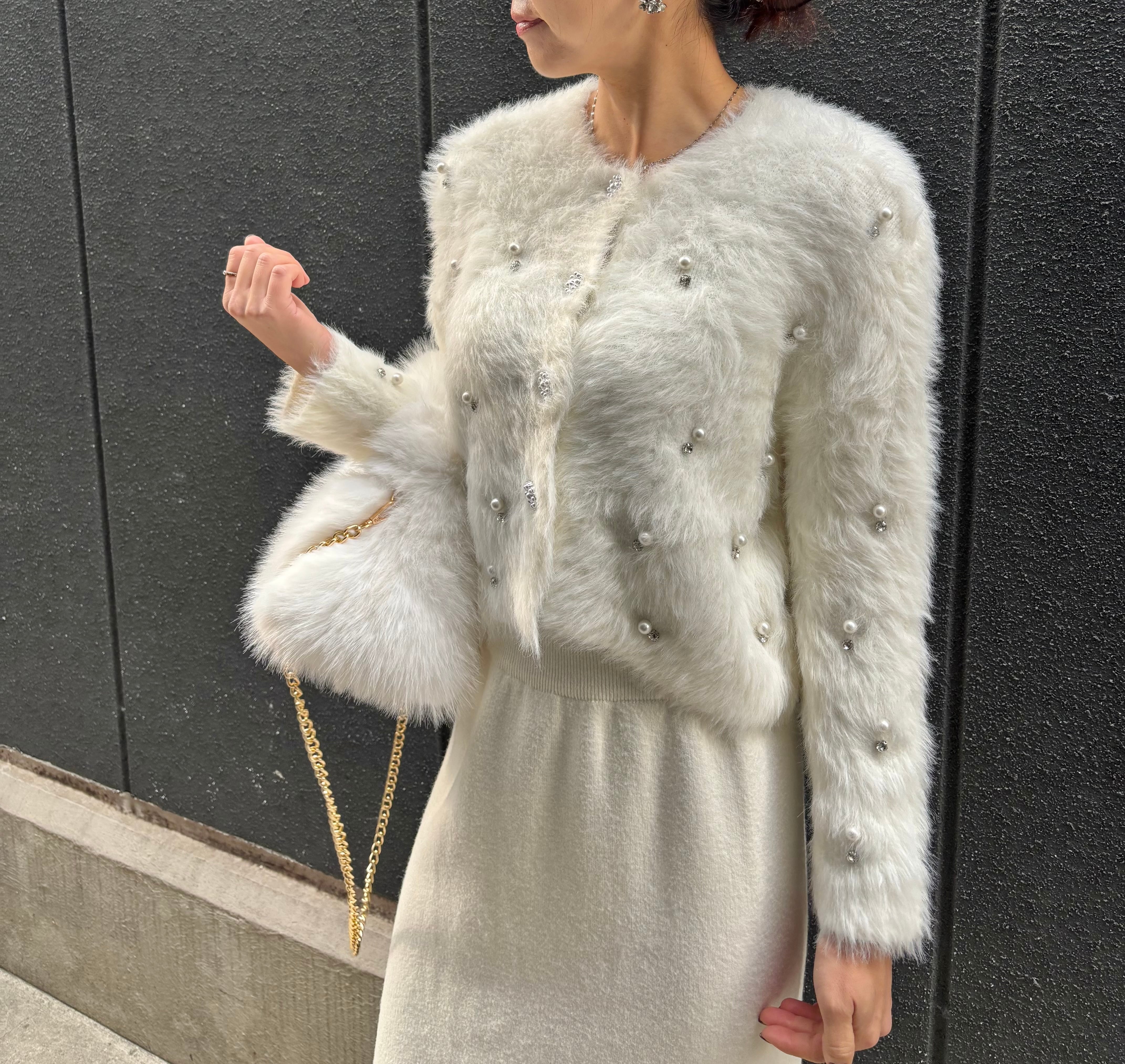 pearl bijou design shaggy knit cardigan ニット カーディガン シャギー パール ビジュー 白 ホワイト