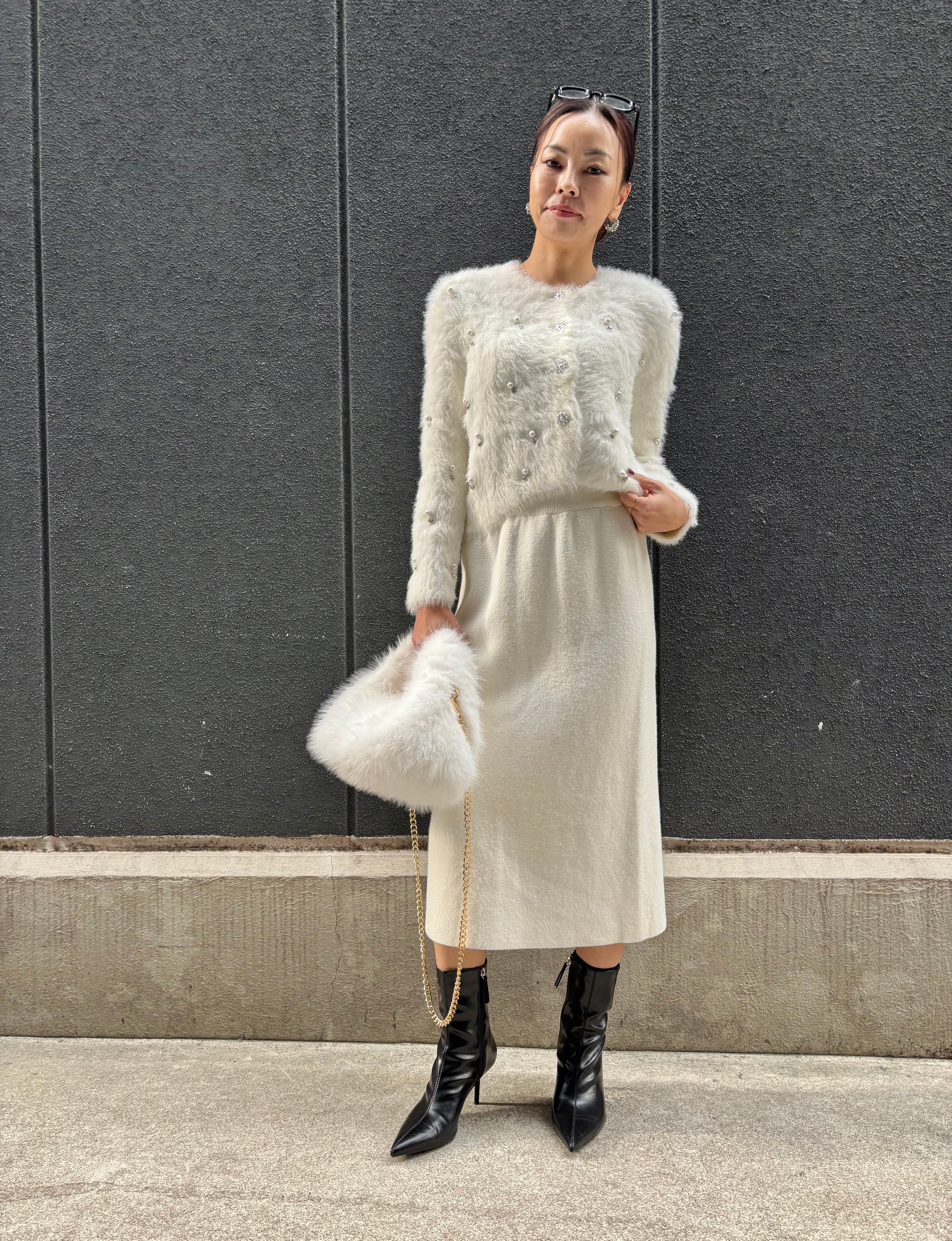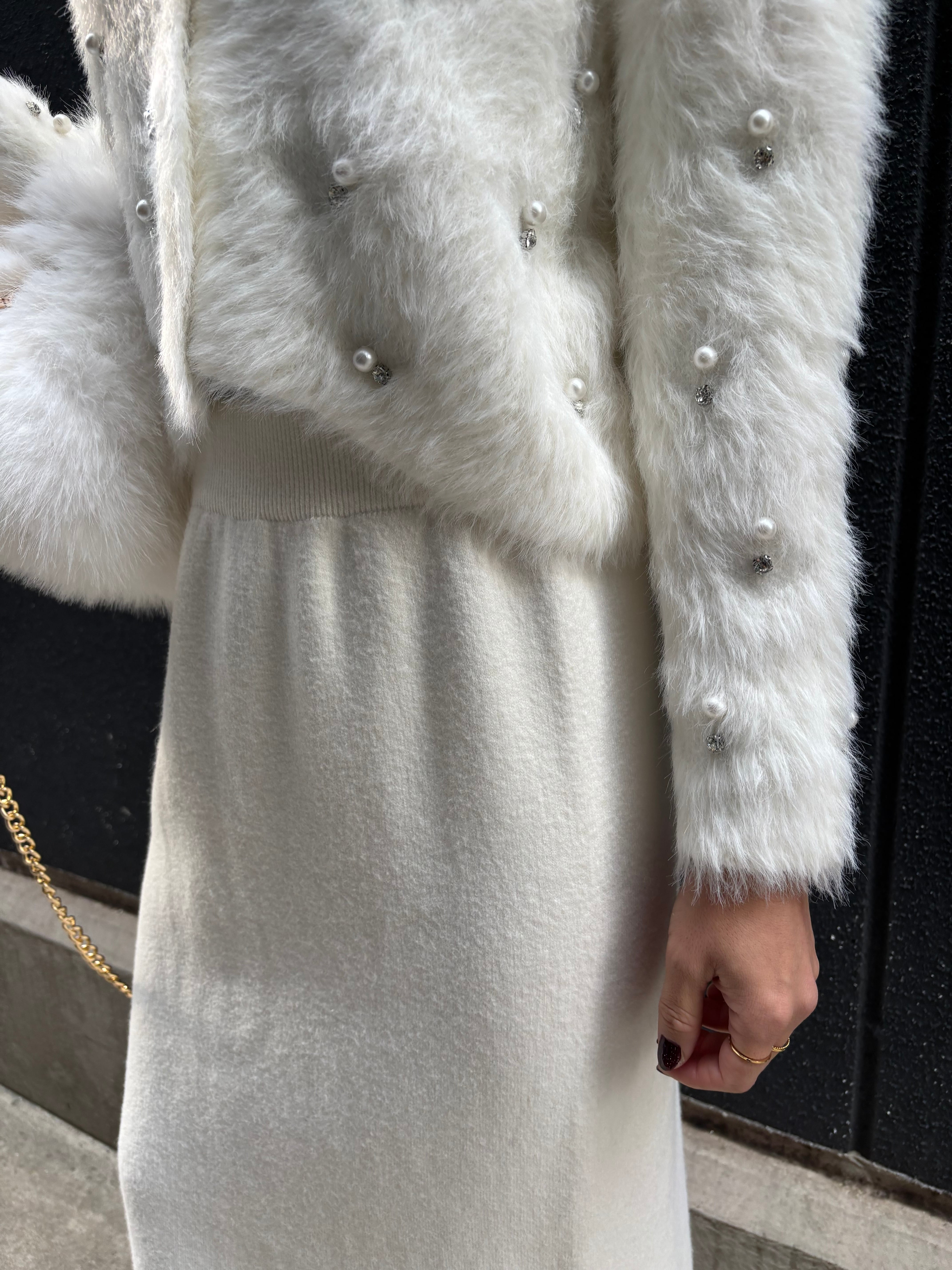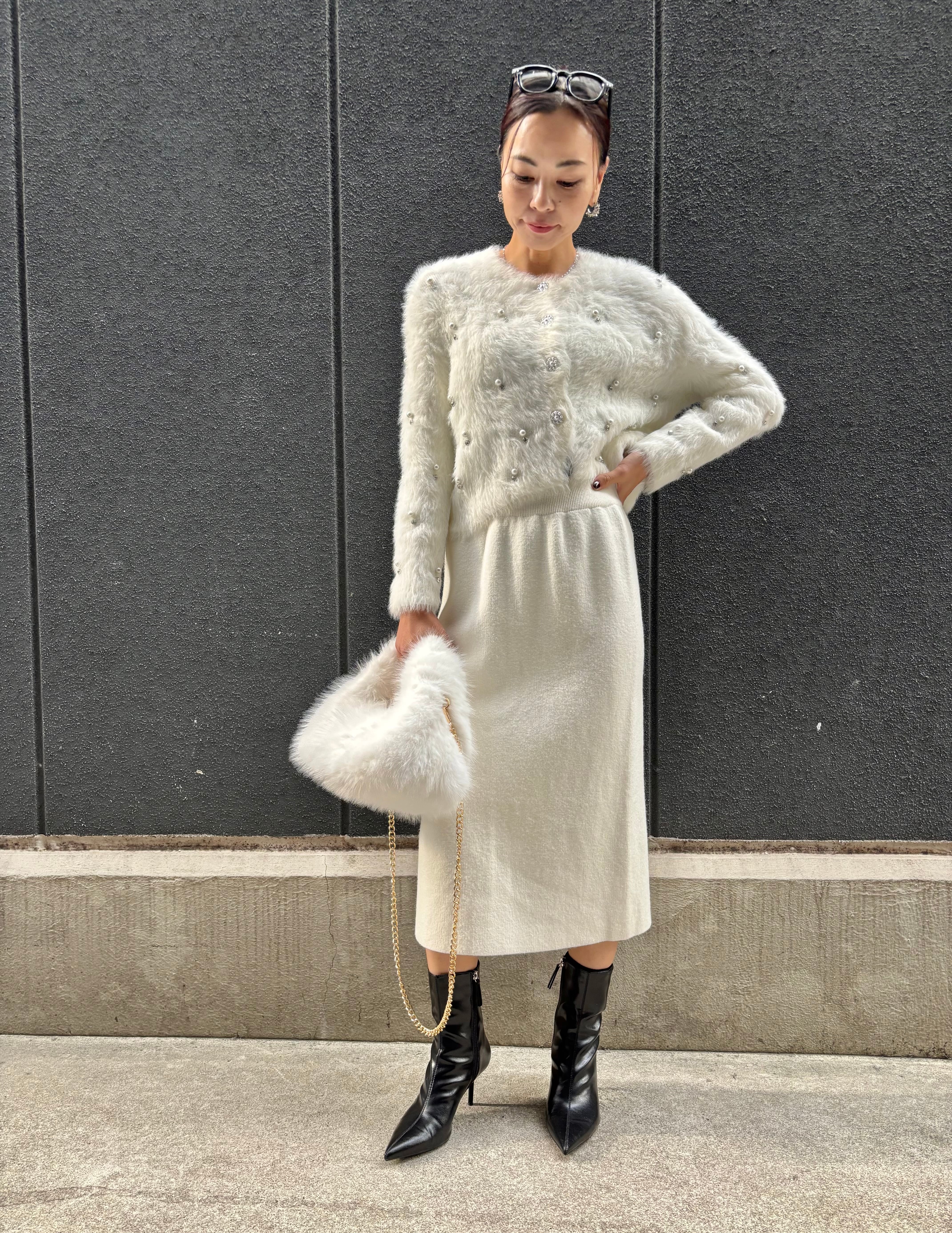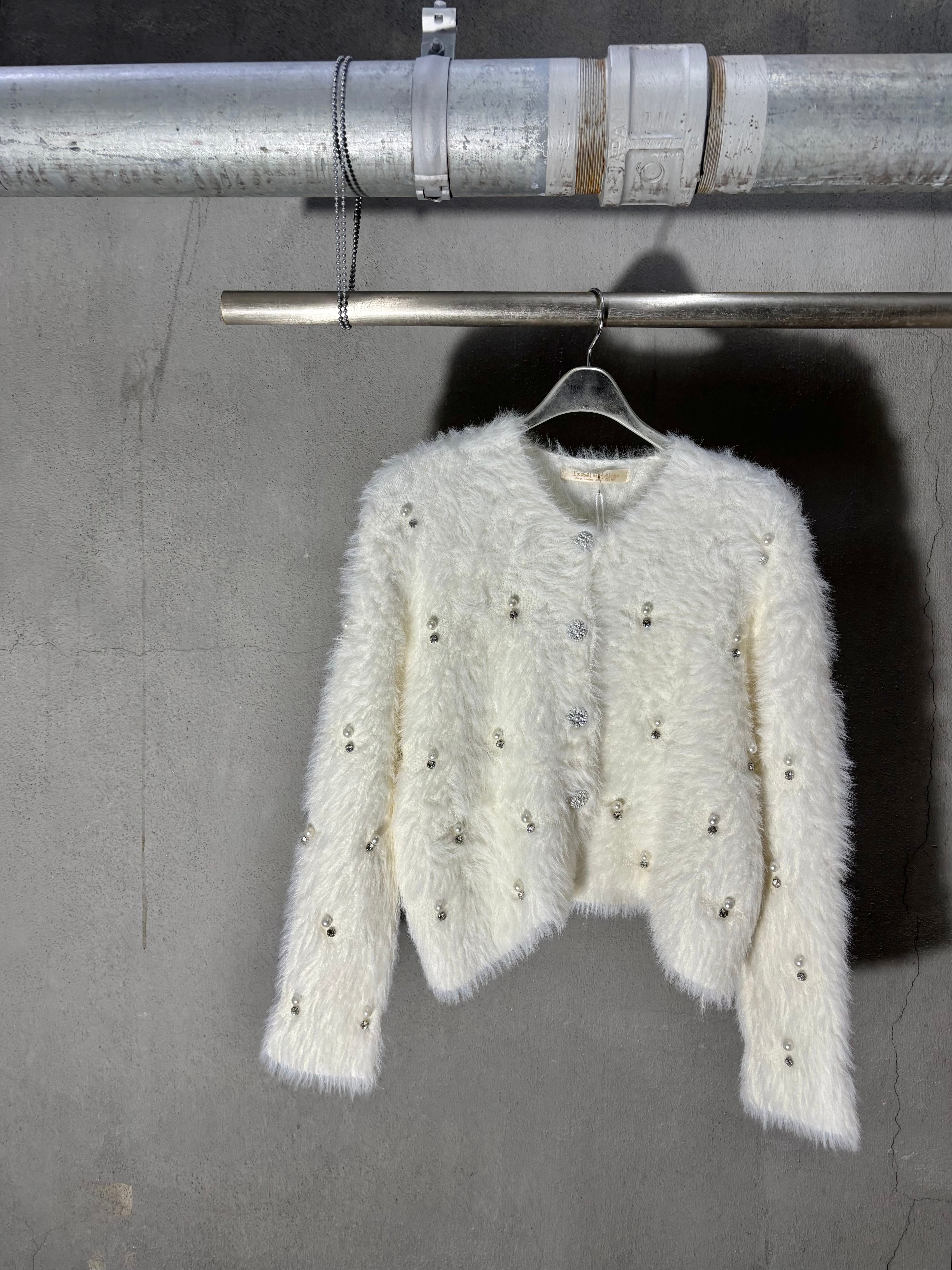 pearl bijou design shaggy knit cardigan ニット カーディガン シャギー パール ビジュー 白 ホワイト