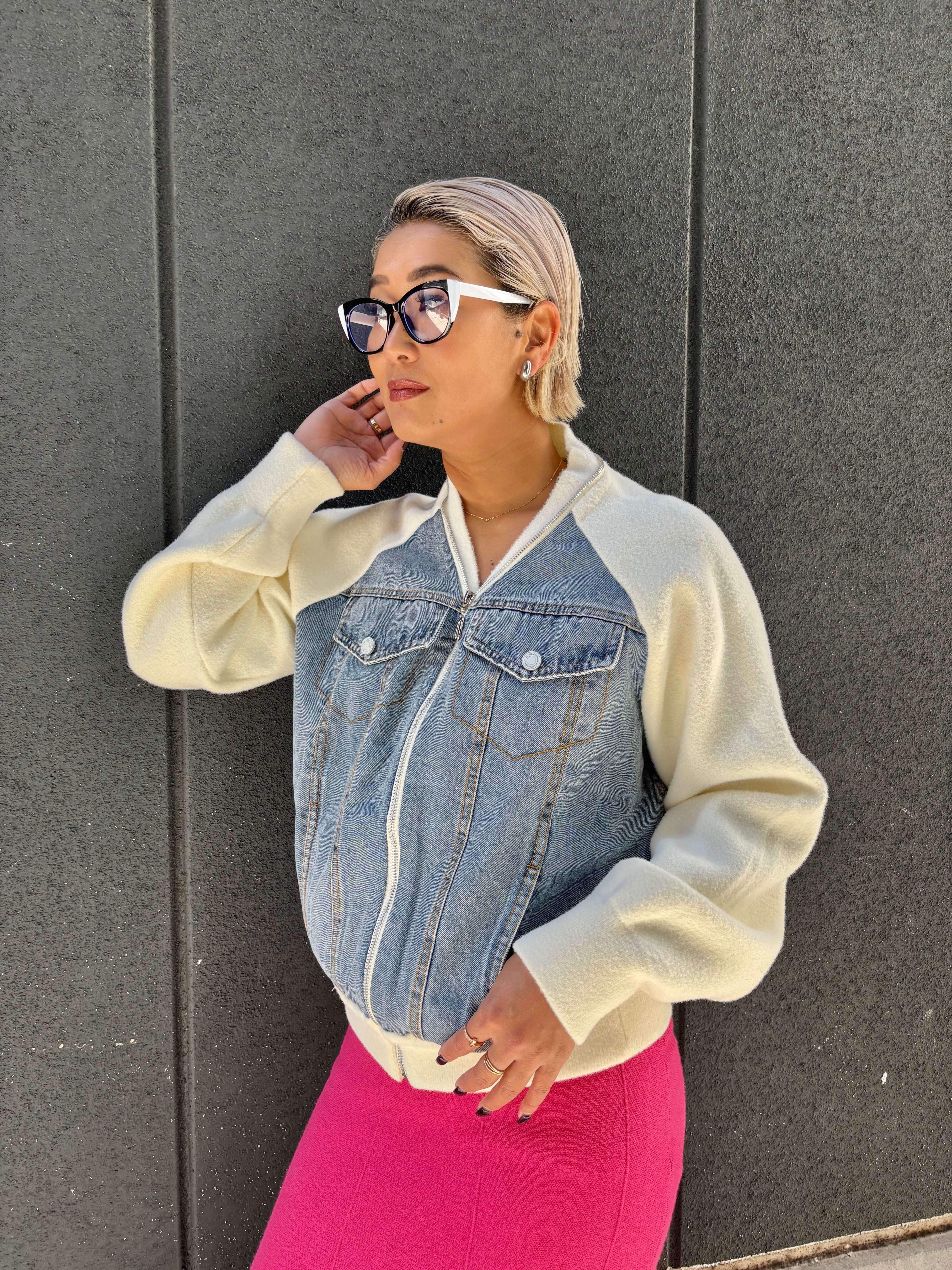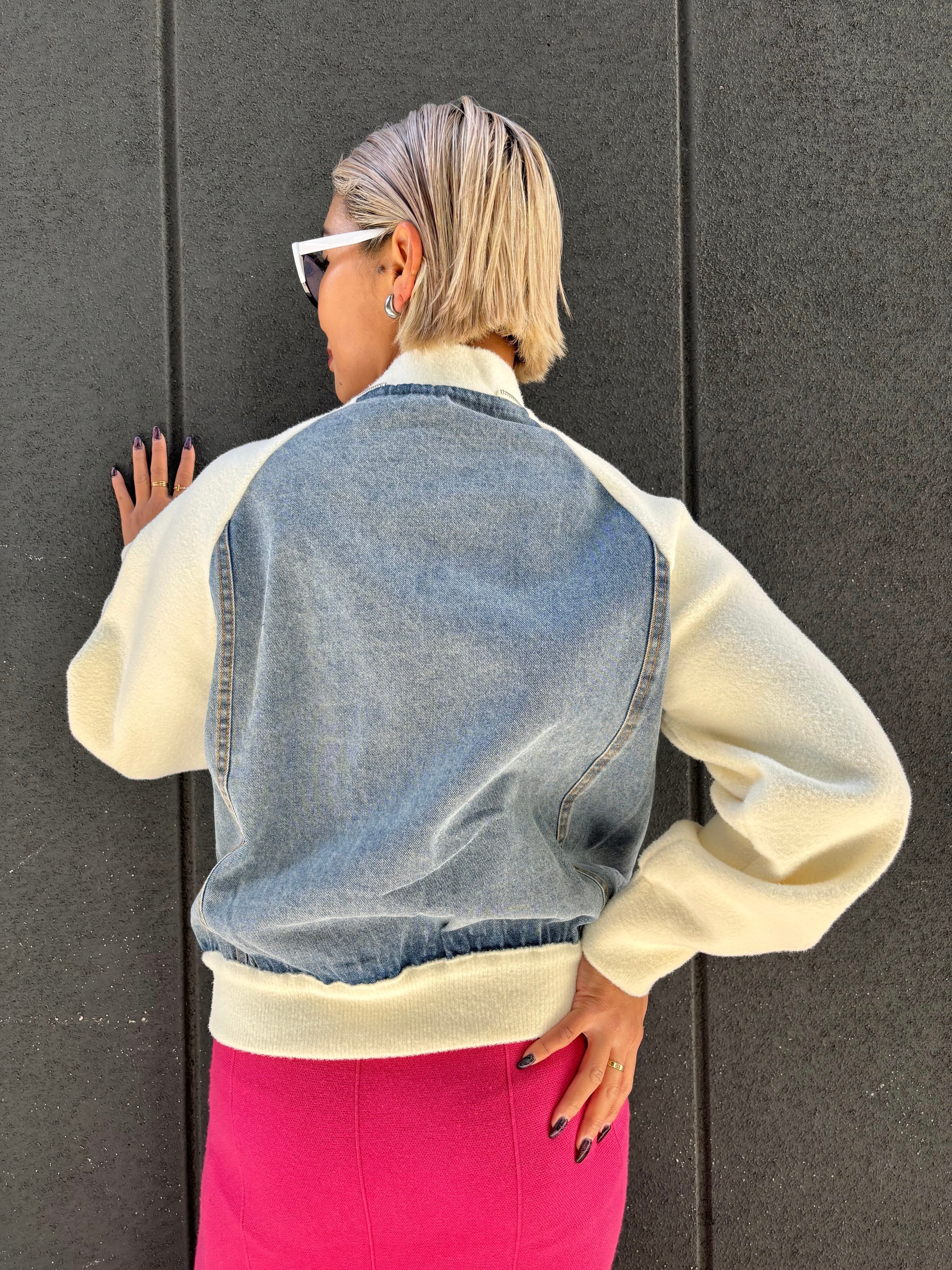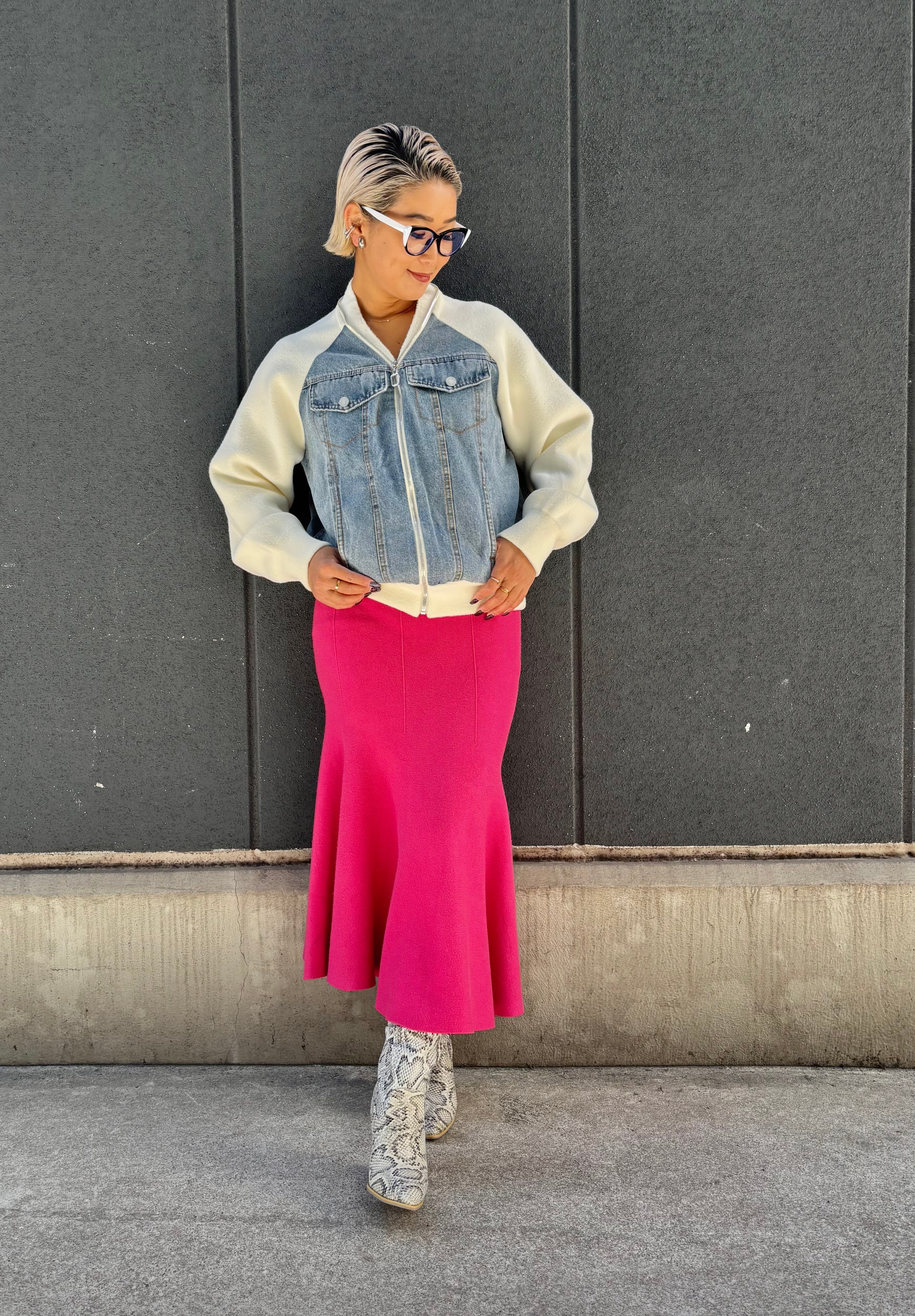 デニムと圧縮ニットの切り替えデザインが魅力的で、どんなシーンでも活躍するアイテムです。
