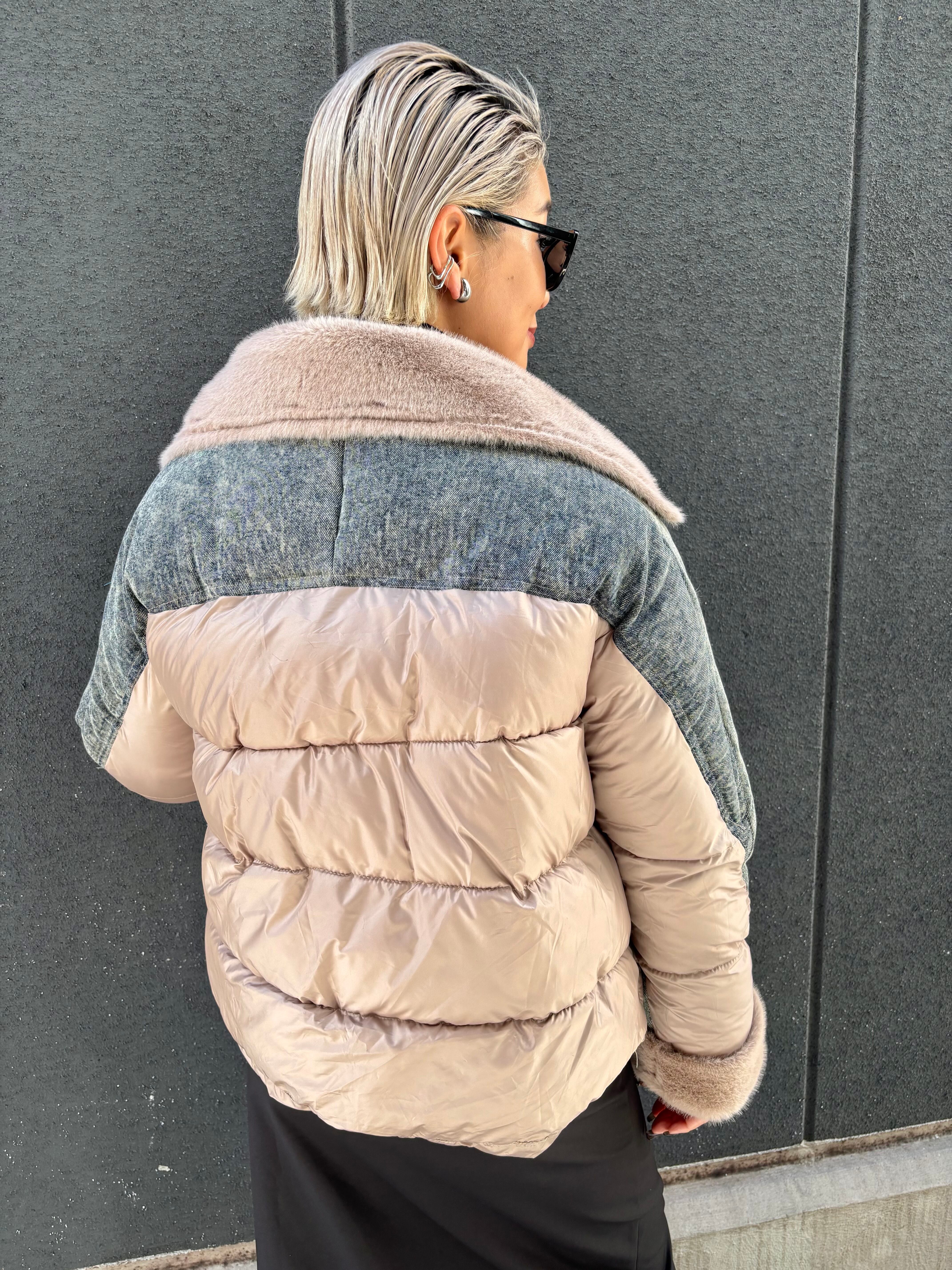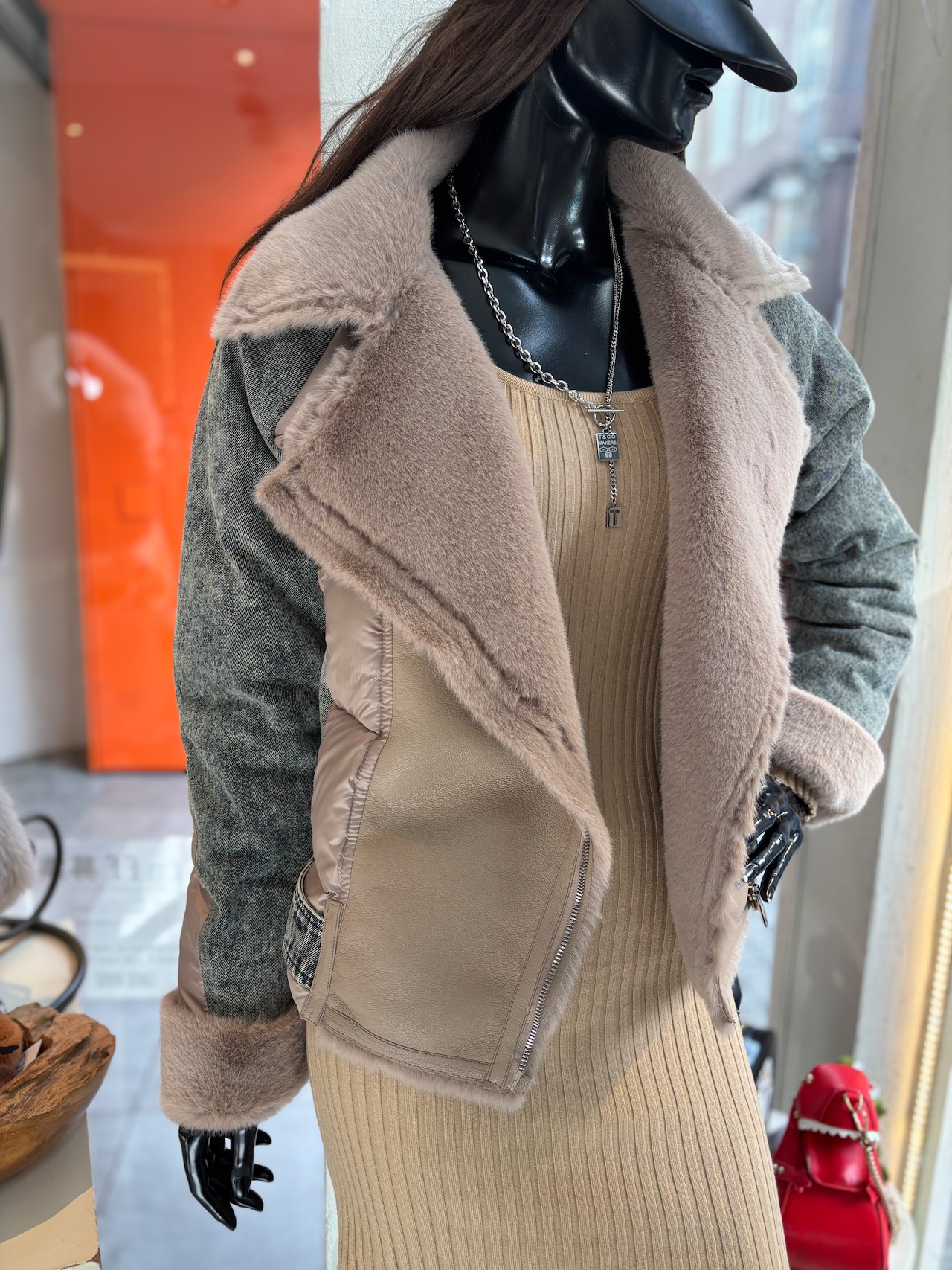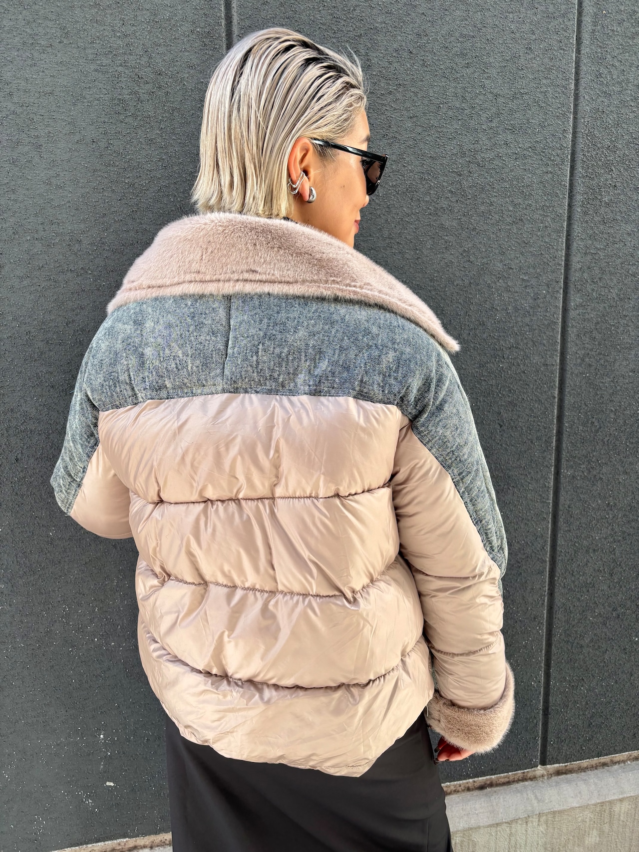 異素材を巧みにミックスしたデザインが特徴のジャケット。中綿入りで、寒い季節でもしっかりとした暖かさを提供します。ファー、デニム、そしてエコレザーの切り替えデザインにより、スタイリッシュさと機能性を兼ね備えた一着に仕上がっています。ライトな着心地でありながら、しっかりとした防寒性を持つこのジャケットは、普段使いからお出かけまで幅広く活躍します。